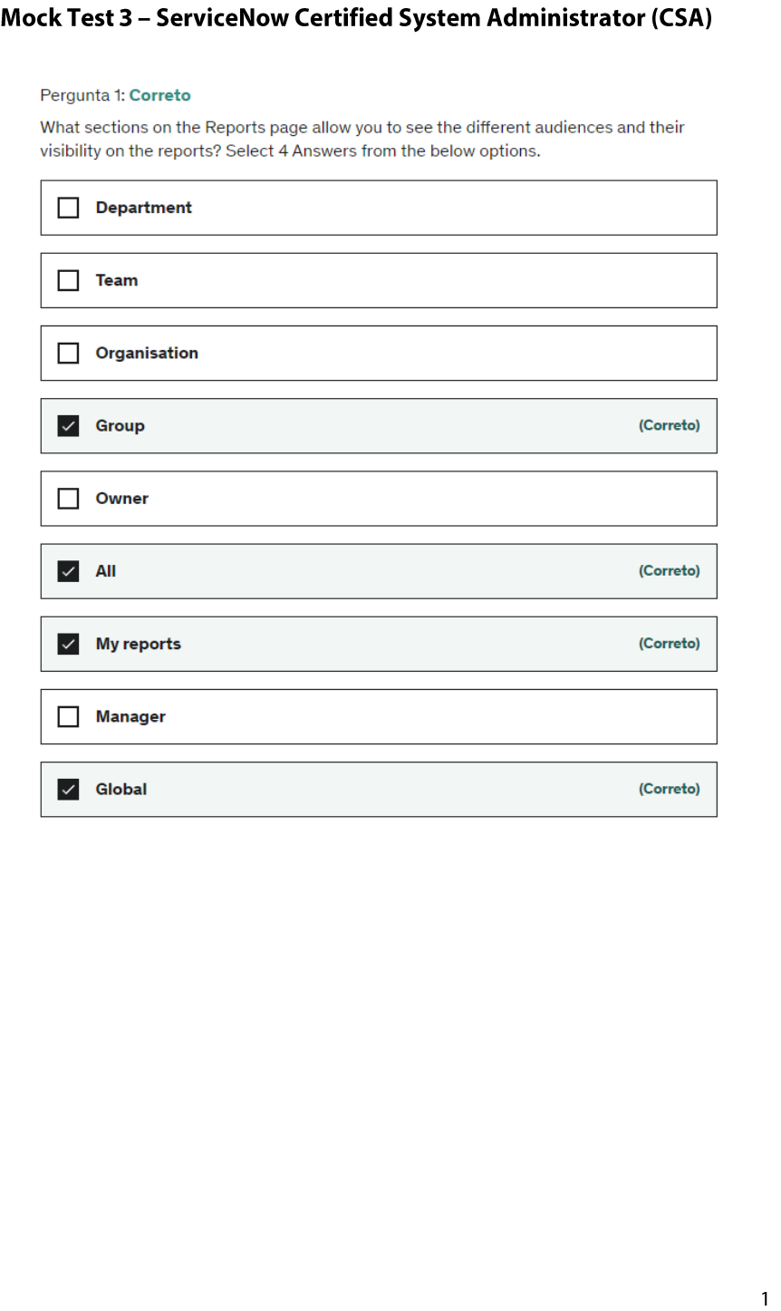 Mock Test 3 - ServiceNow Certified System Administrator (CSA) Pergunta 1: Correto What sections on the Reports page allow you to see the different audiences and their visibility on the reports? Select 4 Answers from the below options. Department Team Organisation Group (Correto) Owner All (Correto) My reports (Correto) Manager Global (Correto) 1Explicação You can view a list of reports and create reports from the Reports list. You can sort and filter the search results using the standard report list controls, such as by clicking tabs, column headings, or the favorites icon. You can also select the gear icon next to the 'Create a report' button to configure the columns displayed in the Reports list. You can filter the Reports list based on the audiences with the following tabs: My reports: Reports that you created. Group: Reports that have been shared with you and with the groups that you are a member of. Global: Reports that are available to everyone. All: All reports that you have access to (Global, Group, and My reports). Screenshot: Different sections on the Reports page based on the audiences servicenow Training Global reports Reports Group Global Search Type Title Table Scheduled Published Active HR Cases HR Case core Configuration Active HR Cases Table by Topic Category HR Case [sn core Service Catalog Reports 42 Approvals Requested Approval [sysapproval Reports Case Satisfaction Survey 30 Days AVG Metric Result metric Getting Started Run 42 Cases Awaiting Approval Approval _approver Create New Cases Priority HR Case [sn_hr_core_case] Scheduled Reports Import Tables Certifications Assigned Certification Task task Header Footer Templates 42 High Priority HR Case hr core case) Learn more here! 2Pergunta 2: Correto What wildcard character is used to search for values that contain a search-term in a list? % (Percent sign) = (Equal sign) ! (Exclamation mark) * (Asterisk) (Correto) Explicação Using the asterisk wildcard tells the system to return records where our search term appears anywhere in the string. A percent sign in the beginning or the end of a search term searches for values that start or end with that search term. An equal sign search for values that equal search-term. An exclamation mark in conjunction with another wildcard character search for values that do not match (e.g. !* for do not contain, != for do not equal). Screenshot: Searching for a keyword using the asterisk wildcard C Learn more here! 3Pergunta 3: Correto (Rome) What notification actions can be accepted in provider notification definitions? Select 3 Answers from the below options. Scriptable Actions (Correto) Flow Actions (Correto) Conditional Actions Virtual Agent (Correto) Explicação You can enable provider notification definitions to accept actions as scriptable action, flow actions, and Virtual Agent. You can select one of the following types of notification actions you would like to create from the Notification Action wizard. * Scriptable Action * Flow Action * Virtual Agent Screenshot: The Actions related list which displays the Class of a particular action Notification Actions New Provider Action Search Name Search 1 to of 3 All Name A Class Created by Search Search Search Approve Notification Action admin Create Outage Notification Flow Action admin Decline Notification Action admin 1 to of 3 Learn more here! 4Pergunta 4: Correto What types of permissions can be configured in an access control rule? Select 3 Answers from the below options. Conditions (Correto) Script that sets the 'answer' variable to true or false (Correto) Groups Roles (Correto) Users Explicação Rules for access control lists (ACLs) restrict access to data by requiring users to pass a set of requirements before interacting with it. An ACL rule only grants a user access to an object if the user meets all of the matching ACL rule's permissions. 1) The condition must evaluate to true. 2) The script must evaluate to true or return an answer variable with the value of true. 3) The user must have one of the roles in the required roles list. If the list is empty, this condition evaluates to true. 4) [Record ACL rules only] The matching table-level and field-level ACL rules must both evaluate to true. In summary, Conditions, roles, and a script that sets the variable to true or false can be configured in an access control rule. 5Pergunta 5: Correto What allows you to see more information on the same screen real estate when using Visual Task Boards? Card Groups Compact Cards (Correto) Minimise Tasks Card Thumbnails Explicação Compact Cards allows you to see more information in the same screen real estate when using Visual Task Boards. Compact Cards decreases the lane width and card information. Thumbnail images do not appear on the card in this mode. Screenshot: Enabling 'Show Compact Cards' on the Visual Task Board Configuration Learn more here! 6Pergunta 6: Correto How do you define conditions that are evaluated against users to determine which users can access catalogue items? Catalogue UI Policies [catalog_ui_policy] User criteria [user_criteria] (Correto) Catalogue Client Scripts [catalog_script_client] Service Catalogue Configuration / Properties [system_properties_servicecatalog_ui Explicação User Criteria [user_criteria] defines conditions evaluated against users to determine - which users can access catalogue items. Screenshot: Example of user criteria that is used to allow access to certain users Learn more here! 7Pergunta 7: Correto Which of the following would be included in the results when entering in the Navigation filter? Select 2 Answers from the below options. Only applications with a name containing 'service' Only applications, sections and modules with names containing 'service' All modules and sections within the Service Desk application (Correto) Any module with a name containing 'service' (Correto) Explicação Any applications, sections or modules with names containing 'service' (or other words containing 