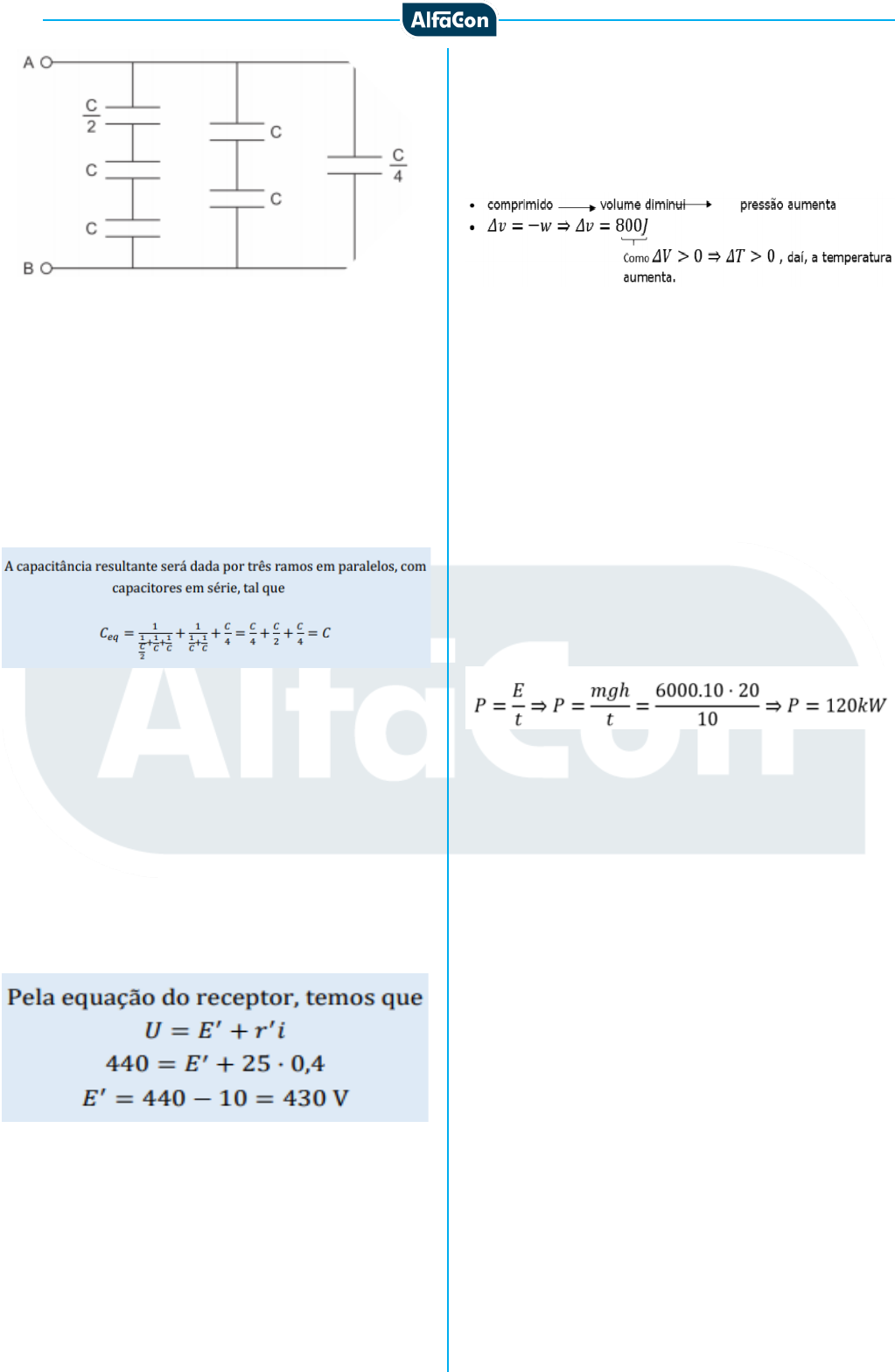 ESCOLA DE ESPECIALISTAS DE AERONÁUTICA DATA: 17/10/2021 22 79. Na associação de capacitores, esquematizada acima, a capaci- tância está indicada na figura para cada um dos capacitores. Assim, a capacitância equivalente, entre os pontos e no circuito, é: a) C b) 2C c) 3C d) 4C e) 8C Gabarito: A Comentário: 80. Um gerador fornece a um motor uma ddp de 440 V. O motor tem resistência interna de 25 Ω e é percorrido por uma corrente elétrica de 400 mA. A força contra-eletromotriz do motor, em volts, é igual a: a) 375 b) 400 c) 415 d) 430 e) 220 Gabarito: D Comentário: 81. Durante um experimento, um gás perfeito é comprimido, adiaba- ticamente, sendo realizado sobre ele um trabalho de 800 J. Em relação ao gás, ao final do processo, podemos afirmar que: a) O volume aumentou, a temperatura aumentou e a pressão aumentou b) O volume diminuiu, a temperatura diminuiu e a pressão aumentou c) O volume diminuiu, a temperatura aumentou e a pressão diminuiu d) O volume diminuiu, a temperatura aumentou e a pressão aumentou e) O volume aumentou, a temperatura aumentou e a pressão diminuiu Gabarito: D Comentário: 82. Um prédio em construção, de 20 m de altura, possui, na parte externa da obra, um elevador de carga com massa total de 6 ton, suspenso por um cabo inextensível e de massa desprezível. O elevador se desloca, com velocidade constante, do piso térreo até a altura de 20 m, em um intervalo de tempo igual a 10 s. Desprezando as forças dissipativas e considerando a intensidade da aceleração da gravidade igual a 10 m/s², podemos afirmar que a potência média útil desenvolvida por esse elevador é: a) 120 kW b) 180 kW c) 200 kW d) 360 kW e) 600 kW Gabarito: A Comentário: 83. Com relação às ondas, são feitas as seguintes afirmações: I. As ondas mecânicas propagam-se somente em meios materiais. II. As ondas eletromagnéticas propagam-se somente no vácuo. III. As micro-ondas são ondas que se propagam somente em meios materiais. Das afirmações acima está(ão) correta(s) apenas a(s): a) I b) II c) I e III d) I e II e) II e III Gabarito: A Comentário: I. Correto. As ondas mecânicas propagam-se somente em meios materiais, pois necessitam de um meio material para se propagar, ou seja, sua propagação envolve o transporte de energia cinética e potencial e depende da elasticidade do meio. Por isto não é capaz de propagar-se no vácuo. II. Errado. As ondas eletromagnéticas podem se propagar com ou sem meios materiais. III. Errado. Micro-ondas são exemplos de ondas eletromagnéticas, logo, se propagam com ou sem meios materiais. 84. Um motor tem uma potência total igual a 1500 W e eleva de 15 m um volume de 9∙104 L de água de um poço artesiano durante 5