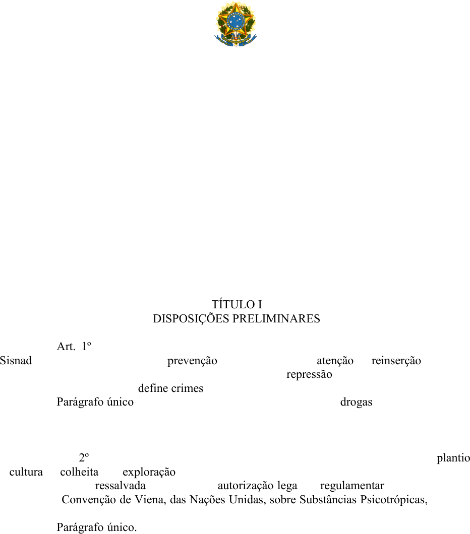 CÂMARA DOS DEPUTADOS Centro de Documentação e Informação LEI Nº 11.343, DE 23 DE AGOSTO DE 2006 Institui o Sistema Nacional de Políticas Públicas sobre Drogas - Sisnad; prescreve medidas para prevenção do uso indevido, atenção e reinserção social de usuários e dependentes de drogas; estabelece normas para repressão à produção não autorizada e ao tráfico ilícito de drogas; define crimes e dá outras providências. O PRESIDENTE DA REPÚBLICA Faço saber que o Congresso Nacional decreta e eu sanciono a seguinte Lei: TÍTULO I DISPOSIÇÕES PRELIMINARES Art. 1º Esta Lei institui o Sistema Nacional de Políticas Públicas sobre Drogas - Sisnad; prescreve medidas para prevenção do uso indevido, atenção e reinserção social de usuários e dependentes de drogas; estabelece normas para repressão à produção não autorizada e ao tráfico ilícito de drogas e define crimes. Parágrafo único. Para fins desta Lei, consideram-se como drogas as substâncias ou os produtos capazes de causar dependência, assim especificados em lei ou relacionados em listas atualizadas periodicamente pelo Poder Executivo da União. Art. 2º Ficam proibidas, em todo o território nacional, as drogas, bem como o plantio, a cultura, a colheita e a exploração de vegetais e substratos dos quais possam ser extraídas ou produzidas drogas, ressalvada a hipótese de autorização legal ou regulamentar, bem como o que estabelece a Convenção de Viena, das Nações Unidas, sobre Substâncias Psicotrópicas, de 1971, a respeito de plantas de uso estritamente ritualístico-religioso. Parágrafo único. Pode a União autorizar o plantio, a cultura e a colheita dos vegetais referidos no caput deste artigo, exclusivamente para fins medicinais ou científicos, em local e prazo predeterminados, mediante fiscalização, respeitadas as ressalvas supramencionadas. TÍTULO II DO SISTEMA NACIONAL DE POLÍTICAS PÚBLICAS SOBRE DROGAS heros Destacar heros Destacar heros Destacar heros Retângulo heros Destacar heros Destacar heros Destacar heros Destacar heros Destacar heros Destacar heros Destacar heros Destacar heros Destacar heros Destacar heros Destacar heros Destacar heros Destacar heros Destacar heros Destacar heros Destacar heros Destacar heros Destacar Art. 3º O Sisnad tem a finalidade de articular, integrar, organizar e coordenar as atividades relacionadas com: I - a prevenção do uso indevido, a atenção e a reinserção social de usuários e dependentes de drogas; II - a repressão da produção não autorizada e do tráfico ilícito de drogas. CAPÍTULO I DOS PRINCÍPIOS E DOS OBJETIVOS DO SISTEMA NACIONAL DE POLÍTICAS PÚBLICAS SOBRE DROGAS Art. 4º São princípios do Sisnad: I - o respeito aos direitos fundamentais da pessoa humana, especialmente quanto à sua autonomia e à sua liberdade; II - o respeito à diversidade e às especificidades populacionais existentes; III - a promoção dos valores éticos, culturais e de cidadania do povo brasileiro, reconhecendo-os como fatores de proteção para o uso indevido de drogas e outros comportamentos correlacionados; IV - a promoção de consensos nacionais, de ampla participação social, para o estabelecimento dos fundamentos e estratégias do Sisnad; V - a promoção da responsabilidade compartilhada entre Estado e Sociedade, reconhecendo a importância da participação social nas atividades do Sisnad; VI - o reconhecimento da intersetorialidade dos fatores correlacionados com o uso indevido de drogas, com a sua produção não autorizada e o seu tráfico ilícito; VII - a integração das estratégias nacionais e internacionais de prevenção do uso indevido, atenção e reinserção social de usuários e dependentes de drogas e de repressão à sua produção não autorizada e ao seu tráfico ilícito; VIII - a articulação com os órgãos do Ministério Público e dos Poderes Legislativo e Judiciário visando à cooperação mútua nas atividades do Sisnad; IX - a adoção de abordagem multidisciplinar que reconheça a interdependência e a natureza complementar das atividades de prevenção do uso indevido, atenção e reinserção social de usuários e dependentes de drogas, repressão da produção não autorizada e do tráfico ilícito de drogas; X - a observância do equilíbrio entre as atividades de prevenção do uso indevido, atenção e reinserção social de usuários e dependentes de drogas e de repressão à sua produção não autorizada e ao seu tráfico ilícito, visando a garantir a estabilidade e o bem-estar social; XI - a observância às orientações e normas emanadas do Conselho Nacional Antidrogas - Conad. Art. 5º O Sisnad tem os seguintes objetivos: I - contribuir para a inclusão social do cidadão, visando a torná-lo menos vulnerável a assumir comportamentos de risco para o uso indevido de drogas, seu tráfico ilícito e outros comportamentos correlacionados; II - promover a construção e a socialização do conhecimento sobre drogas no país; III - promover a integração entre as políticas de prevenção do uso indevido, atenção e reinserção social de usuários e dependentes de drogas e de repressão à sua produção não autorizada e ao tráfico ilícito e as políticas públicas setoriais dos órgãos do Poder Executivo da União, Distrito Federal, Estados e Municípios; IV - assegurar as condições para a coordenação, a integração e a articulação das atividades de que trata o art. 3º desta Lei. CAPÍTULO II DA COMPOSIÇÃO E DA ORGANIZAÇÃO DO SISTEMA NACIONAL DE POLÍTICAS PÚBLICAS SOBRE DROGAS Art. 6º ( VETADO) Art. 7º A organização do Sisnad assegura a orientação central e a execução descentralizada das atividades realizadas em seu âmbito, nas esferas federal, distrital, estadual e municipal e se constitui matéria definida no regulamento desta Lei. Art. 8º ( VETADO) CAPÍTULO III (VETADO) Art. 9º ( VETADO) Art. 10. (VETADO) Art. 11. (VETADO) Art. 12. (VETADO) Art. 13. (VETA