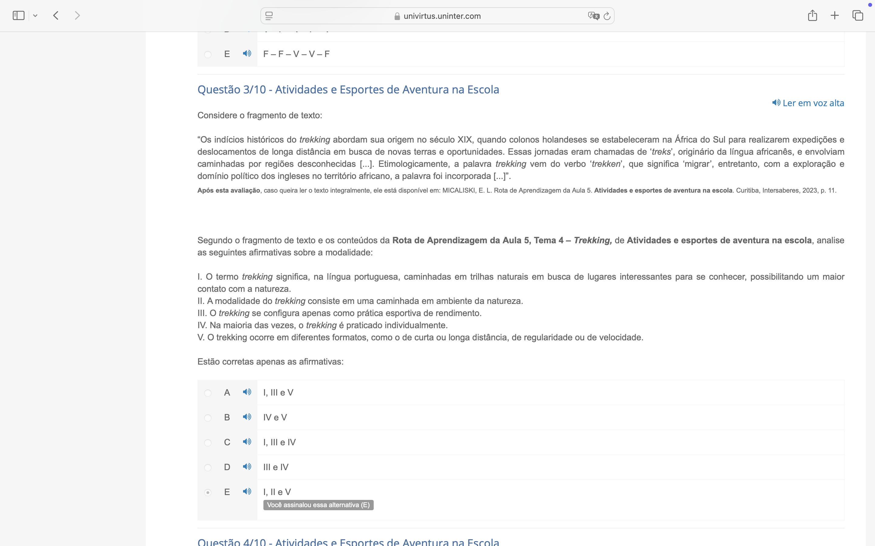 univirtus.uninter.com + E Questão 3/10 Atividades e Esportes de Aventura na Escola Ler em voz alta Considere o fragmento de texto: "Os indícios históricos do trekking abordam sua origem no século XIX, quando colonos holandeses se estabeleceram na África do Sul para realizarem expedições e deslocamentos de longa distância em busca de novas terras e oportunidades. Essas jornadas eram chamadas de 'treks', originário da língua africanês, e envolviam caminhadas por regiões desconhecidas [...]. Etimologicamente, a palavra trekking vem do verbo que significa 'migrar', entretanto, com a exploração e domínio político dos ingleses no território africano. a palavra foi incorporada [...]". Após esta avaliação, caso queira ler o texto integralmente, ele está disponível em: MICALISKI, E. L. Rota de Aprendizagem da Aula 5. Atividades e esportes de aventura na escola. Curitiba, Intersaberes, 2023, p. 11. Segundo o fragmento de texto e os conteúdos da Rota de Aprendizagem da Aula 5, Tema 4 - Trekking, de Atividades e esportes de aventura na escola, analise as seguintes afirmativas sobre a modalidade: I. o termo trekking significa, na língua portuguesa, caminhadas em trilhas naturais em busca de lugares interessantes para se conhecer, possibilitando um maior contato com a natureza. II. A modalidade do trekking consiste em uma caminhada em ambiente da natureza. III. o trekking se configura apenas como prática esportiva de rendimento. IV. Na maioria das vezes, o trekking é praticado individualmente. V. trekking ocorre em diferentes formatos, como o de curta ou longa distância, de regularidade ou de velocidade. Estão corretas apenas as afirmativas: A I, III e V B IV e V C I, III e IV D III e IV E e V Você assinalou essa alternativa (E) 4/10 Atividades e Esportes de Aventura na Escola