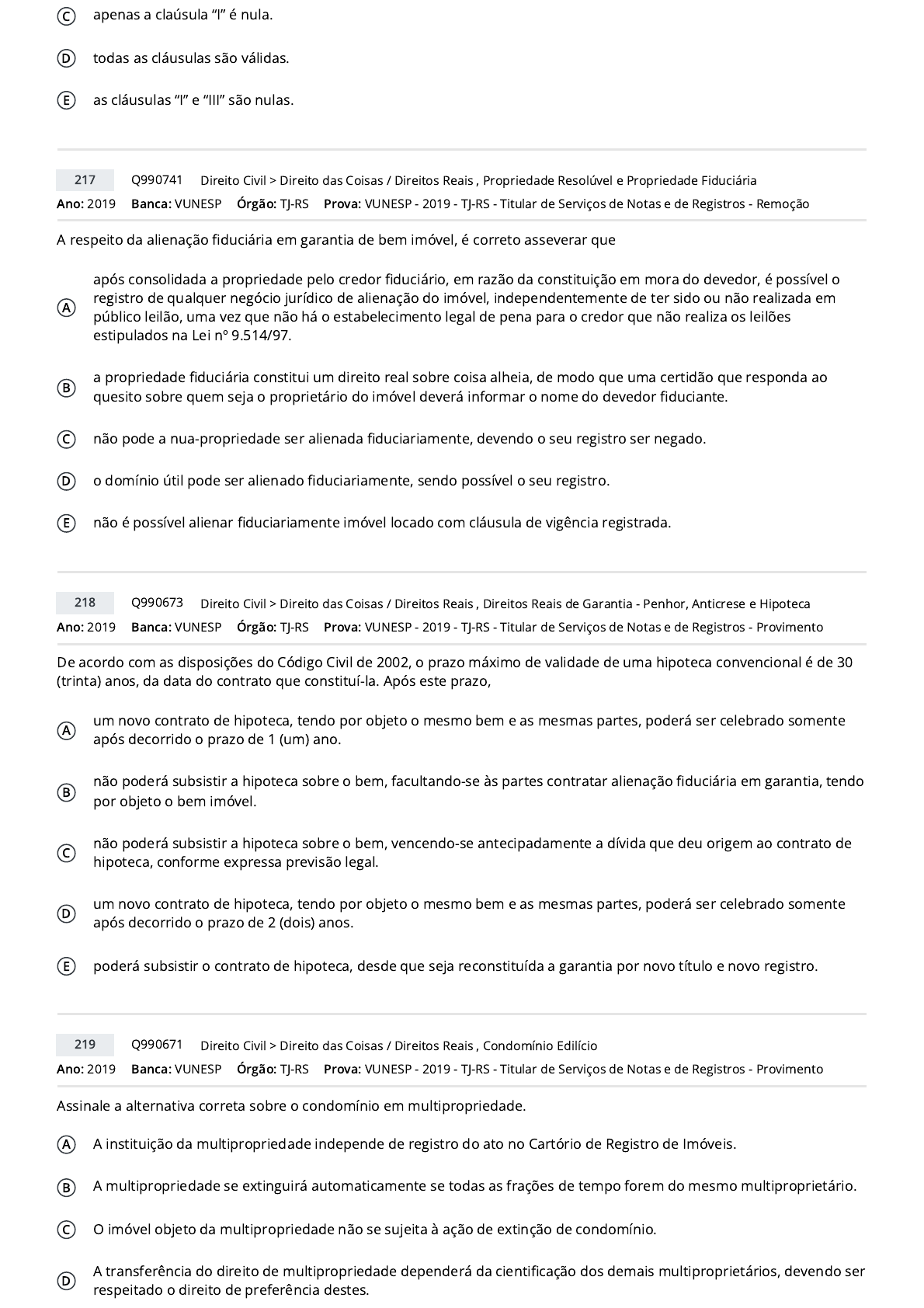 C apenas a claúsula “I” é nula. D todas as cláusulas são válidas. E as cláusulas “I” e “III” são nulas. Ano: 2019 Banca: VUNESP Órgão: TJ-RS A respeito da alienação �duciária em garantia de bem imóvel, é correto asseverar que A após consolidada a propriedade pelo credor �duciário, em razão da constituição em mora do devedor, é possível o registro de qualquer negócio jurídico de alienação do imóvel, independentemente de ter sido ou não realizada em público leilão, uma vez que não há o estabelecimento legal de pena para o credor que não realiza os leilões estipulados na Lei nº 9.514/97. B a propriedade �duciária constitui um direito real sobre coisa alheia, de modo que uma certidão que responda ao quesito sobre quem seja o proprietário do imóvel deverá informar o nome do devedor �duciante. C não pode a nua-propriedade ser alienada �duciariamente, devendo o seu registro ser negado. D o domínio útil pode ser alienado �duciariamente, sendo possível o seu registro. E não é possível alienar �duciariamente imóvel locado com cláusula de vigência registrada. Ano: 2019 Banca: VUNESP Órgão: TJ-RS De acordo com as disposições do Código Civil de 2002, o prazo máximo de validade de uma hipoteca convencional é de 30 (trinta) anos, da data do contrato que constituí-la. Após este prazo, A um novo contrato de hipoteca, tendo por objeto o mesmo bem e as mesmas partes, poderá ser celebrado somente após decorrido o prazo de 1 (um) ano. B não poderá subsistir a hipoteca sobre o bem, facultando-se às partes contratar alienação �duciária em garantia, tendo por objeto o bem imóvel. C não poderá subsistir a hipoteca sobre o bem, vencendo-se antecipadamente a dívida que deu origem ao contrato de hipoteca, conforme expressa previsão legal. D um novo contrato de hipoteca, tendo por objeto o mesmo bem e as mesmas partes, poderá ser celebrado somente após decorrido o prazo de 2 (dois) anos. E poderá subsistir o contrato de hipoteca, desde que seja reconstituída a garantia por novo título e novo registro. Ano: 2019 Banca: VUNESP Órgão: TJ-RS Assinale a alternativa correta sobre o condomínio em multipropriedade. A A instituição da multipropriedade independe de registro do ato no Cartório de Registro de Imóveis. B A multipropriedade se extinguirá automaticamente se todas as frações de tempo forem do mesmo multiproprietário. C O imóvel objeto da multipropriedade não se sujeita à ação de extinção de condomínio. D A transferência do direito de multipropriedade dependerá da cienti�cação dos demais multiproprietários, devendo ser respeitado o direito de preferência destes. 217 Q990741 >Direito Civil Direito das Coisas / Direitos Reais , Propriedade Resolúvel e Propriedade Fiduciária Prova: VUNESP - 2019 - TJ-RS - Titular de Serviços de Notas e de Registros - Remoção 218 Q990673 >Direito Civil Direito das Coisas / Direitos Reais , Direitos Reais de Garantia - Penhor, Anticrese e Hipoteca Prova: VUNESP - 2019 - TJ-RS - Titular de Serviços de Notas e de Registros - Provimento 219 Q990671 >Direito Civil Direito das Coisas / Direitos Reais , Condomínio Edilício Prova: VUNESP - 2019 - TJ-RS - Titular de Serviços de Notas e de Registros - Provimento https://www.qconcursos.com/questoes-de-concursos/bancas/vunesp https://www.qconcursos.com/questoes-de-concursos/institutos/tj-rs https://www.qconcursos.com/questoes-de-concursos/bancas/vunesp https://www.qconcursos.com/questoes-de-concursos/institutos/tj-rs https://www.qconcursos.com/questoes-de-concursos/bancas/vunesp https://www.qconcursos.com/questoes-de-concursos/institutos/tj-rs https://www.qconcursos.com/questoes-de-concursos/questoes/8d765349-76 https://www.qconcursos.com/questoes-de-concursos/disciplinas/direito-direito-civil https://www.qconcursos.com/questoes-de-concursos/disciplinas/direito-direito-civil/direito-das-coisas-direitos-reais https://www.qconcursos.com/questoes-de-concursos/disciplinas/direito-direito-civil/propriedade-resoluvel-e-propriedade-fiduciaria https://www.qconcursos.com/questoes-de-concursos/provas/vunesp-2019-tj-rs-titular-de-servicos-de-notas-e-de-registros-remocao https://www.qconcursos.com/questoes-de-concursos/questoes/4a1b264b-76 https://www.qconcursos.com/questoes-de-concursos/disciplinas/direito-direito-civil https://www.qconcursos.com/questoes-de-concursos/disciplinas/direito-direito-civil/direito-das-coisas-direitos-reais https://www.qconcursos.com/questoes-de-concursos/disciplinas/direito-direito-civil/direitos-reais-de-garantia-penhor-anticrese-e-hipoteca https://www.qconcursos.com/questoes-de-concursos/provas/vunesp-2019-tj-rs-titular-de-servicos-de-notas-e-de-registros-provimento https://www.qconcursos.com/questoes-de-concursos/questoes/4a12922a-76 https://www.qconcursos.com/questoes-de-concursos/disciplinas/direito-direito-civil https://www.qconcursos.com/questoes-de-concursos/disciplinas/direito-direito-civil/direito-das-coisas-direitos-reais https://www.qconcursos.com/questoes-de-concursos/disciplinas/direito-direito-civil/condominio-edilicio https://www.qconcursos.com/questoes-de-concursos/provas/vunesp-2019-tj-rs-titular-de-servicos-de-notas-e-de-registros-provimento