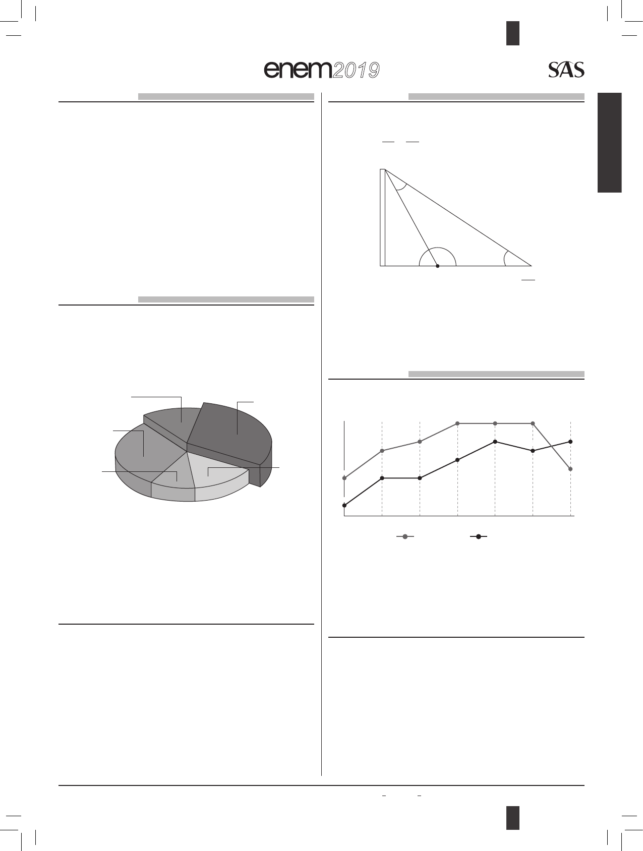 MT – 2o dia | 2o Simulado SAS ENEM – Página 19 2019 QUESTÃO 142 Quatro pacotes de biscoitos contendo doze unidades cada foram abertos e despejados dentro de um pote. Dentre os quatro pacotes, havia dois de chocolate, um de morango e um de limão. Uma criança deseja retirar, ao acaso, biscoitos do pote e levá-los consigo, mas quer se certificar de que comerá, pelo menos, seis biscoitos de chocolate. O número mínimo de biscoitos que essa criança deve retirar é A 6. B 18. C 24. D 30. E 48. QUESTÃO 143 Um evento contou com a participação de 2 400 executivos de vários estados brasileiros, como Ceará, Maranhão, São Paulo, Minas Gerais e Rio de Janeiro. A organização do evento construiu um gráfico, em que a medida do ângulo de cada setor é proporcional ao número de participantes do estado correspondente. Maranhão (45°) Minas Gerais (120°) Ceará (60°) São Paulo (110°) Rio de Janeiro (25°) Dentre os estados da Região Sudeste, aquele que possui a maior participação contou com a presença de quantos participantes no evento? A 166 B 300 C 400 D 733 E 800 QUESTÃO 144 Uma pessoa instalou um poste onde colocará uma luminária para melhorar a iluminação de parte do terreno de sua chácara. O poste foi fixado e será sustentado por dois cabos, PA e PB. 25° 80° – x A BQ P 70° + 3x O ângulo formado entre o chão e o cabo PB é de A 15°. B 40°. C 65°. D 85°. E 90°. QUESTÃO 145 O gráfico a seguir mostra as despesas e o rendimento de uma empresa em milhares de reais. Janeiro Fevereiro Março Abril Maio Junho Julho 45 65 75 50 55 60 65 70 75 80 85 90 DespesaRendimento 80 75 80 90 90 90 80 70 6060 45 60 Essa empresa apresentou o maior lucro em A abril, apenas. B junho, apenas. C julho, apenas. D março e abril. E abril, maio e junho. 04_2019_2oENEM_MT.indd 19 29/01/2019 11:12:02