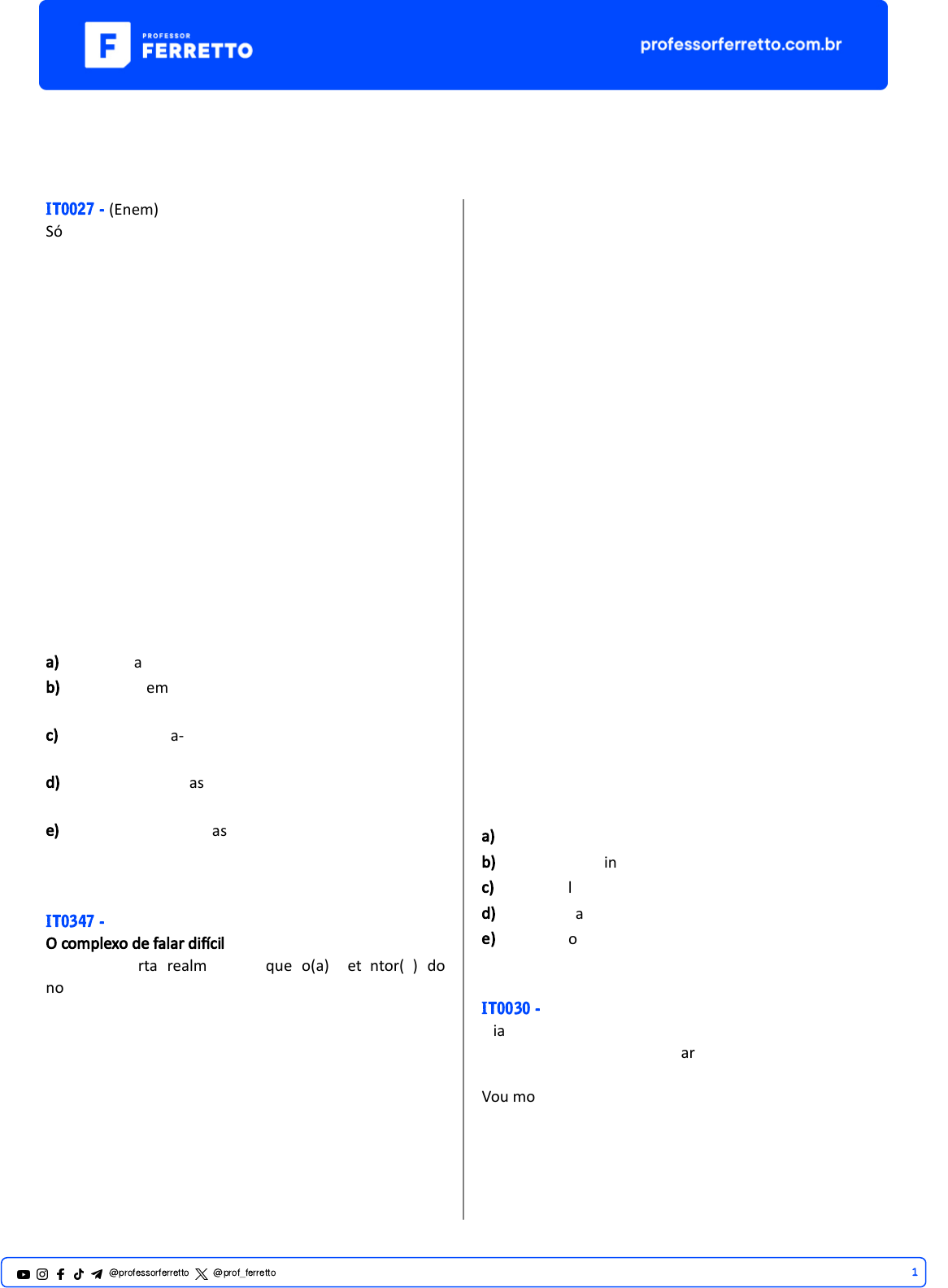 Teoria da Comunicação IT0027 - (Enem) Só há uma saída para a escola se ela quiser ser mais bem- sucedida: aceitar a mudança da língua como um fato. Isso deve significar que a escola deve aceitar qualquer forma da língua em suas a�vidades escritas? Não deve mais corrigir? Não! Há outra dimensão a ser considerada: de fato, no mundo real da escrita, não existe apenas um português correto, que valeria para todas as ocasiões: o es�lo dos contratos não é o mesmo do dos manuais de instrução; o dos juízes do Supremo não é o mesmo do dos cordelistas; o dos editoriais dos jornais não é o mesmo do dos cadernos de cultura dos mesmos jornais. Ou do de seus colunistas. POSSENTI, S. “Gramá�ca na cabeça”. Língua Portuguesa, ano 5, n. 67, maio 2011 (adaptado). Sírio Possen� defende a tese de que não existe um único "português correto". Assim sendo, o domínio da língua portuguesa implica, entre outras coisas, saber a) descartar as marcas de informalidade do texto. b) reservar o emprego da norma-padrão aos textos de circulação ampla. c) moldar a norma-padrão do português pela linguagem do discurso jornalís�co. d) adequar as formas da língua a diferentes �pos de texto e contexto. e) desprezar as formas da língua previstas pelas gramá�cas e manuais divulgados pela escola. IT0347 - (Enem) O complexo de falar di�cil O que importa realmente é que o(a) detentor(a) do notável saber jurídico saiba quando e como deve fazer uso desse português versão 2.0, até porque não tem necessidade de alguém entrar numa padaria de manhã com aquela cara de sono falando o seguinte: “Por obséquio, Vossa Senhoria teria a hipoté�ca possibilidade de estabelecer com minha pessoa uma relação de compra e venda, mediante as imposições dos códigos Civil e do Consumidor, para que seja possível a obtenção de 10 pãezinhos em temperatura estável para que a relação pecuniária no valor de R$ 5,00 seja plenamente legí�ma e capaz de saciar minha fome ma�nal?”. O problema é que temos uma cultura de valorizar quem demonstra ser inteligente ao invés de valorizar quem é. Pela nossa lógica, todo mundo que fala di�cil tende a ser mais inteligente do que quem valoriza o simples, e 99,9% das pessoas que es�vessem na padaria iriam ficar boquiabertas se alguém fizesse uso das palavras que eu disse acima em plenas 7 da manhã em vez de dizer: “Bom dia! O senhor poderia me vender cinco reais de pão francês?”. Agora entramos na parte interessante: o que realmente é falar di�cil? Simplesmente fazer uso de palavras que a maioria não faz ideia do que seja é um ato de falar di�cil? Eu penso que não, mas é assim que muita gente age. Falar di�cil é fazer uso do simples, mas com coerência e coesão, deixar tudo amarradinho grama�calmente falando. Falar di�cil pode fazer alguém parecer inteligente, mas não por muito tempo. É claro que em alguns momentos não temos como fugir do português rebuscado, do juridiquês propriamente dito, como no caso de documentos jurídicos, entre outros. ARAÚJO, H. Disponível em: www.diariojurista.com. Acesso em: 20 nov. 2021 (adaptado). Nesse ar�go de opinião, ao fazer uso de uma fala rebuscada no exemplo da compra do pão, o autor evidencia a importância de(a) a) se ter um notável saber jurídico. b) valorização da inteligência do falante. c) falar di�cil para demonstrar inteligência. d) coesão e da coerência em documentos jurídicos. e) adequação da linguagem à situação de comunicação. IT0030 - (Enem) Óia eu aqui de novo xaxando Óia eu aqui de novo para xaxar Vou mostrar pr'esses cabras Que eu ainda dou no couro Isso é um desaforo Que eu não posso levar Que eu aqui de novo cantando Que eu aqui de novo xaxando 1@professorferretto @prof_ferretto Óia eu aqui de novo mostrando Como se deve xaxar Vem cá morena linda Ves�da de chita Você é a mais bonita Desse meu lugar Vai, chama Maria, chama Luzia Vai, chama Zabé, chama Raque Diz que eu tou aqui com alegria BARROS, A. Óia eu aqui de novo. Disponível em: www.Iuizluagonzaga.mus.br. Acesso em: 5 maio 2013 (fragmento). A letra da canção de Antônio de Barros manifesta aspectos do repertório linguís�co e cultural do Brasil. O verso que singulariza uma forma caracterís�ca do falar popular regional é: a) “Isso é um desaforo”. b) “Diz que eu tou aqui com alegria”. c) “Vou mostrar pr'esses cabras”. d) “Vai, chama Maria, chama Luzia”. e) “Vem cá morena linda, ves�da de chita”. IT0024 - (Enem) As narra�vas indígenas se sustentam e se perpetuam por uma tradição de transmissão oral (sejam as histórias verdadeiras dos seus antepassados, dos fatos e guerras recentes ou an�gos; sejam as histórias de ficção, como aquelas da onça e do macaco). De fato, as comunidades indígenas nas chamadas “terras baixas da América do Sul” (o que exclui as montanhas dos Andes, por exemplo) não desenvolveram sistemas de escrita como os que conhecemos, sejam alfabé�cos (como a escrita do português), sejam ideogramá�cos (como a escrita dos chineses) ou outros. Somente nas sociedades indígenas com estra�ficação social (ou seja, já divididas em classes), como foram os astecas e os maias, é que surgiu algum �po de escrita. A história da escrita parece mesmo mostrar claramente isso: que ela surge e se desenvolve - em qualquer das formas - apenas em sociedades estra�ficadas (sumérios, egípcios, chineses, gregos etc.). O fato é que os povos indígenas no Brasil, por exemplo, não empregavam um sistema de escrita, mas garan�ram a conservação e con�nuidade dos conhecimentos acumulados, das histórias passadas e, também, das narra�vas que sua tradição criou, através da transmissão oral. Todas as tecnologias indígenas se transmi�ram e se desenvolveram assim. E não foram poucas: por exemplo, foram os índios que domes�caram plantas silvestres e, muitas vezes, venenosas, criando o 