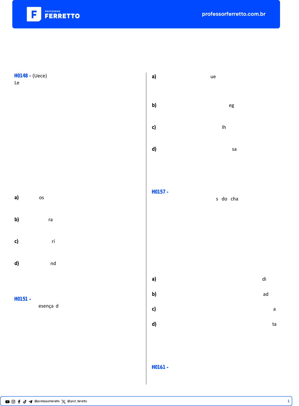 Brasil Colonial Capitanias, Economia e Escravidão H0148 - (Uece) Leia atentamente o seguinte trecho do Regimento de Feitor-mor de engenho: “O cas�go que se fizer ao escravo não há-de ser com pau nem �rar-lhe com pedras ou �jolos e quando o merecer o mandará botar sobre um carro e dar-se-lhe-á com um açoite seu cas�go; e, depois de bem açoitado, o mandará picar com navalha ou faca que corte bem e dar-se-lhe-á com sal, sumo de limão e urina e o meterá alguns dias na corrente. [...]” João Fernandes Vieira. Regimento de feitor-mor de engenho. Apud ALVES FILHO, Ivan. Brasil, 500 anos em documentos. Rio de Janeiro: Mauad Editora, 1999. Considerando o excerto acima e o conhecimento que se tem a respeito da escravidão no Brasil, é correto afirmar que a) os cas�gos a que o texto se refere configuram-se como exceção, pois, nessa época, a regra era a proibição de maus tratos �sicos aos escravos. b) o uso do trabalho escravo e a desvalorização do homem, implícita nele, não �veram impactos na sociedade brasileira atual. c) durante o período colonial e imperial brasileiro, o trabalho escravo foi a base da economia, razão pela qual era norma�zado. d) a escravidão indígena ou africana só era possível como forma de penalização a grupos que se revoltaram contra a coroa portuguesa. H0151 - (Uece) Sobre a presença de europeus, durante os séculos XVI, XVII e XVIII, no território que hoje pertence ao Brasil, é correto afirmar que a) se restringiu aos portugueses que, desde o Tratado de Tordesilhas, eram os únicos com direito sobre esta terra plenamente reconhecido pelas demais nações europeias. b) diferentemente de outras regiões da América, nenhuma das cidades do Brasil sofreu ataques de piratas ou corsários de origem europeia. c) devido ao Tratado de Tordesilhas, apenas portugueses e espanhóis es�veram pelas terras brasileiras durante os séculos de nossa colonização. d) além dos portugueses, em diversas regiões do atual território brasileiro, nos primeiros séculos da colônia, houve presenças de espanhóis, franceses e holandeses. H0157 - (C�rj) Os africanos foram trazidos do chamado con�nente negro para o Brasil em um fluxo de intensidade variável. Os cálculos sobre o número de pessoas transportadas como escravos variam muito. Es�ma-se que, entre 1550 e 1855, entraram pelos portos brasileiros 4 milhões de escravos, na sua grande maioria jovens do sexo masculino. (FAUSTO, Boris. História do Brasil. São Paulo: Ed. da Universidade de São Paulo, 1995. p. 51.) Entre as razões que jus�ficavam o tráfico negreiro estava: a) O desejo do colonizador em proteger o índio do trabalho escravo trazendo o Africano para subs�tuí-lo. b) Permi�r a livre concorrência entre trabalhadores indígenas e africanos para baratear a mão de obra. c) Possibilitar maior dinamismo comercial entre as colónias e os países europeus. d) A lógica de funcionamento da prá�ca mercan�lista, onde o tráfico ultramarino de escravos era um negócio relevante tanto para os comerciantes metropolitanos como para a coroa. H0161 - (U�pr) 1@professorferretto @prof_ferretto Se as especiarias dominaram o comércio marí�mo português durante o século XV, um século depois esse papel foi ocupado, no Brasil, pela produção açucareira, que abrangia a lavoura de cana propriamente dita e a fabricação do açúcar nos engenhos. Muitos historiadores denominam essa economia de planta�on, expressão emprestada dos ingleses para indicar as lavouras tropicais. Assinale a alterna�va que apresenta os três elementos nos quais esse �po de produção se fundamentava. a) La�fúndio, monocultura e mão de obra escrava. b) La�fúndio, policultura e mão de obra escrava. c) La�fúndio, monocultura e mão de obra livre. d) Minifúndio, monocultura e mão de obra escrava. e) Minifúndio, policultura e mão de obra livre H1189 - (Unesp) Estátuas famosas da cidade de São Paulo como a do bandeirante Borba Gato, em Santo Amaro, na Zona Sul, e a de Bartolomeu Bueno da Silva, no Parque Trianon, na Avenida Paulista, ganharam um “adereço macabro” nas úl�mas semanas. Com o obje�vo de ressignificar a história das figuras que elas representam, um grupo de manifestantes colocou caveiras em frente a essas estátuas e as fotografou. As fotos viralizaram nas redes sociais. Bandeirantes como Borba Gato desbravaram territórios no interior do país e capturaram e escravizaram indígenas e negros. Isso quando não os matavam em confrontos que acabaram por dizimar etnias, segundo historiadores. (Bárbara Muniz Vieira. “Crânios são colocados ao lado de monumentos de bandeirantes para ressignificar história de SP”. g1.globo.com, 27.10.2020. Adaptado.) Do ponto de vista histórico, a proposta de “ressignificar monumentos”, realizada pelo grupo, a) é uma transferência para a história e a historiografia da prá�ca de cancelamento de pessoas nas redes sociais. b) entende a função da história como celebração dos mitos e heróis do passado. c) representa uma análise crí�ca e um esforço de revisão da memória histórica. d) demonstra uma percepção o�mista e ufanista da iden�dade e do passado brasileiros. e) mostra clara descrença na história e a valorização do trabalho de ar�stas consagrados. H0182 - (Uece) Atente para o que disse o jesuíta André João Antonil sobre a escravidão no Brasil: “No Brasil, costumam dizer que para o escravo são necessários três PPP, a saber, pau, pão e pano. E, posto que comecem mal, principiando pelo cas�go que é o pau, contudo, prouvera a Deus que tão abundante fosse o comer e o ves�r como muitas vezes é o cas�go, dado por qualquer causa pouco provada, ou levantada; e com instrumentos de muito rigor(...), de que se não usa com os brutos animais, fazendo algum senhor mais caso de um cavalo que de meia dúzia de escravos...” ANTONIL, André João. Cultura e opulência do Brasil. 3. e