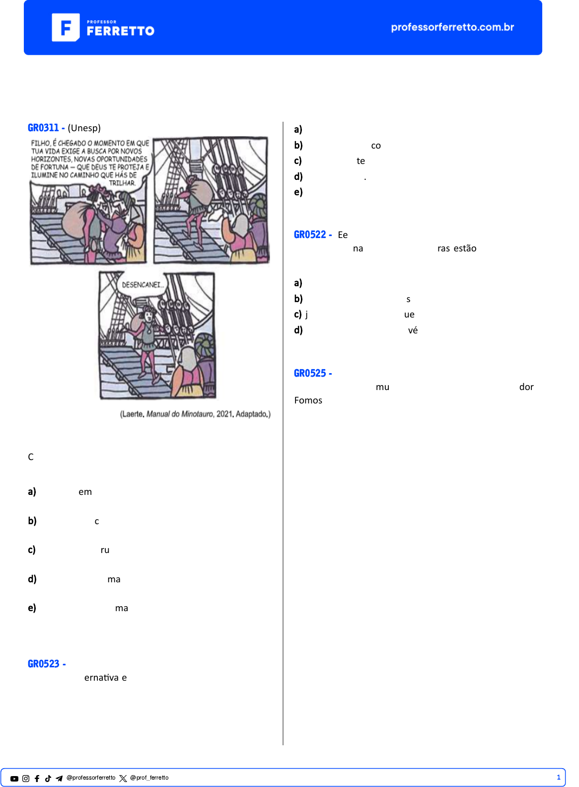 Ortografia GR0311 - (Unesp) Contribui para o efeito de humor da �rinha o contraste entre a) a linguagem hermé�ca do pai e a linguagem pedante do filho. b) a linguagem coloquial do pai e a linguagem concisa do filho. c) a linguagem erudita do pai e a linguagem enigmá�ca do filho. d) a linguagem formal do pai e a linguagem coloquial do filho. e) a linguagem informal do pai e a linguagem desleixada do filho. GR0523 - (Esa) Assinale a alterna�va em que os vocábulos obedecem às mesmas regras de acentuação gráfica das palavras “temá�ca” e “saúde”, respec�vamente: a) hífen, ó�mo. b) parabéns, mágico. c) médico, conteúdo. d) robó�ca, café. e) revólver, faísca. GR0522 - (Eear) Em qual alterna�va as três palavras estão corretamente acentuadas? a) faísca - moínho - juíz b) saímos - lençóis - pastéis c) juízo - amendoím - uísque d) heróico - chapéuzinho - véus GR0525 - (Uece) Padrão de beleza: mutante, mas sempre ao nosso redor Fomos ensinadas a agradar e a nos preocupar com a opinião alheia, a nos comportar de determinada maneira, a nos ves�r com roupas específicas, ter um �po de cabelo e por aí vai. Quando não seguimos a car�lha, algumas pessoas se sentem no direito de fazer 1comentários ou brincadeiras sobre nossas caracterís�cas �sicas sem ninguém ter pedido uma opinião. 2Ao longo dos anos, isso vai se internalizando em nós. Passamos a ver como problema algo que nem era uma questão, dando poder a palavras destru�vas. Bom, nós sabemos que mesmo racionalizando tudo isso, muitas vezes nos pegamos inseguras por não apresentarmos 3um conjunto de traços que sa�sfaçam essas expecta�vas. 4Por muito tempo, fomos ensinadas a agir dessa maneira. 5Quando não somos magras o suficiente ou temos estrias, nos culpamos e seguimos em busca de melhorar a todo custo. 6Entender essa dinâmica é o primeiro passo para construir uma mudança real e significa�va em nossas vidas. 7Se antes os grandes culpados eram os ensaios fotográficos e as campanhas publicitárias estampados nas revistas femininas, 8hoje somos bombardeadas por centenas de imagens. Facebook, Instagram e Pinterest estão aí para mostrar padrões de beleza corporal a todo o 1@professorferretto @prof_ferretto momento. Ou seja, o padrão de beleza imposto pela mídia agora também é encontrado nas redes sociais. Uma das maiores problemá�cas desse ambiente é que, mesmo dando preferência para seguir pessoas conhecidas, ainda há uma tenta�va constante, por parte de todas nós, de mostrarmos uma existência maravilhosa. São fotos e mais fotos de pessoas malhando loucamente, sem estrias ou sinais de celulite. E pensamos: por que não eu? 9Esse momento pode ser o mais perigoso porque gera muitas frustrações. 10Está tudo bem você querer perder uns quilinhos ou seguir um es�lo mais saudável, desde que seja uma escolha sua e com acompanhamento médico. E esse é o X da questão. Muitas vezes, queremos alcançar níveis surreais de magreza ou definição que não têm nada a ver com a gente. 11Começamos a perseguir uma vida que vemos em nosso feed, mas cujos bas�dores não conhecemos. 12Gastamos nosso salário em procedimentos esté�cos, dietas e para quê? 13Muitas vezes, apenas para chegar a alguma meta di�cil de ser alcançada e que não combina com o nosso es�lo de vida e valores pessoais. [...] Se o seu ritmo é acordar mais cedo, correr, voltar para a casa, comer uma tapioca e se arrumar para o trabalho, ó�mo. Se você não é fã de uma ro�na regrada, gosta da sua alimentação do jeito que ela é, tudo certo também. E se um dia você acordar e quiser mudar tudo, não tem nenhum problema! 14Sabemos que estamos falando de um assunto delicado. No entanto, insis�mos: escolha cuidar de você, da sua saúde mental e da sua qualidade de vida em primeiro lugar. E vamos nos apoiar nesta caminhada, dando um passo por vez, cada uma no seu ritmo. Vamos juntas, no agora ou no futuro, dizer: 15amo meu corpo do jei�nho que ele é. Texto adaptado. Disponível em h�ps://www.pantys.com.br/blogs/pantys/padrao-de- beleza-mutante-mas-sempre-ao-nosso-redor Acesso em 28 de maio de 2021. Acentuam-se pelos mesmos critérios as palavras a) “ninguém” e “nós”. b) “opinião” e “mídia”. c) “médico” e “preferência”. d) “�sicas” e “fotográficos”. GR0009 - (Ufms) Considere o trecho a seguir para responder à questão. “Olhai, oh Senhor, os jovens nos postos de gasolina. Apiedai-vos dessas pobres criaturas, a desperdiçar as mais belas noites de suas juventudes sentadas no chão, tomando Smirnoff Ice, entre bombas de combus�vel e pães de queijo adormecidos. Ajudai-os, meu Pai: eles não sabem o que fazem. [...] As ruas são violentas, é verdade, mas nem tudo está perdido. [...] Salvai-me do preconceito e da tentação, oh Pai, de dizer que no meu tempo tudo era lindo, maravilhoso. [...] Talvez exista alguma poesia em passar noite após noite sentado na soleira de uma loja de conveniência, e desfilar com a chave do banheiro e sua tabuinha, em gastar a mesada em chicletes e palha italiana. Explica-me o mistério, numa visão, ou arrancai- os dali. É só o que vos peço, humildemente, no ano que acaba de nascer. Obrigado, Senhor.” PRATA, Antônio. Conveniência. O Estado de S. Paulo, 11 jan. 2008. A palavra “após” recebe acento gráfico por ser: a) oxítona terminada em “o”, seguida de “s”. b) proparoxítona. c) paroxítona terminada em ditongo decrescente. d) monossílabo tônico terminado em “o”. e) paroxítona terminada em “o”, seguida de “s”. GR0019 - (Ufrr) SOBRE HIENAS E VIRA-LATAS Aproveitando o momento de vulnerabilidade polí�ca e econômica do nosso país, os defensores de uma integração dependente do Brasil na economia internacional estão lançando uma nova ofensiva, facilitada pelas agruras do ajuste fiscal, com queda nos inves�mentos governamentais e o descrédito –