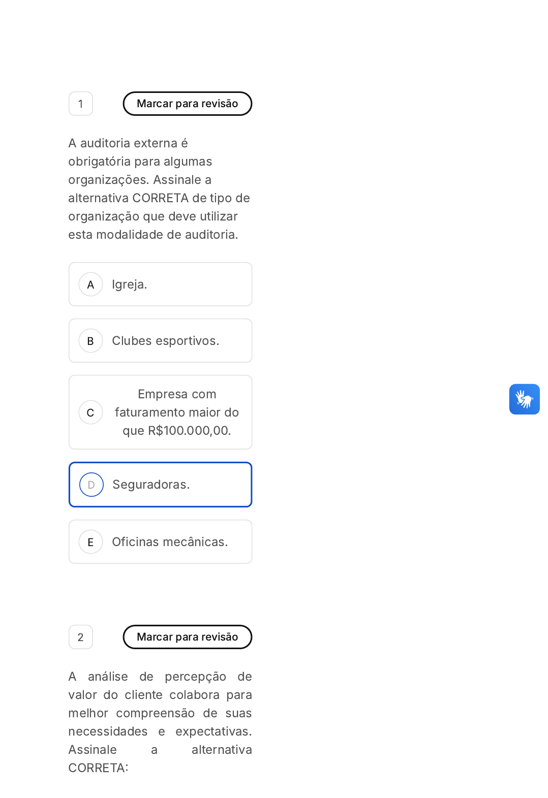 A B C D E 1 Marcar para revisão A auditoria externa é obrigatória para algumas organizações. Assinale a alternativa CORRETA de tipo de organização que deve utilizar esta modalidade de auditoria. Igreja. Clubes esportivos. Empresa com faturamento maior do que R$100.000,00. Seguradoras. Oficinas mecânicas. 2 Marcar para revisão A análise de percepção de valor do cliente colabora para melhor compreensão de suas necessidades e expectativas. Assinale a alternativa CORRETA: A B C D E A percepção de valor do cliente é definida pela equipe de marketing da organização. O preço caro de um produto se justifica sempre que for consequência do alto grau tecnológico requerido para seu desenvolvimento. A percepção de valor do cliente não é definida pela organização, mas pelo cliente do produto ou serviço. Um produto tem percepção de valor quando a organização define, detalhadamente, suas especificações. As necessidades e expectativas dos clientes são levadas em consideração pela organização na definição do parâmetro de percepção de valor. A B C D E 3 Marcar para revisão A auditoria contábil, sob o aspecto da contabilidade, contribui para a avaliação dos controles internos. Assinale a alternativa que não impacta nos controles internos: Estrutura organizacional. Complexidade dos processos organizacionais. Segregação de funções. Riscos nos processos. Salário dos funcionários. 4 Marcar para revisão Complete o texto a seguir: A auditoria ____ é composta de atividades desenvolvidas por membros da organização que atuam de forma ____ para avaliar informações contábeis, financeiras e operacionais, razão pela qual deve ser A B C D E realizada por um grupo de trabalho ____. Interna, independente, multidisciplinar. Externa, exemplar, único. Contábil, parcial, especializado. Contábil, paralela, formado por contadores e administradores. Interna, organizada, composto por funcionários da área de gestão de pessoas. 5 Marcar para revisão No trabalho de asseguração, o auditor lida com os riscos identificados e avaliados. Assinale a alternativa incorreta quanto a um dos pontos abordados no tratamento desses riscos. A B C D E Aplicação de procedimentos diversos de avaliação de risco. Determinação da materialidade da auditoria. Necessidade de especialistas em determinadas áreas de gestão. Compreensão do ambiente regulatório em que se insere a organização que passará pelo processo de auditoria. Análise de desempenho de processo de auditoria. 6 Marcar para revisão A atuação dos auditores independentes é pautada em princípios éticos. Assinale a alternativa incorreta quanto a um desses princípios: A B C D E A B C D E Objetividade Competência e zelo profissionais Sigilo profissional Comportamento profissional Eficácia 7 Marcar para revisão Assinale a alternativa que melhor represente um critério de mensuração ou avaliação de objeto. Eficiência Confiabilidade Eficácia Proporcionalidade Economicidade A B C D E 8 Marcar para revisão O início dos trabalhos de auditoria é precedido por atividades preliminares. Indique a alternativa que melhor represente uma dessas atividades. Planejamento contábil Estratégia global de auditoria Plano de auditoria Definição dos termos de trabalho de auditoria Planejamento financeiro 9 Marcar para revisão O controle de gestão visa assegurar que as atividades da organização sejam realizadas de acordo com os princípios de eficiência, eficácia, economicidade e efetividade. A respeito desses princípios assinale a alternativa correta. 00 hora : 29 min : 52 seg Ocultar Questão 10 de 10 Respondidas (10) Em branco (0) Finalizar prova 1 2 3 4 5 6 7 8 9 10 Prova AV Auditoria Contábil A B C D E A eficiência refere-se ao alcance dos objetivos conforme o planejamento. O conceito de eficácia não está vinculado com menor aplicação de recursos financeiros. A eficácia é sinônimo de eficiência com efetividade. A efetividade estabelece parâmetros para mensuração da eficiência e eficácia. A eficácia do ciclo PDCA depende da aplicação correta de recursos financeiros. 10 Marcar para revisão O planejamento na auditoria de demonstrações contábeis é realizado para definir a estratégia global de condução dos trabalhos e o desenvolvimento do plano de auditoria. Assinale a alternativa que indica um dos benefícios A B C D E que o planejamento em auditoria proporciona. Dedicação às áreas mais importantes de auditoria Atuação prioritária dos controles internos. Demonstrações contábeis realizadas por profissionais específicos. Melhor alocação de funcionários da área de governança. Incentivo às boas práticas de gestão.