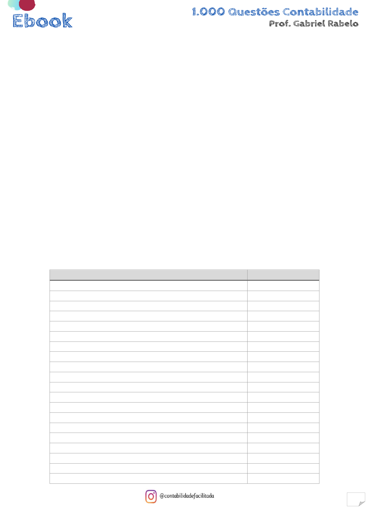 Ebook 1.000 Questões Contabilidade Prof. Gabriel Rabelo 305 Imposto de renda e contribuição social correntes 11.700,00 Impostos a recolher (9.450,00) Impostos sobre vendas 65.250,00 Mútuos a receber com empresas ligadas (ANC) 4.500,00 Outras contas a pagar (1.050,00) Provisão para Créditos de Liquidação Duvidosa (3.450,00) Receitas bruta de vendas (440.000,00) Reservas de capital (4.500,00) Salários a pagar (6.000,00) Títulos a receber (ANC) 4.500,00 O valor do Lucro Bruto da empresa, em 31 de janeiro de 2018, em Reais, é a) 67.700,00. b) 76.950,00. c) 85.000,00. d) 89.200,00. e) 97.500,00. 826. (VUNESP/Câmara Municipal de Cotia /Contador/2017) Considere o balancete apurado em uma determinada data e responda às duas próximas questões, levando-se em consideração o fechamento da demonstração do resultado. Contas Valores em Reais Estoque 11.750,00 Parcelamento de Impostos de LP (9.350,00) Fornecedores (12.150,00) Despesas com Imposto de Renda e Contribuição Social 2.542,00 Reserva de Lucros (1.750,00) Despesas Diversas 650,00 Máquinas e Equipamentos 65.300,00 Ativos Intangíveis 9.200,00 Despesas Administrativas 10.825,00 Devoluções de Vendas 9.513,00 Depósitos Judiciais de LP 3.800,00 Reserva de Contingência (7.500,00) Bancos (6.150,00) Salários a Pagar (8.750,00) Caixa 750,00 Capital Social (35.000,00) Despesas Antecipadas 900,00 Custo dos Produtos Vendidos 133.175,00 Lucros a Distribuir (3.800,00) Impostos sobre Vendas 15.220,00
