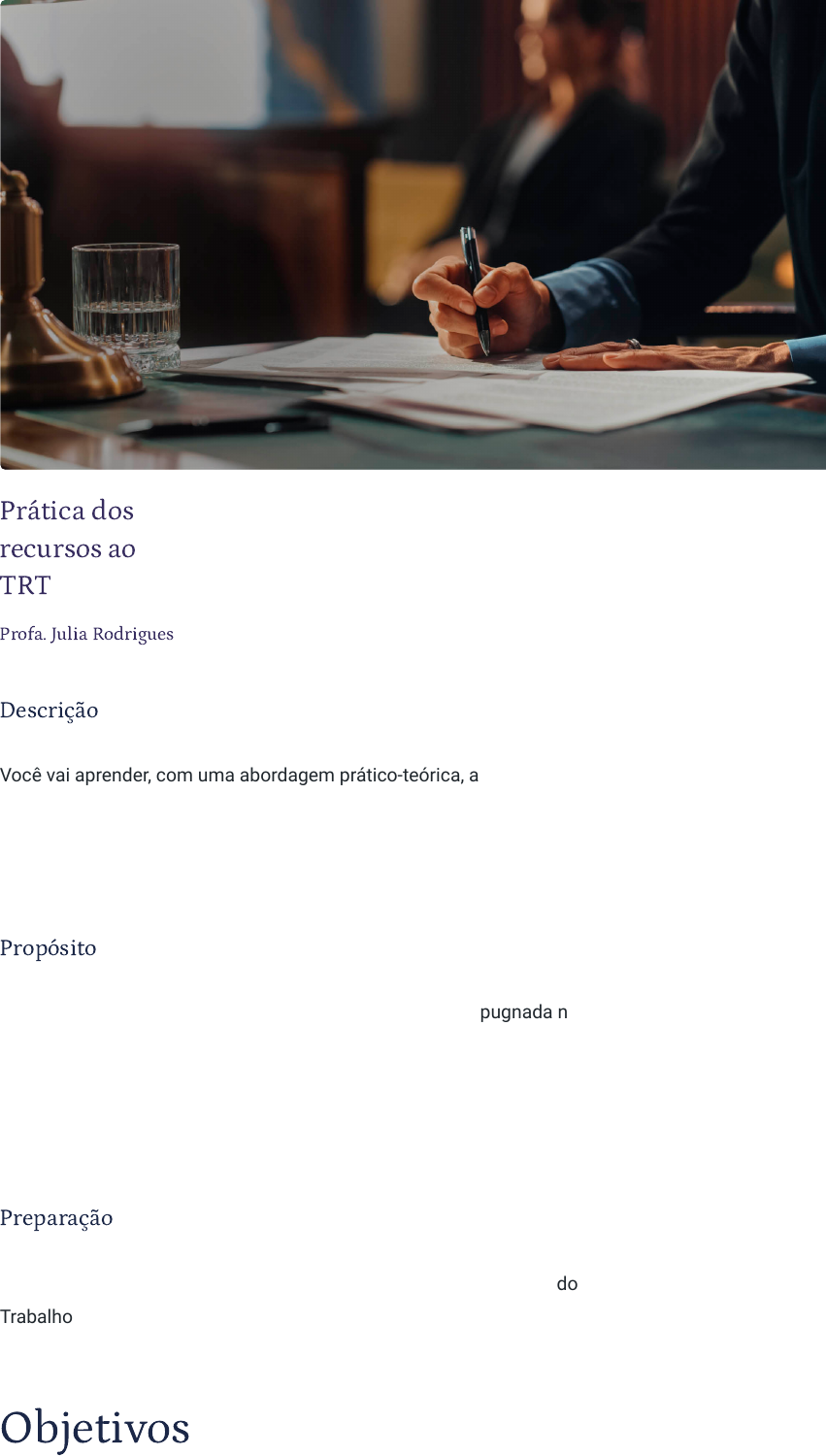 Prática dos recursos ao TRT Profa. Julia Rodrigues Descrição Você vai aprender, com uma abordagem prático-teórica, a elaborar os principais recursos direcionados ao Tribunal Regional do Trabalho (TRT), a saber: recurso ordinário, embargos de declaração e agravo de instrumento. Propósito O recurso é o meio processual para que a decisão seja impugnada na Justiça do Trabalho. O recurso ordinário, os embargos de declaração e o agravo de instrumento são os principais recursos dirigidos ao Tribunal Regional do Trabalho (TRT). Por isso, é essencial que os profissionais do direito tenham conhecimento teórico e prático sobre a sua elaboração. Preparação Antes de iniciar o estudo, tenha em mãos a Consolidação das Leis do Trabalho (CLT) e o Código de Processo Civil (CPC). Objetivos Módulo 1 Recursos trabalhistas Analisar princípios, características, efeitos e requisitos do sistema processual de recursos trabalhistas. Módulo 2 Recursos ao TRT Reconhecer os principais recursos dirigidos ao TRT. Módulo 3 Elaboração dos recursos ao TRT Elaborar, com um viés prático e teórico, os recursos dirigidos ao TRT. Introdução O recurso é o principal meio processual para que a decisão seja impugnada pela parte vencida, pelo terceiro prejudicado e pelo Ministério Público do Trabalho na Justiça do Trabalho. Os principais recursos dirigidos ao Tribunal Regional do Trabalho (TRT) são o recurso ordinário, os embargos de declaração e o agravo de instrumento, que serão aqui apresentados com um viés prático-teórico. Os recursos trabalhistas são baseados em princípios gerais e específicos do direito do trabalho que regem a sua sistemática e possuem algumas características peculiares. Os recursos trabalhistas, em regra, têm efeito meramente devolutivo, sendo permitida a execução até a penhora (art. 899, caput, da CLT), e são submetidos ao duplo juízo de admissibilidade recursal. Os recursos trabalhistas também devem observar os pressupostos recursais de previsão legal (cabimento), adequação, tempestividade, preparo e depósito recursal. Aqui, vamos ver as hipóteses de cabimento dos recursos ao TRT, com um conteúdo prático-teórico importante para o profissional do direito acerca da interposição do recurso ordinário, oposição dos embargos de declaração e interposição do agravo de instrumento trabalhista. A ênfase é na elaboração das peças processuais adequadas para a formulação dos recursos a serem dirigidos ao TRT. Material para download Clique no botão abaixo para fazer o download do conteúdo completo em formato PDF. Download material javascript:CriaPDF() 1 - Recursos trabalhistas Ao �nal deste módulo, você será capaz de analisar princípios, características, efeitos e requisitos do sistema processual de recursos trabalhistas. Sistema processual de recursos trabalhistas Confira, neste vídeo, os princípios e as características dos recursos trabalhistas. Primeiras observações O recurso é um meio processual disponível para que a decisão seja impugnada pela parte vencida, pelo terceiro prejudicado e pelo Ministério Público do Trabalho. O recurso trabalhista tem natureza jurídica de prolongamento do exercício do direito de ação. Desse modo, a decisão impugnada poderá ser reformada, esclarecida, invalidada ou integrada na mesma relação jurídico-processual. Conheça as diversas razões que fundamentam a necessidade de existência dos recursos! Inconformismo da parte vencida Diante disso, configura-se um amplo sistema processual de recursos trabalhistas, formado por: Embargos de declaração (art. 897-A da CLT) Recurso ordinário (art. 895 da CLT) Agravo de instrumento (art. 897, b, da CLT) Agravo de petição (art. 897, a, da CLT) Recurso de revista (arts. 896, 896-A, 896-B e 896-C da CLT) Embargos no TST (art. 894 da CLT) Agravo regimental ou interno (art. 709, § 1º, da CLT; art. 1.021 do CPC; Súmula 435 do TST e OJ 412 da SDI-1/TST) Recurso de revisão (art. 2º, §§ 1º e 2º, da Lei nº 5.584/1970) Falibilidade humana Aprimoramento das decisões judiciais Controle dos atos jurisdicionais pelas instâncias superiores Recurso extraordinário (art. 102, III, da CF; e arts. 1.029 a 1.041 do CPC) Recurso ordinário constitucional (art. 102, II, da CF; e arts. 1.027 e 1.028 do CPC) Recurso adesivo (art. 997 do CPC; e Súmula 283 do TST) Princípios dos recursos trabalhistas Os recursos trabalhistas estão permeados por uma vasta gama de princípios gerais e específicos do direito do trabalho. Confira alguns dos mais relevantes princípios que regem a sistemática recursal trabalhista! Duplo grau de jurisdição Assegura o controle das decisões judiciais proferidas pelas instâncias inferiores realizado pelos órgãos superiores. A decisão contrária à Fazenda Pública será submetida ao duplo grau de jurisdição obrigatório, também denominado reexame necessário (Decreto-lei nº 779/1969 e art. 496 do CPC), que não se trata de recurso por não objetivar reformar, aclarar ou anular a decisão. É uma condição de eficácia da decisão. Taxatividade ou legalidade Estabelece que será cabível apenas o recurso em lei, mais especificamente na CLT ou em legislação extravagante. Por isso, o rol dos recursos trabalhistas é taxativo (numerus clausus). Unirrecorribilidade, singularidade ou unicidade recursal Ad it bi t d ú i ífi Características de recursos trabalhistas As principais características dos recursos na Justiça do Trabalho são: uniformidade dos prazos recursais trabalhistas; irrecorribilidade Admite o cabimento de um único recurso específico para cada decisão. Ressalta-se que parte da doutrina entende que esse princípio não é absoluto, pois são possíveis, por exemplo, embargos de declaração e recurso (ordinário, de revista, embargos de divergência ou extraordinário) da mesma decisão. Fungibilidade ou conversibilidade Possibilita que um recurso interposto de forma incorreta seja adm