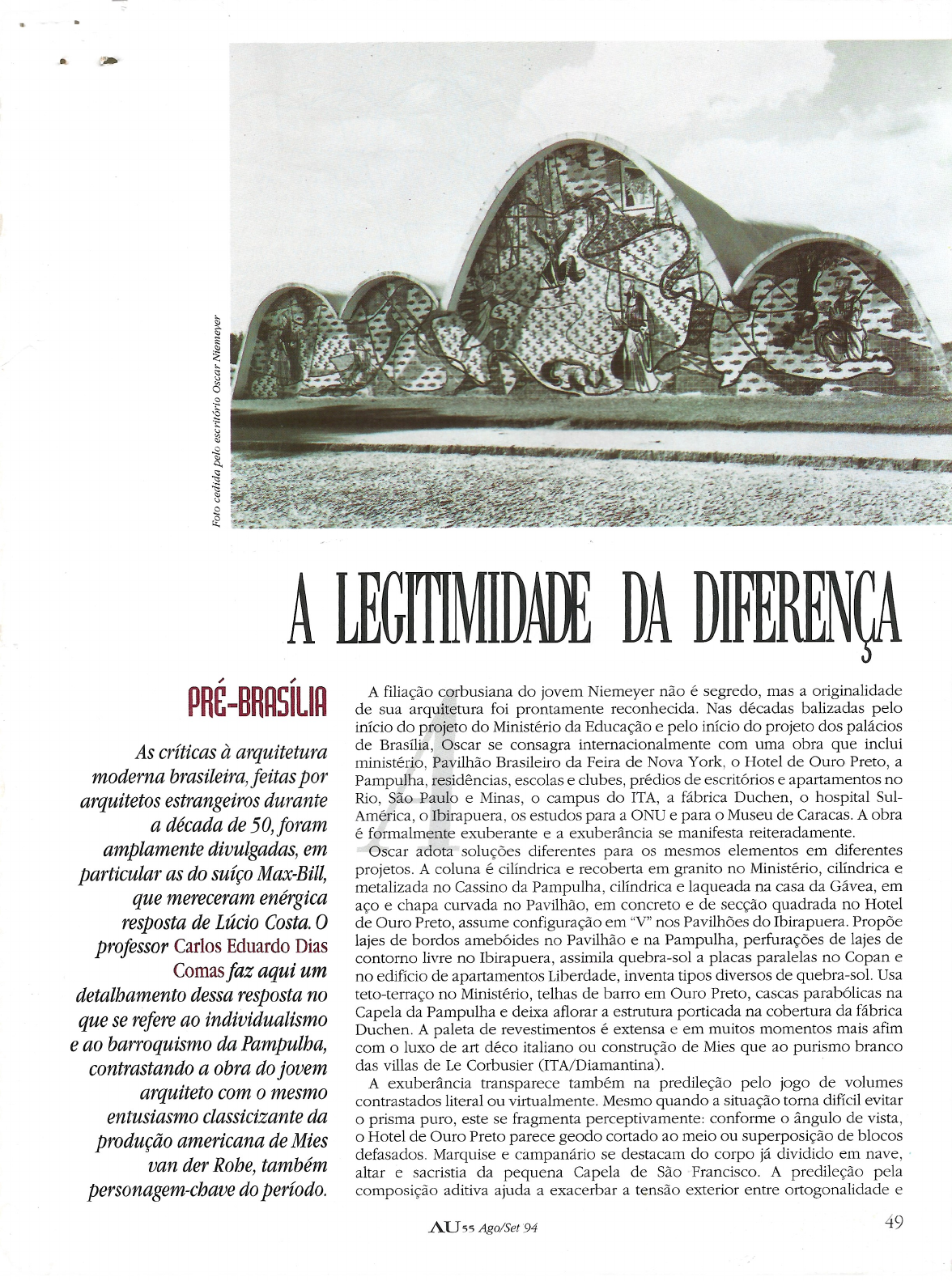 A LEGITIMIDADE DA DIFERENÇA PRÉ-BRASÍLIA A filiação corbusiana do jovem Niemeyer não é segredo, mas a originalidade de sua arquitetura foi prontamente reconhecida. Nas décadas balizadas pelo início do projeto do Ministério da Educação e pelo início do projeto dos palácios As críticas à arquitetura de Brasília, Oscar se consagra internacionalmente com uma obra que inclui moderna brasileira, feitas por ministério, Pavilhão Brasileiro da Feira de Nova York, Hotel de Ouro Preto, a arquitetos estrangeiros durante Pampulha, residências, escolas e clubes, prédios de escritórios e apartamentos no Rio, São Paulo e Minas, campus do ITA, a fábrica Duchen, hospital Sul- a década de 50, foram América, Ibirapuera, os estudos para a ONU e para Museu de Caracas. A obra amplamente divulgadas, em é formalmente exuberante e a exuberância se manifesta Oscar adota soluções diferentes para os mesmos elementos em diferentes particular as do Max-Bill, projetos. A coluna é cilíndrica e recoberta em granito no Ministério, cilíndrica e que mereceram enérgica metalizada no Cassino da Pampulha, cilíndrica e laqueada na casa da Gávea, em resposta de Lúcio Costa. aço e chapa curvada no Pavilhão, em concreto e de secção quadrada no Hotel de Ouro Preto, assume configuração em "V" nos Pavilhões do Ibirapuera. Propõe professor Carlos Eduardo Dias lajes de bordos no Pavilhão e na Pampulha, perfurações de lajes de Comas faz aqui um contorno livre no Ibirapuera, assimila quebra-sol a placas paralelas no Copan e detalbamento dessa resposta no no edifício de apartamentos Liberdade, inventa tipos diversos de quebra-sol. Usa teto-terraço no Ministério, telhas de barro em Ouro Preto, cascas parabólicas na que se refere ao individualismo Capela da Pampulha e deixa aflorar a estrutura porticada na cobertura da fábrica e ao barroquismo da Pampulha, Duchen. A paleta de revestimentos é extensa e em muitos momentos mais afim contrastando a obra do jovem com luxo de art déco italiano ou construção de Mies que ao purismo branco das villas de Le Corbusier (ITA/Diamantina). arquiteto com mesmo A exuberância transparece também na predileção pelo jogo de volumes entusiasmo classicizante da contrastados literal ou virtualmente. Mesmo quando a situação torna difícil evitar produção americana de Mies prisma puro, este se fragmenta conforme ângulo de vista, Hotel de Ouro Preto parece geodo cortado ao meio ou superposição de blocos van der Robe, também defasados. Marquise e campanário se destacam do corpo já dividido em nave, personagem-chave do período. altar e sacristia da pequena Capela de São Francisco. A predileção pela composição aditiva ajuda a exacerbar a tensão exterior entre ortogonalidade e AU55 Ago/Set 94 49Capela São Francisco Pampulha não-ortogonalidade, horizontalidade e verticalidade, como no insólito contraste entre fachadas de rua e de jardim no Pavi- lhão de Nova York ou entre os quatro prédios da Pampulha. Enseja desenvolvi- mento, ao ar livre, de elaboradas "promenades contrapondo frontalidade con- ceitual e penetração oblíqua. No Ministério, contraponto se estabelece via partido em "T", experienciado como um "H" erodido, graças às bandas plantadas paralelas ao corpo baixo, pórtico hipostilo vazado e a disposição lateral de portas de entrada; no Pavilhão, Hotel e Yacht Club, através de rampa curva ou paralela à fachada de acesso principal. Menos óbvia é a exteriorização em fachada do debate socrático entre suportes, vedações e lajes, que está implícito na "planta livre" enunciada por Corbusier no esquema Dom-ino de 1916. Nas décadas de 20 e 30, Corbusier havia convertido a expressão arquitetônica da estrutura independente em drama puro, Mies tinha explorado lirismo potencial de uma dialética que contrapunha suportes lineares e sistema de lajes planas geometricamente organizado a um sistema de vedações topologicamente dispostas. Entretanto, drama de um se encerrava quase sempre dentro dos limites do prisma puro; lirismo de outro se continha, geralmente, dentro dos muros de um pátio; em ambos os casos, a exceção das vedações se subordinando à regra da estrutura. Casa do Baile Pampulha Oscar extroverte debate. Não tem precedente a planta baixa do Pavilhão nova- iorquino, onde a exibição da profundidade total do pilotis se alterna com episódios em que as paredes ocultam colunas periféricas e episódios em que se dispõem atrás dessas colunas. No Hotel de Ouro Preto, colunatas de três pés- direitos de altura são parcialmente veladas ou ocultas por paredes que se aproximam e se afastam. No Banco Boavista, a parede do acesso principal dobra primeiro, configurando biombo sinusoidal entre as colunas externamente à vista e continua como pano reto que as oculta na fachada adjacente. Na casa do arquiteto, a laje amebóide parece flutuar sobre delgadas colunas, às vezes internas, às vezes externas, a uma envolvente curvilínea, como uma ampulheta. Em outra instância, mesmo debate se evidencia através das colunatas de ordem colossal nas fachadas do corpo baixo do Ministério, do Pavilhão, do Hotel de Ouro Preto e do Cassino do Pampulha. A configuração independente dos bordos de lajes paralelas, que a ordem implica, se reitera na loggia do Pavilhão, Clube Pampulha opondo expansividade curvilínea de laje de cobertura à retilineidade de laje de piso. Menos dramaticamente, painel cego sobre galeria na fachada principal do Cassino e pano de vidro de duplo pé-direito deixam claro que a laje intermediária se reduz a um mezanino. Em qualquer caso, Oscar radicaliza e confere à regra e à exceção igual valor, questionando por extensão a identificação de laje e malha de suportes com ortogonalidade, regularidade e Quer em termos de elementos de arquitetura, elementos de composição ou de partidos, Oscar se compraz na multiplicidade e diversidade, em flagrante oposição à arte do Mies, transplantado para 