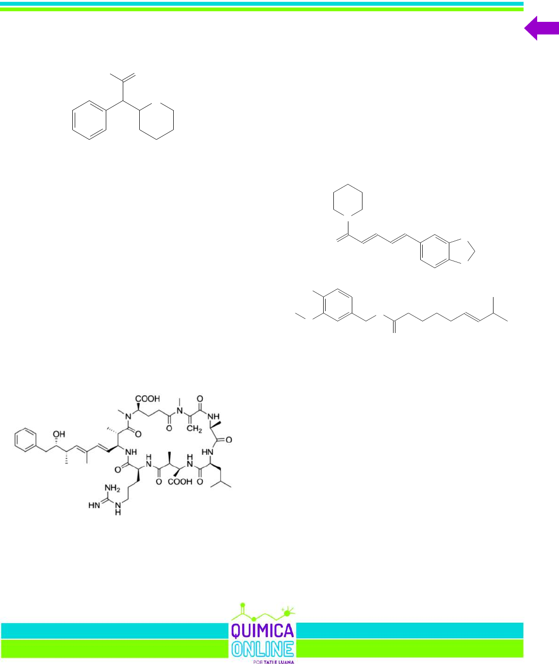 3000 QUESTÕES DE QUÍMICA 595 A Ritalina®, medicamento largamente utilizado para atenuar sintomas de inquietação e hiperatividade, principalmente por jovens e estudantes, apresenta a seguinte estrutura molecular H N OMeO Em relação à estrutura da Ritalina é incorreto afirmar que a) apresenta as funcionalidades éster e amina secundária. b) possui fórmula molecular C14H19NO2. c) apresenta 3 carbonos assimétricos. d) possui 7 carbonos com hibridização sp2. e) possui 2 carbonos terciários. 11 - (UNIFOR CE) Uma questão que vem sendo amplamente estudada e discutida no campo do abastecimento de água são as cianobactérias e as cianotoxinas. Cianotoxinas são toxinas produzidas por algumas espécies de cianobactérias em água doce ou salgada e podem ter efeitos hepatotóxicos (microcistina), neurotóxicos (anatoxina-a, e saxitoxina), citotóxicos (cilindrospermopsina) e dermatóxicos (lingbiatoxina). Abaixo apresentase a estrutura molecular de uma microcistina. Assinale a alternativa que identifica os grupos funcionais presentes na molécula de microcistina. a) Cetona, Éter, Amina e Éster. b) Álcool, Éter, Amina e Cetona. c) Tiol, Ácido Carboxílico, Éster e Amida. d) Álcool, Ácido Carboxílico, Amina e Cetona. e) Álcool, Ácido Carboxílico, Amina e Amida. 12 - (UDESC SC) A piperina e a capsaicina são duas substâncias químicas responsáveis pela sensação de ardor causada pelas pimentas. A piperina é um alcaloide que pode ser encontrado na pimenta do reino e que estimula receptores na língua que são sensíveis à dor, dando um sabor picante aos alimentos. A capsaicina pode ser encontrada nas pimentas verdes e vermelhas e age de modo semelhante à piperina, atribuindo um sabor picante aos alimentos, de modo que quanto maior o teor destas substâncias, maior a sensação de ardência ao paladar. N O O O Piperina Assinale a alternativa correta em relação às duas substâncias. a) A capsaicina e a piperina podem ser classificadas nas seguintes funções químicas: fenol, amida e éster. b) Ambas podem ser classificadas como éter e amina, além de possuírem carbonos com hibridização sp2 e serem consideradas bases de Lewis. c) Ambas podem ser classificadas como éter e amida, além de possuírem carbonos com hibridização sp2 e serem consideradas como ácidos de Lewis. d) Ambas apresentam a função química éter e amida, além de possuírem carbonos com hibridização sp2 e serem consideradas bases de Lewis. e) A piperina pode ser considerada um ácido de Lewis e a capsaicina pode ser classificada como base de Lewis. 13 - (UFSCAR SP) O chá de folhas de boldo do Brasil, também chamado de boldo nacional, é usado em todos os estados do Brasil como HO O H N O Capsaicina 3000 QUESTÕES DE QUÍMICA 596 medicação para tratamento dos males do fígado e de problemas da digestão. A fórmula estrutural representada a seguir é da substância química chamada barbatusol, um dos princípios ativos encontrados nas folhas de boldo nacional. HO OH De acordo com a fórmula estrutural, o barbatusol apresenta grupo funcional característico de a) fenóis. b) éteres. c) álcoois. d) ésteres. e) aldeídos. 14 - (IME RJ) A eritromicina é uma substância antibacteriana do grupo dos macrolídeos muito utilizada no tratamento de diversas infecções. Dada a estrutura da eritromicina abaixo, assinale a alternativa que corresponde às funções orgânicas presentes. a) Álcool, nitrila, amida, ácido carboxílico. b) Álcool, cetona, éter, aldeído, amina. c) Amina, éter, éster, ácido carboxílico, álcool. d) Éter, éster, cetona, amina, álcool. e) Aldeído, éster, cetona, amida, éter. 15 - (UFJF MG) A seguir, está representada a estrutura química do ácido Jiadifenoico C, um potente antiviral de origem terpênica. OH CH3C O HO ácido Jiadifenoico C Sobre a estrutura do ácido Jiadifenoico C, são feitas as seguintes afirmações: I. notam-se nove átomos de carbonos com hibridização sp2. II. as funções orgânicas oxigenadas presentes são álcool e éster. III. o composto possui cinco átomos de carbono quaternário. IV. sua fórmula molecular é C20H26O3. Assinale a alternativa CORRETA. a) Apenas as afirmações I, II e IV são verdadeiras. b) Apenas as afirmações I e IV são verdadeiras. c) Apenas as afirmações I e III são verdadeiras. d) Apenas as afirmações II, III e IV são verdadeiras. e) Apenas as afirmações I e II são verdadeiras. 16 - (UEFS BA) O OO OH Varfarina