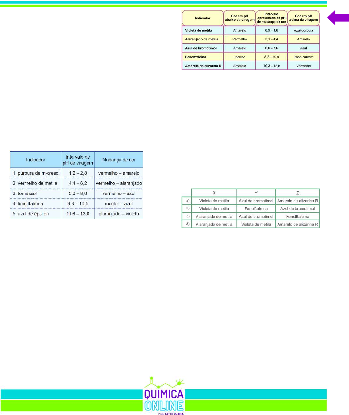3000 QUESTÕES DE QUÍMICA 483 Observação 2 Possuía alta solubilidade em água. Observação 3 O papel de tornassol ficou vermelho em contato com ele. Observação 4 Apresentou condução de corrente elétrica quando dissolvido em água. Baseado nas observações feitas pelo estudante, pode-se afirmar que o composto analisado é: a) HCl b) NaOH c) NaCl d) I2 e) CH4 68 - (UNESP SP) Considere a tabela, que apresenta indicadores ácido-base e seus respectivos intervalos de pH de viragem de cor. Para distinguir uma solução aquosa 0,0001 mol/L de HNO3 (ácido forte) de outra solução aquosa do mesmo ácido 0,1 mol/L, usando somente um desses indicadores, deve-se escolher o indicador a) 1. b) 4. c) 2. d) 3. e) 5. 69 - (PUC SP) Dados: Constante de ionização (Ka) do H2CO3 = 4 10–7 Constante de ionização (Kb) do NH3 = 2 10–5 Constante de ionização (Kw) do H2O = 1 10–14 Os indicadores ácido base são substâncias cuja cor se altera em uma faixa específica de pH. A tabela a seguir apresenta a faixa de viragem (mudança de cor) de alguns indicadores ácido base. A partir da análise dessa tabela, um técnico executou um procedimento para distinguir algumas soluções. Para diferenciar uma solução de HCl de concentração 1,0 mol.L–1 de uma solução de HCl de concentração 0,01 mol.L–1 ele utilizou o indicador X. Para diferenciar uma solução de bicarbonato de sódio (NaHCO3) de concentração 0,01 mol.L–1 de uma solução de cloreto de amônio (NH4Cl) de concentração 0,01 mol.L–1 ele utilizou o indicador Y. Para diferenciar uma solução de amoníaco (NH3) de concentração 1,0 10–3 mol.L–1 de uma solução de hidróxido de sódio (NaOH) de concentração 0,1 mol.L–1 ele utilizou o indicador Z. A alternativa que apresenta os indicadores X, Y e Z adequados para cada um dos procedimentos propostos pelo técnico é 70 - (UFPR) Folhas de repolho-roxo exibem cor intensa devido à presença de pigmentos. Processando-se algumas folhas num liquidificador com um pouco de água, extrai-se um líquido de cor roxa, que, posteriormente, passa por uma peneira. Foram realizados os seguintes experimentos, seguidos das observações: • Sobre volume de meio copo (~100 mL) do extrato líquido, adicionaram-se 20 mL de solução salina de cloreto de sódio (1 mol L–1). A cor roxa do extrato foi mantida. • Sobre volume de meio copo do extrato líquido, adicionou-se suco de um limão. A cor do extrato líquido se tornou vermelha. Foi observado aspecto opaco (turvo) no extrato líquido logo em seguida à sua separação das folhas de repolho, e esse aspecto se manteve durante todos os experimentos. 3000 QUESTÕES DE QUÍMICA 484 Sobre esse experimento, considere as seguintes afirmativas: 1. A mudança de cor de roxa para vermelha no segundo experimento é evidência de que ocorreu uma transformação química no extrato. 2. O extrato líquido é uma mistura homogênea. 3. Nos 20 mL de solução salina existem 1,2 1022 íons Na+ e 1,2 1022 íons Cl–. Assinale a alternativa correta. a) Somente a afirmativa 1 é verdadeira. b) Somente a afirmativa 2 é verdadeira. c) Somente as afirmativas 1 e 3 são verdadeiras. d) Somente as afirmativas 2 e 3 são verdadeiras. e) As afirmativas 1, 2 e 3 são verdadeiras. 71 - (FMABC SP) Os indicadores ácido base são substâncias cuja cor se altera em uma faixa específica de pH. Cada indicador atua como um ácido fraco, havendo um equilíbrio entre a forma protonada (HInd) e a sua base conjugada (Ind–). Cada uma dessas espécies apresenta cores diferentes, dessa forma a tonalidade da solução depende da concentração das duas espécies. A equação a seguir resume as características do equilíbrio químico em solução aquosa desses corantes. HInd(aq) + H2O(l) H3O+ (aq) + Ind– (aq) Cor A Cor B A tabela a seguir apresenta a faixa de viragem (mudança de cor) de alguns indicadores ácido base. A respeito desses indicadores foram feitas algumas observações: I. A forma protonada (HInd) da fenolftaleína é incolor. II. A constante de ionização (Ka) do violeta de metila é menor do que a constante de ionização do azul de bromotimol. III. Para confirmar que um suco de limão apresenta pH entre 2 e 3, bastaria testá-lo com violeta de metila. IV. O alaranjado de metila é um ácido mais forte do que a fenolftaleína. Estão corretas apenas as afirmações: a) I e II. b) I e III. c) II e IV. d) I e IV. 72 - (UNIRG TO) À solução aquosa de uma substância foram adicionadas duas gotas de fenolftaleína, observando-se o desenvolvimento de coloração rosa. Assinale a alternativa que indica o tipo de substância presente na solução aquosa testada e a coloração que ela obteria ao serem adicionadas duas gotas de azul de bromotimol. a) vinagre, amarelo. b) cloreto de amônio, azul. c) hidróxido de sódio, azul. d) vinagre, incolor. 73 - (IFPE) Indicadores são ácidos orgânicos fracos ou bases orgânicas fracas que apresentam colorações diferenciadas, dependendo de suas formas ionizadas ou não ionizadas, influenciadas pela variação de pH do meio. Considere as colorações e faixas de viragem de pH dos indicadores ácido-base abaixo: Assinale a alternativa que contenha a coloração de uma solução de KOH 0,01 mol/L na presença, respectivamente, dos indicadores: alaranjado de metila, azul de bromotimol e fenolftaleína. a) Vermelho, azul e rosa. b) Amarelo, azul e rosa. c) Amarelo, amarelo e rosa. d) Vermelho, azul e incolor. e) Amarelo, azul e incolor. 74 - (PUC RS)