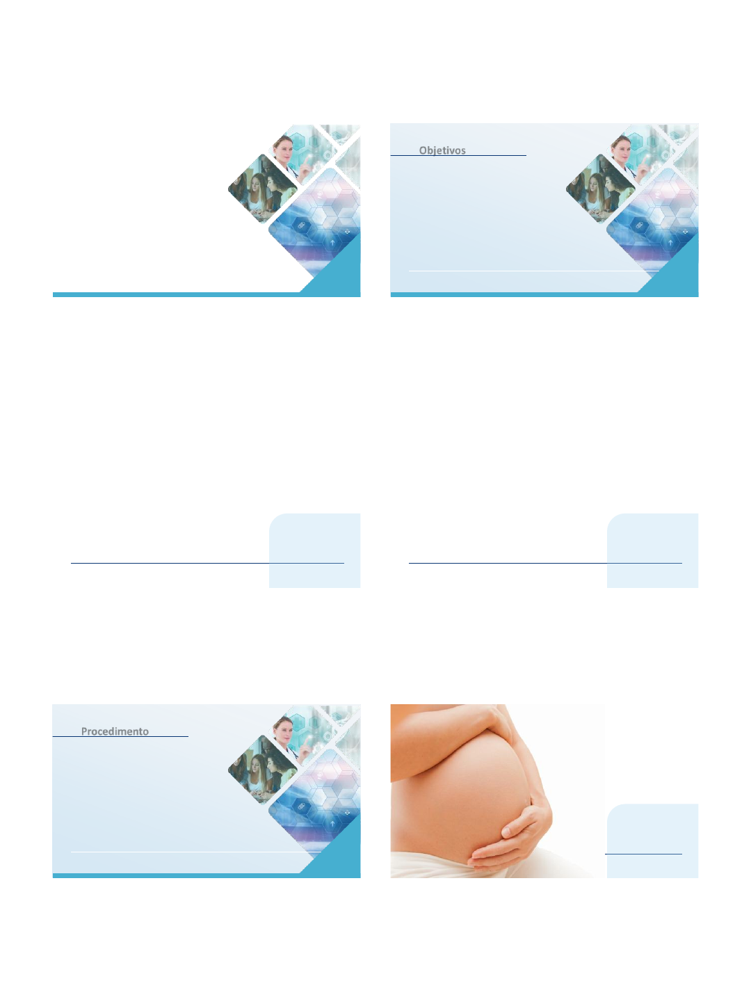 21/10/2019 1 ENFERMAGEM NA SAÚDE DA MULHER Diagnóstico gestacional e acompanhamento pré-natal Prof. MS. Angélica da Mata Rossi Objetivos Objetivos • Realizar o diagnóstico de gestação. • Compreender sobre o acompanhamento pré-natal. Objetivos • Aprender Cálculo da idade gestacional e Data provável do parto. • Realizar Palpação Obstétrica e Medida da Altura Uterina; • Identificar o crescimento fetal; • Diagnosticar os desvios da normalidade a partir da relação entre a altura uterina e a idade gestacional; • Identificar a situação e a apresentação fetal. Procedimento Diagnóstico gestacional A gravidez É considerada, no ciclo vital da mulher, um período de transição. Fonte: https://shutr.bz/2mrnaEv acesso em 19 set 2019 21/10/2019 2 Diagnóstico de gravidez Fonte: https://en.wikipedia.org/wiki/Pregnancy_test acesso em 06 out 2019 Sinais e sintomas da gravidez • Atraso menstrual • Náuseas, vômitos, sonolência, fadiga, aumento da frequência urinária, mastalgia Presunção • Amolecimento da cérvice uterina • Positividade do BHCG Probabilidade • Presença dos batimentos cardíacos fetais (BCF), • Percepção dos movimentos fetais • Ultrassonografia Certeza Procedimento Acompanhamento gestacional Diagnóstico Positivo de Gravidez Acompanhamento da gestante = Cadastramento no SisPreNATAL Realizar anotação na Ficha de pré-natal e no Cartão da gestante O objetivo do acompanhamento pré-natal é assegurar o desenvolvimento da gestação, permitindo o parto de um recém- nascido saudável, sem impacto para a saúde materna, inclusive abordando aspectos psicossociais e as atividades educativas e preventivas. Fonte: https://bit.ly/2LgSkHh acesso em 29 ago 2019 10 passos para um pré-natal de qualidade na atenção básica Captação precoce Recursos Exames Escuta ativa Transporte Parceiro cuidado Referência especializada Parto fisiológico Vinculação Direitos garantidos 21/10/2019 3 Pré-natal, trabalho de parto, parto e pós-parto O(a) acompanhante de escolha da gestante Gestante Acolhimento O(a) acompanhante pode ser alguém da família, amigo(a) ou a doula, conforme a Lei nº 11.108, de 7 de abril de 2005. Fatores de risco que permitem a realização do pré- natal pela equipe de atenção básica Fatores relacionados às características individuais e às condições sociodemográficas desfavoráveis Fatores relacionados à história reprodutiva anterior Fatores relacionados à gravidez atual Fatores de risco que podem indicar encaminhamento ao pré-natal de alto risco Fatores relacionados às condições prévias Fatores relacionados à história reprodutiva anterior Fatores relacionados à gravidez atual Calendário de consultas no pré-natal Mínimo de 6 consultas – intercalado entre médico e enfermeiro. Até 28ª semana – mensalmente; Da 28ª até a 36ª semana – quinzenalmente; Da 36ª até a 41ª semana – semanalmente. Data da última menstruação; Regularidade dos ciclos; Uso de anticoncepcionais; Paridade; Gemelaridade anterior; Detalhes de gestações prévias; Intercorrências clínicas, obstétricas e cirúrgicas; Hospitalizações anteriores; Doenças prévias; Uso de medicações; Reações alérgicas; Exposição ambiental ou ocupacional de risco; História pessoal ou familiar de doenças hereditárias/malformações/ gerais; Fatores socioeconômicos; Atividade sexual; Sexualidade Uso de tabaco, álcool ou outras drogas lícitas ou ilícitas; Vacinações prévias; História de violências. Sanar dúvidas Avaliar risco gestacional Educação em saúde Questionar sobre alimentação, hábitos intestinais e urinários, movimentação fetal, presença de corrimentos ou outras perdas vaginais 21/10/2019 4 Peso, altura, SSVV (PA) Avaliação das mucosas, tireoide, mamas, pulmões, coração, abdome e extremidades Avaliar genitália externa, vagina, o colo do útero, toque bidigital do útero e dos anexos Após 12 semanas: AU, BCF Apresentação fetal - 36ª semana Movimentos fetais Exames complementares da 1º consulta Hemograma Tipagem sanguínea e fator Rh Coombs indireto (se for Rh negativo) Eletroforese de hemoglobina Exame de urina e urocultura Sorologia para hepatite B (HbsAg); Toxoplasmose IgM e IgG Glicemia de jejum Teste rápido de triagem para sífilis e/ou VDRL Teste rápido diagnóstico anti-HIV ou Anti-HIV Parasitológico de fezes Exame da secreção vaginal Citopatológico de colo de útero Ultrassonografia obstétrica Condutas gerais Orientações Alimentação e acompanhamento do ganho de peso gestacional Incentivar aleitamento materno até os seis meses Encaminhamento Atendimento odontológico Imunização Serviços especializados quando necessário Prescrição Suplementação de sulfato ferroso (40mg de ferro elementar/dia) e Ácido fólico (5mg/dia) Consultas subsequentes Anamnese sucinta Exame físico direcionado Calendário vacinal Resultado de exames IG, IMC, PA Pesquisa de edema Exame ginecológico BCF, MF Orientações Cálculo da idade gestacional - IG Uso do calendário: some o número de dias do intervalo entre a DUM e a data da consulta, dividindo o total por sete (resultado em semanas) Uso de disco (gestograma): DUM desconhecida, conhecendo o período do mês (início, meio ou fim)= 5, 15, 25 Cálculo da idade gestacional - IG DUM conhecida e certa Calcule a IG, considerando a data da consulta o dia 30/08/2019 e DUM: 20/06/2019: Jun: 10 dias Jul: 31 dias Ago: 30 dias Total: 71dias 71 ÷ 7 = 10 semanas + 1 dia 21/10/2019 5 Medida da AU e toque vaginal Data de início dos MF (18 e 20 semanas) USG obstétrica DUM desconhecida Idade gestacional - IG Cálculo da data provável do parto - DPP Regra de Näegele: Somar 7 dias do dia da DUM adicionar 9 ao mês da DUM (meses de janeiro a março) subtrair 3 ao mês da DUM (meses abril – dezembro) Gestograma Calendário Gestação 240 dias ou 40 semanas DUM: 02/01/ 2019 +7/ +9/ 09/ 10/ 2019 Cálculo da data provável do parto - DPP Regra de Näeg