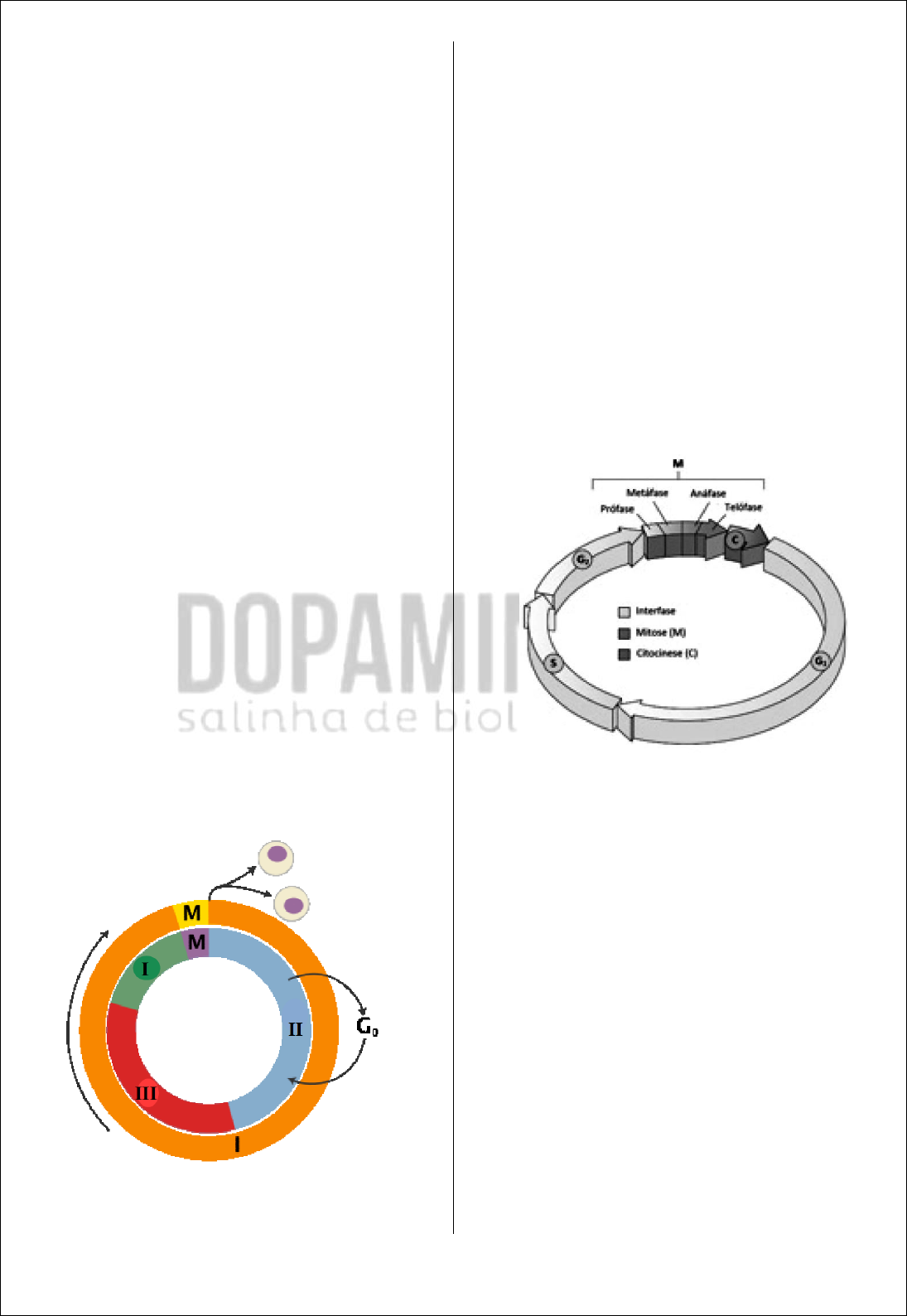 PROFESSORA MARINA ESPÍNOLA SALINHA DOPAMINA 63 2.5 Núcleo / Ciclo e Divisão Celulares Questão 01 - (ENEM/2018) No ciclo celular atuam moléculas reguladoras. Dentre elas, a proteína p53 é ativada em resposta a mutações no DNA, evitando a progressão do ciclo até que os danos sejam reparados, ou induzindo a célula à autodestruição. ALBERTS, B. et al. Fundamentos da biologia celular. Porto Alegre: Artmed, 2011 (adaptado). A ausência dessa proteína poderá favorecer a a) redução da síntese de DNA, acelerando o ciclo celular. b) saída imediata do ciclo celular, antecipando a proteção do DNA. c) ativação de outras proteínas reguladoras, induzindo a apoptose. d) manutenção da estabilidade genética, favorecendo a longevidade. e) proliferação celular exagerada, resultando na formação de um tumor. Questão 02 - (Fac. Santo Agostinho BA/2018) O ciclo celular representa a série de eventos que ocorrem numa célula levando à sua divisão e à sua duplicação produzindo duas células filhas. A figura abaixo apresenta características de um ciclo celular. Analise-a. Considerando a figura e o assunto abordado, analise as afirmativas a seguir e assinale a alternativa CORRETA. a) Temperatura e disponibilidade de nutrientes podem afetar a duração do ciclo e suas etapas. b) A regulação do ciclo por meio de fatores de crescimento ocorre em III. c) M corresponde à fase mais demorada do ciclo celular. d) Em I e II, ocorre a síntese do DNA. Questão 03 - (PUC SP/2017) A figura a seguir ilustra o ciclo celular. Na célula somática de um organismo diploide em que , espera-se encontrar a) 40 moléculas de DNA em G2. b) 10 moléculas de DNA em C e G1. c) 20 moléculas de DNA na metáfase. d) mais moléculas de DNA em G1 que em S. Questão 04 - (FPS PE/2017) Durante o ciclo celular, todas as células são submetidas a “pontos de checagem”, de forma a impedir que células anormais concluam sua divisão. Por exemplo, células cujo DNA encontra- se lesado, se não forem estimuladas com fatores de crescimento celular ao fim da Fase G1, poderão: a) multiplicar-se continuamente. 20n2