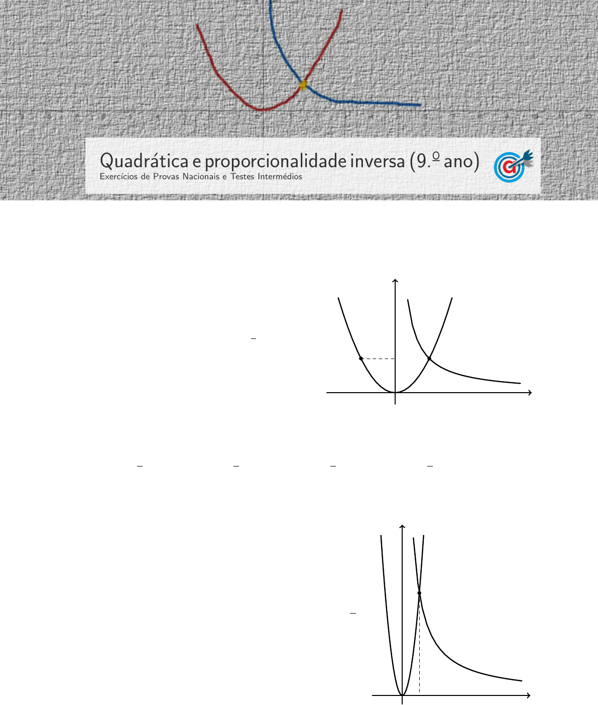 Quadrática e proporcionalidade inversa (9.º ano) Exerćıcios de Provas Nacionais e Testes Intermédios 1. Na figura ao lado, estão representadas, em referencial cartesiano, de origem no ponto O, parte do gráfico de uma função quadrática, f , e parte do gráfico de uma função de proporcionalidade inversa, g. Sabe-se que: • a função f é definida por f(x) = 1 3 x2 ; • o ponto A pertence ao gráfico da função f e tem ordenada igual a 3 ; • o ponto B pertence ao gráfico da função f e ao gráfico da função g ; • os pontos A e B têm abcissas simétricas. x y O f g A 3 B Assinala a opção que apresenta uma expressão algébrica da função g . (A) f(x) = 9 x (B) f(x) = 6 x (C) f(x) = 3 x (D) f(x) = 1 x Prova Final 3.º Ciclo - 2024, 1.ª fase 2. Na figura ao lado, estão representadas, em referencial cartesi- ano, parte do gráfico de uma função quadrática, f , e parte do gráfico de uma função de proporcionalidade inversa, g . Sabe-se que: • a função f é definida por f(x) = 3x2 ; • a função g é definida por uma expressão da forma g(x) = a x , com a > 0 e x > 0 ; • os gráficos das funções f e g intersectam-se no ponto A, de abcissa 2 . Qual é o valor de a ? Mostra como chegaste à tua resposta. x y O f g A 2 Prova Final 3.º Ciclo - 2023, 1.ª fase mat.absolutamente.net 3. Na figura ao lado, estão representadas, em referencial cartesiano, de origem no ponto O, parte do gráfico de uma função quadrática, f , e parte do gráfico de uma função de proporcionalidade inversa, g. Sabe-se que: • a função f é definida por f(x) = ax2, com a ̸= 0; • os gráficos das funções f e g intersectam-se no ponto P , de abcissa 2; • o ponto A pertence ao gráfico da função g e tem coordenadas (4,3). Determina o valor de a. Apresenta todos os cálculos que efetuares. x y O f g 2 P A 4 3 Prova de Matemática, 9.º ano – 2021 4. No referencial cartesiano, de origem no ponto O, da figura ao lado, estão representadas parte do gráfico da função f , definida por f(x) = 2 3 x2, e parte do gráfico da função g, de proporcionalidade inversa. Os gráficos de f e g intersectam-se no ponto A, de ab- cissa 3. O ponto B pertence ao gráfico da função g e tem coor- denadas (c, 2). Determina o valor de c. Apresenta todos os cálculos que efetuares. x y O fg 3 A B c 2 Prova Final 3.º Ciclo – 2019, Época especial 5. No referencial cartesiano, de origem no ponto O, da figura seguinte, estão representadas a função de proporcionalidade inversa f e a função quadrática g. Sabe-se que: • a função f é definida por f(x) = 6 x , com x > 0; • a função g é dada por uma expressão da forma g(x) = ax2, com a ̸= 0; • os gráficos das funções f e g intersectam-se no ponto P, de abcissa 2. Determina o valor de a. Apresenta todos os cálculos que efetuares. x y O g f 2 P Prova Final 3.º Ciclo – 2018, Época especial 2/5 http://mat.absolutamente.net/joomla/index.php/recursos/fichas-de-trabalho/3-ciclo#9-ano mat.absolutamente.net 6. No referencial cartesiano, de origem no ponto O, da figura seguinte, estão representadas a função quadrática f e a função de proporcionalidade inversa g Sabe-se que: • a função f é dada por uma expressão da forma f(x) = ax2, com a ̸= 0; • a função g é definida por g(x) = 8 x , com x > 0; • f(3) = g(4). Determina o valor de a. Apresenta todos os cálculos que efetuares. x y O f g 3 4 Prova Final 3.º Ciclo - 2018, 2.ª fase 7. No referencial cartesiano, de origem no ponto O, da figura ao lado, estão representadas a função quadrática f e a função de proporcionalidade inversa g. Sabe-se que: • a função f é definida por f(x) = 4 3 x2; • a função g é dada por uma expressão da forma g(x) = a x , com a > 0 e x > 0; • os gráficos das funções f e g intersectam-se no ponto P , de abcissa 3. Determina o valor de a. Apresenta todos os cálculos que efetuares. x y O f g 3 P Prova Final 3.º Ciclo - 2018, 1.ª fase 3/5 http://mat.absolutamente.net/joomla/index.php/recursos/fichas-de-trabalho/3-ciclo#9-ano mat.absolutamente.net 8. Em qual das opções seguintes pode estar representada graficamente uma função de proporcionalidade inversa? (A) (B) x y O x y O (C) (D) x y O x y O Prova Final 3.º Ciclo - 2017, 2.ª fase 9. No referencial cartesiano da figura ao lado, estão representadas graficamente as funções f e g. Sabe-se que: • a função f é definida por f(x) = 2x2; • a função g é uma função de proporcionalidade inversa; • os gráficos das funções f e g intersectam-se no ponto P , que tem abcissa 2. Determina uma expressão algébrica que defina a função g. Mostra como chegaste à tua resposta. x y O f g 2 P Prova Final 3.º Ciclo - 2016, 2.ª fase 4/5 http://mat.absolutamente.net/joomla/index.php/recursos/fichas-de-trabalho/3-ciclo#9-ano mat.absolutamente.net 10. No referencial cartesiano da figura ao lado, estão representadas parte do gráfico da função f definida por f(x) = x2 e parte do gráfico de uma função de proporcionalidade inversa, g Os gráficos das duas funções intersectam-se num ponto de ab- cissa 2 Qual das seguintes expressões é equivalente a g(x) ? (A) 2 x (B) 2x (C) 8 x (D) 8x x y O f g 2 Prova Final 3.º Ciclo – 2015, Época especial 11. Na figura seguinte, estão representadas, num referencial cartesiano, partes dos gráficos de duas funções, f e g Sabe-se que: • a função f é uma função quadrática definida por f(x) = ax2 , sendo a um número positivo • a função g é uma função de proporcionalidade inversa • o ponto B pertence ao gráfico da função f e ao gráfico da função g e tem coordenadas (2,6) • o ponto C pertence ao gráfico da função g e tem coordenadas (c; 1,2), sendo c um número positivo Qual é o valor de c ? Mostra como chegaste à tua resposta. x y O B 6 f g 2 c 1,2 C Teste intermédio 9.º ano - 21.03.2014 5/5 http://mat.absolutamente.net/joomla/index.php/recursos/fichas-de-trabalho/3-ciclo#9-ano