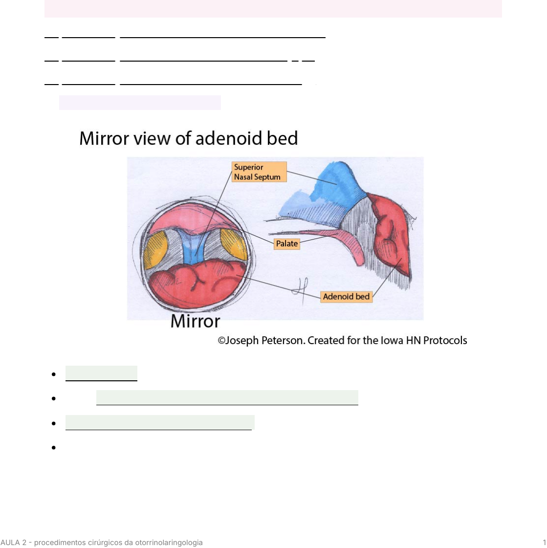 AULA 2 - procedimentos cirúrgicos da otorrinolaringologia ADENOIDECTOMIA e AMIGDALECTOMIA https://www.youtube.com/watch?v=o0ERxv068M https://www.youtube.com/watch?v=bk0IfhBj6pU https://www.youtube.com/watch?v=0TztSQCKjjg → adenoide ou tonsila faríngea: Massa única de tecido piramidal. Base localizada na parede posterior da nasofaringe. Ápice voltado para o septo nasal. Superfície com pregas e criptas simples (menos complexas que as das amígdalas palatinas). AULA 2 procedimentos cirúrgicos da otorrinolaringologia 1 https://www.youtube.com/watch?v=o0ERxv068-M https://www.youtube.com/watch?v=bk0IfhBj6pU https://www.youtube.com/watch?v=0TztSQCKjjg Revestida por epitélio pseudoestratificado ciliado, infiltrado por folículos linfoides. Irrigação sanguínea: Artéria facial Ramo palatino ascendente. Artéria faríngea ascendente. Artéria maxilar interna Ramo faríngeo. Artéria do canal pterigoide. Tronco tireocervical Ramo cervical ascendente. Drenagem venosa: Plexo faríngeo e plexo pterigoide, com drenagem final para as veias facial e jugular interna. Inervação: Nervos glossofaríngeo e vago. Drenagem linfática: Linfonodos retrofaríngeos e cervicais profundos superiores. → amigdala ou tonsila palatina: Localização anatômica: AULA 2 procedimentos cirúrgicos da otorrinolaringologia 2 Situadas na fossa tonsilar. Limitadas anteriormente pelo arco palatoglosso e posteriormente pelo arco palatofaríngeo. Músculo constritor faríngeo superior localizado lateralmente. Envolvidas por uma cápsula fibrosa. Irrigação sanguínea: Artéria facial Ramos tonsilar e palatino ascendente. Artéria faríngea ascendente. Artéria lingual Ramo tonsilar da dorsal lingual. Artéria maxilar Ramo palatino menor. Observações importantes: A artéria carótida interna está aproximadamente 2,02,5 cm posterolateralmente à amígdala. As veias tonsilares perfuram o músculo constritor faríngeo superior e drenam para as veias palatina externa, faríngea e facial. Inervação Ganglio esfenopalatino via nervos palatino menor e glossofaríngeo. Drenagem linfática Linfonodos cervicais profundos superiores. Epidemiologia Cirurgia ainda comum em crianças, apesar da queda na frequência nos últimos anos. Pico nos anos 1970, com cerca de 1 milhão de procedimentos anuais. Mudança na principal indicação: de infecções recorrentes para obstrução das vias aéreas. A tonsilectomia e a adenoidectomia são frequentemente realizadas juntas, pois o pico de crescimento da adenoide coincide com o da tonsila palatina. Além disso, a remoção das amígdalas pode levar à hipertrofia compensatória de outros componentes do Anel de Waldeyer, como a adenoide, o que justifica a remoção simultânea caso esta já apresente tamanho moderado. AULA 2 procedimentos cirúrgicos da otorrinolaringologia 3 Indicações: → o principal sintoma das tonsilas faríngeas são as amigdalites e da adenoide é a obstrução nasal → amigdalectomia SAOS Síndrome da Apneia Obstrutiva do Sono) amigdalite de repetição crianças gravemente afetadas - Critérios de Paradise 7 episódios em um ano, 5 episódios em cada um dos dois anos ou 3 episódios em cada um dos três anos) abcesso peritonsilar prevenção de febre reumática síndrome de febre periódica, estomatite aftosa, faringite e adenite cervical PFAPA Obstrução tonsilar da orofaringe que interfere na deglutição Obstrução amigdaliana que altera a qualidade da voz. Tumor maligno da amígdala (ou suspeita de malignidade). Hemorragia incontrolável dos vasos sanguíneos das amígdalas. Halitose refratária a outras medidas → adenoidectomia obstrução nasal grave AULA 2 procedimentos cirúrgicos da otorrinolaringologia 4 fácies adenoideana sinusite crônica refratária otite média Contraindicações Diátese hemorrágica (distúrbios de coagulação). Risco anestésico elevado ou doença médica não controlada. Anemia. Infecção aguda (relativa) - tonsilectomia a quente pode ser uma opção razoável para abscesso peritonsilar Possíveis complicações Sangramento, infecção, reação à anestesia. Lesão em estruturas adjacentes (lábios, dentes, língua). Insuficiência velofaríngea VPI risco de regurgitação nasal de alimentos/líquidos e fala hipernasal. Fácies adenoideana - respirador bucal AULA 2 procedimentos cirúrgicos da otorrinolaringologia 5 Alteração do paladar e dormência da língua. Dor intensa na garganta durante a cicatrização. Técnica da amigdalectomia → técnica de Sluder � Introduzir o anel do amigdalotomo na faringe � Aproximar o cabo do aparelho da comissura labial do lado oposto � Inserir a amígdala no anel do instrumento � Fechar a haste cortante do amigdalotomo → técnica de dissecção total extra-capsular � Exposição da Amígdala Utiliza-se o abre-boca de Mc Ivor com abaixa-língua para fixar metade da língua, expondo a amígdala a ser removida primeiro. A anestesia local permite boa visualização do polo inferior, enquanto o superior pode ficar parcialmente encoberto. � Incisão e Dissecção Inicial A amígdala é fixada com pinça de Allis, sem tração excessiva. A incisão é realizada de baixo para cima, do polo inferior até próximo à úvula, utilizando um bisturi-descolador-aspirador. � Descolamento da Amígdala Identifica-se o plano de clivagem no terço inferior. Com uma pinça, inicia-se o descolamento posterior e ascendente, liberando a amígdala gradualmente. O polo superior pode apresentar maior resistência, exigindo cuidado extra para evitar lesões. AULA 2 procedimentos cirúrgicos da otorrinolaringologia 6 � Remoção da Amígdala Após o descolamento completo, a amígdala é retirada. O local é enxugado e preenchido com gaze. � Repetição no Lado Oposto O abre-boca é reposicionado para expor a outra amígdala, repetindo-se os passos anteriores. � Hemostasia e Finalização Remove-se a gaze do primeiro lado, inspecionando a hemostasia. Pequenos vasos são ligados com