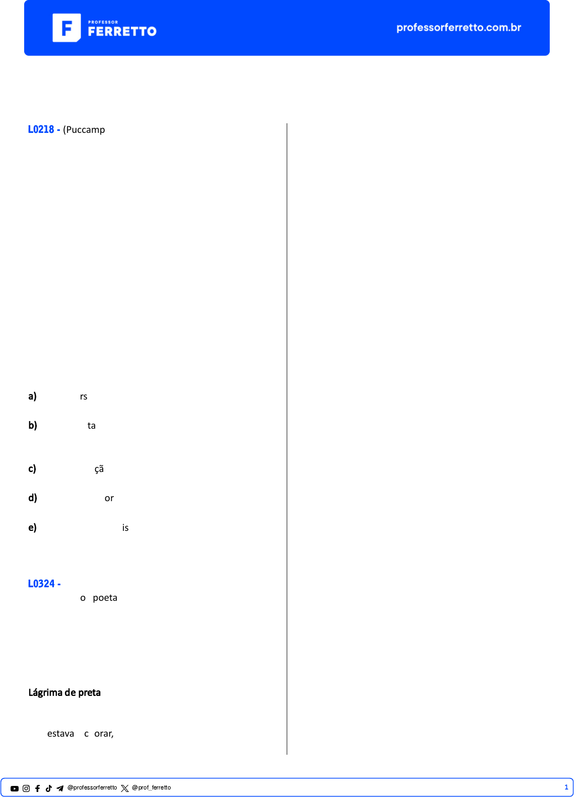 Contemporaneidade L0218 - (Puccamp) São evidentes as marcas da linguagem do espaço urbano moderno na produção literária atual, sobretudo na poesia. Outdoors, inscrições, pichações, logo�pos, signos públicos, grafites passam a cons�tuir uma espécie de comunicação entre as várias camadas da sociedade, dos empresários aos excluídos, da cultura pop às criações das grandes agências publicitárias, das manifestações populares às campanhas polí�cas ou ins�tucionais. Há uma espécie de fermentação de signos desejosos de expor seja o rosto triunfante do capitalismo, seja a reação aos valores que ele propaga – fenômeno a que muitos poetas contemporâneos se mostram sensíveis. (SEPÚLVEDA, Alaor, inédito) Nos anos de 50 e 60 do século passado surgiu e consolidou-se uma vanguarda poé�ca, o Concre�smo, que assumiu modelos de composição inspirados, por exemplo, a) nos recursos de uma poé�ca clássica pela qual se valorizavam as narra�vas de cunho mí�co. b) no aproveitamento gráfico do espaço e na linguagem visual dos signos, renunciando a uma sintaxe tradicional. c) na rear�culação mais ousada de versos modernos em formas tradicionais, como a do soneto. d) nas múl�plas formas do poema em prosa, garan�ndo assim a incorporação de originais narra�vas. e) em formas musicais consagradas, como a da sonata, com destaque para a técnica do contraponto. L0324 - (Unicamp) Em 1961, o poeta António Gedeão publica o livro Máquina de Fogo. Um dos poemas é “Lágrima de Preta”. Musicado por José Niza, foi gravado por Adriano Correia de Oliveira, em 1970, e incluído no seu álbum “Cantaremos”. A canção foi censurada pelo governo português. Lágrima de preta Encontrei uma preta que estava a chorar, pedi-lhe uma lágrima para a analisar. Recolhi a lágrima com todo o cuidado num tubo de ensaio bem esterilizado. Olhei-a de um lado, do outro e de frente: �nha um ar de gota muito transparente. Mandei vir os ácidos, as bases e os sais, as drogas usadas em casos que tais. Ensaiei a frio, experimentei ao lume, de todas as vezes deu-me o que é costume: Nem sinais de negro, nem ves�gios de ódio. Água (quase tudo) e cloreto de sódio. (António Gedeão, Máquina de fogo. Coimbra: Tipografia da Atlân�da,1961, p. 187.) Os versos anteriores ar�culam as linguagens literária e cien�fica com questões de ordem é�ca e polí�ca. Considerando o contexto de produção e recepção de “Lágrima de Preta” (anos 1960 e 1970, em Portugal), o propósito ar�s�co desse poema é 1@professorferretto @prof_ferretto a) inadequado quanto à análise social, ao refutar que haja racismo e preconceito na sociedade, e incorreto no aspecto cien�fico, ao descrever as propriedades químicas de uma lágrima. b) inadequado quanto à análise social, ao refutar a existência de racismo e preconceito na sociedade, mas correto no aspecto cien�fico, ao descrever as propriedades químicas de uma lágrima. c) per�nente quanto à análise social, ao registrar o racismo e a preconceito na sociedade, e correto no aspecto cien�fico, ao descrever as propriedades químicas de uma lágrima. d) per�nente quanto à análise social, ao registrar o preconceito e o racismo na sociedade, mas incorreto no aspecto cien�fico, ao descrever as propriedades químicas de uma lágrima. L0326 - (Unicamp) Para driblar a censura imposta pela ditadura militar, compositores de música popular brasileira (MPB) valiam- se do que Gilberto Vasconcelos chamou de “linguagem da fresta”, expressão inspirada na canção “Festa imodesta”, de Caetano Veloso. (...) Numa festa imodesta como esta Vamos homenagear Todo aquele que nos empresta sua testa Construindo coisas pra se cantar Tudo aquilo que o malandro pronuncia E que o otário silencia Toda festa que se dá ou não se dá Passa pela fresta da cesta e resta a vida. Acima do coração que sofre com razão A razão que volta do coração E acima da razão a rima E acima da rima a nota da canção Bemol natural sustenida no ar Viva aquele que se presta a esta ocupação Salve o compositor popular (Gilberto de Vasconcelos, Música popular: de olho na fresta. Rio de Janeiro: Graal, 1977.) É correto afirmar que, na canção, essa “linguagem da fresta” transparece a) na contradição entre “festa” e “fresta”, que funciona como crí�ca ao malandro. b) na repe�ção de palavras com pronúncia semelhante para louvar a MPB. c) na referência à “fresta” como forma de o compositor se pronunciar. d) na incoerência da rima entre “festa” e “imodesta” para pres�giar o compositor. L0222 - (Mackenzie) O assassino era o escriba Meu professor de análise sintá�ca era o �po do sujeito inexistente. Um pleonasmo, o principal predicado de sua vida, regular como um paradigma da 1ª conjunção. Entre uma oração subordinada e um adjunto adverbial, ele não �nha dúvidas: sempre achava um jeito assindé�co de nos torturar com um aposto. Casou com uma regência. Foi infeliz. Era possessivo como um pronome. E ela era bitransi�va. Tentou ir para os EUA. Não deu. Acharam um ar�go indefinido na sua bagagem. A interjeição do bigode declinava par�culas exple�vas, conec�vos e agentes da passiva o tempo todo. Um dia, matei-o com um objeto direto na cabeça. Paulo Leminski Sobre o texto de Paulo Leminski todas as alterna�vas estão corretas, EXCETO a) a terminologia sintá�ca e morfológica, que em um primeiro momento é mo�vo de estranhamento, concede o efeito de humor ao poema. b) o eu lírico demonstra por meio da composição de texto pessoal e confessional o seu desconhecimento grama�cal. c) nos primeiros sete versos o eu-lírico apresenta seu professor, que, por meio de suas ações e funções, é caracterizado como um torturador. d) entre os versos 8 e 16 o leitor toma consciência de todos os fracassos que compuseram a vida do professor. e) o texto é estruturado em forma d