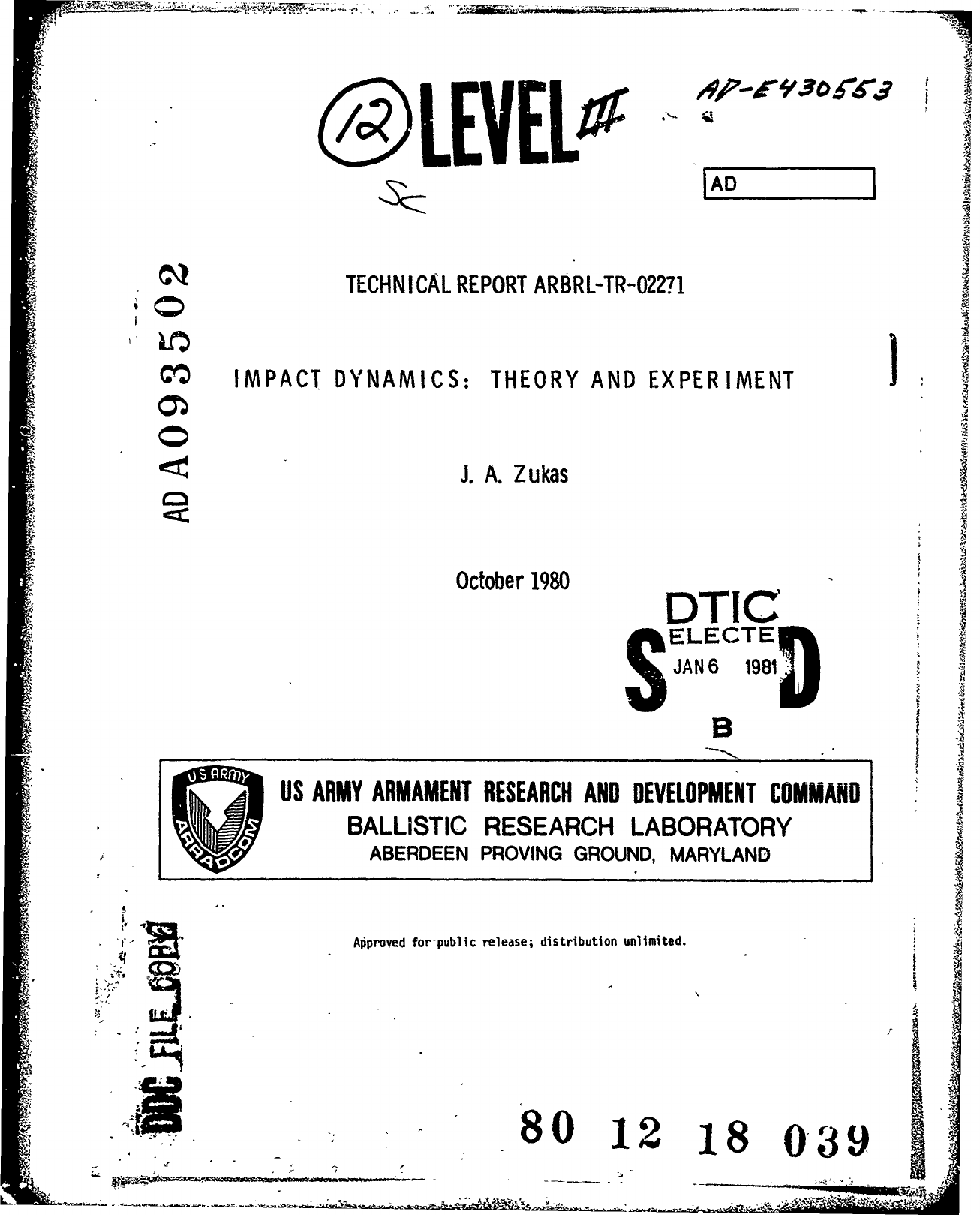 @LEVEL" ADZIIZZ TECHNICAL REPORT ARBRL-TR-02271 II IMPACT DYNAMICS: THEORY AND EXPERIMENT J. A. Zukas October 1980 DTIC' SELECTE B ' US ARMY ARMAMENT RESEARCH AND DEVELOPMENT COMMAND BALLISTIC RESEARCH LABORATORY ABERDEEN PROVING GROUND, MARYLAND Approved for-public release; distribution unlimited. 80 12 18 039 Destroy this report when it is no longer needed. Do not return it to the originator. Secondary distribution of this report by originating or sponsoring activity is prohibited. Additional copies of this report may be obtained from the National Technical Infomation Service, U.S. Department of Comuerce, Springfield, Virginia j 221S1.- The findinis in this report are not to be construed asan official Department of the Army position, unless so designated by other-authorized documents. doe not const~itute indorsewnt of ow •'ammi p.-qdud'. " UNCLASSIFIED SECURITY CLASSIFICATION OF THIS PAGE (lMlhn Data Entered) REPORT DOCUMENTATION PAGE READ INSTRUCTIONS BEFO.E COMPLETING FORM 1. REPORT NUMBER 2. GOVT ACCESSION NO. 3. RECIPIEt.TS CATALOG NUMBER TECHNICAL REPORT ARBRL-TR-02271 ____ 90 -Y-_QOD-- 4. TITLE (,rod Subtitle) S. TYPE OF REPORT & PERIOD COVERED IMPACT DYNAMICS: THEORY AND EXPERIMENT Final 6. PERFORMING ORG. REPORT NUMBER 7. AUTHOR(a) 8. CONTRACT OR GRANT NUMBER(e) J. A. Zukas 9. PERFORMING ORGANIZATION NAME AND ADDRESS 10. PROGRAM ELEMENT. PROJECT. TASKAREA & WORK UNIT NUMBERS U.S. Army Ballistic Research Laboratory (ATTN: DRDAR-BLT) Aberdeen Proving Ground, MD 21005 ILI62618AH80 II. CONTROLLING OFFICE NAME AND ADDRESS 12. REPORT DATE U.S. Army Armament Research and Development Command OCTOBER 1980 U.S. Army Ballistic Research Laboratory 13. NUMBEROF PAGES (ATTN: DRDAR-BL) 67 1R GAbevdecn Proving Groiind MI) 21171r 67M 14. MONITORING AGENCY NAME & ADDRESS(If different from Controlling Office) 15. SECURITY CLASS. (of thi, report) UNCLASSIFIED 15o. DECLASSIFICATION/DOWNGRADING SCHEDULE 16. DISTRIBUTION STATEMENT (of this Report) V*.Approved for public release, distribution unlimited. 17. DISTRIBUTION STATEMENT (of the abstract entered In Block 20, If different from Report) 18. SUPPLEMENTARY NOTES 'Iii 19. KEY WORDS (Continue ., reveree side If neceseay and identify by block number) Impact Dynamics Wave Propagation Terminal Ballistics Impulse Loading Dynamic Fracture Structural Dynamics Penetration & Perforation . 20. ABSTRACT (Continue on reverse side It necessary end Identify by block ntusber) 2h.b) A review is presented of the state of the art in the analysis of materials and structures subjected to intense impulsive loading. Emphasis is placed on th( penetration and perforation of solids and current developmt its in three-dimensioz- al finite element and finite difference simulation of impact phenomena. The need for adequate characterization uf material response and failure at high strain rates is emphasized and current capabilities highlighted. An assessment is made of anticipated developments and advances in high speed computers, high (continued) DD• FORM 1.1 O NVO I NSLT DO , JA 147 -. ON oFT NOVT31SObSOLETE UNCLASSIFIED SECURITY CLASSIFICATION OF THIS PAGE (WNen Dole Enteored) UINCLASSI FIED SECURITY CLASSIFICATION OF THIS PAGECOIWm Date Daftre' strain rate materials characterization, and in numerical simulation techniques which will contribute to improved design and reduced vulnerability of materials and structures to impact loading. ~ 1 !I -4 P,, IINCI.ASS I F IIl SECURITY CLASSIFICATION OF THIS PAGI`(?•t., , .- ..r.. ld • " '•-' •;..,° • " .... " .. . -'- , • c4 ...'.S9 ..- -,, ... . ... ,. - .... .. .. . .. .•. .... . . TABLE OF CONTENTS Page LIST OF ILLUSTRATIONS ................ . . I. INTRODUCTION ............. ...................... . A. General ............ ..................... 7 B. Penetration & Perforation of Solids..... . 9 II. NUMERICAL SIMULATION OF IMPACT PHENOMENA .... ........ 17 A. General Considerations ..... ............. ... 17 B. Discretization Methods .... ............. .. 21 C. Mesh Descriptions ...... ................ .. 23 D. Temporal Integration Schemes .............. .. 25 E. Computer Resource Requirements ............ .. 28 F. Material Model ...... ................. ... 29 III. CURRENT CODE CAPABILITIES ...... ................ .. 32 A. Two-Dimensional Lagrangian Codes .... ........ 32 B. Two-Dimensional Eulerian Codes ........... ... 33 C. Three-Dimensional Codes ...... ............. 35 IV. EXAMPLES ............... ........................ 37 A. Sphere Ricochet ...... ................. ... 37 B. Yawed Rod Impact ...... ................ ... 40 C. Hydrodynamic Ram ...... ................ ... 42 V. COMPUTATIONAL FAILURE MODELS ..... .............. .. 43 VI. PROGNOSIS .............. ........................ 48 REFERENCES ............... ....................... 53 DISTRIBUTION LIST ........ .................... .. 61 3 9-' Effi~UDPAGI Kha-ho? ]IMUM LIST OF ILLUSTRATIONS Figure Page 1. Failure modes in impacted plates ...... ............ 11 2. Experimental test set-up of x-ray instrumentation for obtaining peretration data for projectiles. 13 3. Computational process for impact simulation .... ...... 19 4. Lagrangian computational grid .... ............. .... 24 S. Eulerian computational grid ..... .............. ... 26 6. Deformation profiles for oblique impact of steel sphere into aluminum target at various times ..... .. 3 33 7. Velocity histories for oblique impact of steel sphere into aluminum target ........ ................. 39 8. Rod deformation at various times............ ..... 41 9. Deformations and pressures in fuel tank simulator at 40 and 180 pm ...... ................... ... 44 I. Accession For NTIS GRA&I DTIC TAB Unannounced Justificatio By- Distribution/-- SAvailability Codes_ ":iAvail and/or SDist ISpecial 4FIEitOIM PAGE RLAWKI4OT 7IUMEI I. INTRODUCTION - A. General Situations involving impact--the collision of two or more solid bodies-- are currently receiving widespread attention. Traditionally, the prime interes