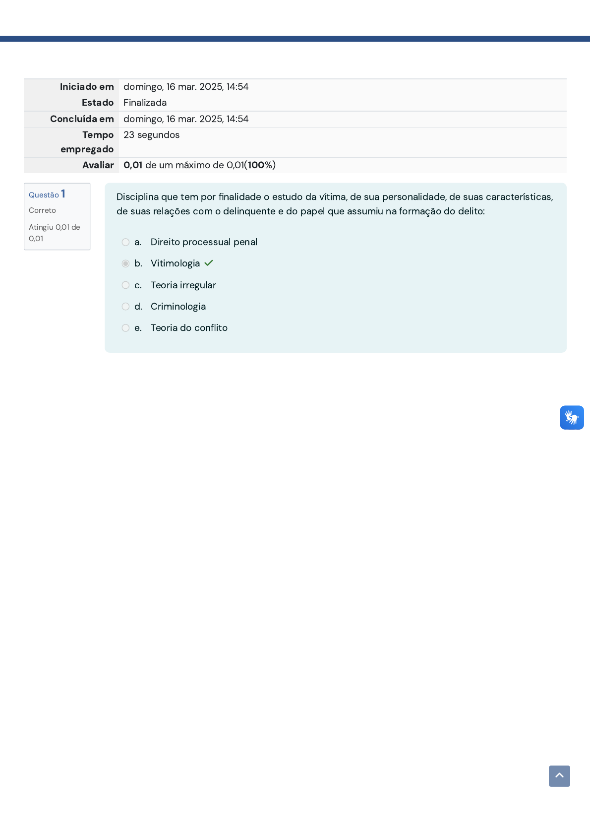Questão 1 Correto Atingiu 0,01 de 0,01 Iniciado em domingo, 16 mar. 2025, 14:54 Estado Finalizada Concluída em domingo, 16 mar. 2025, 14:54 Tempo empregado 23 segundos Avaliar 0,01 de um máximo de 0,01(100%) Disciplina que tem por finalidade o estudo da vítima, de sua personalidade, de suas características, de suas relações com o delinquente e do papel que assumiu na formação do delito: a. Direito processual penal b. Vitimologia ✓ c. Teoria irregular d. Criminologia e. Teoria do conflito ⌃ ⌃