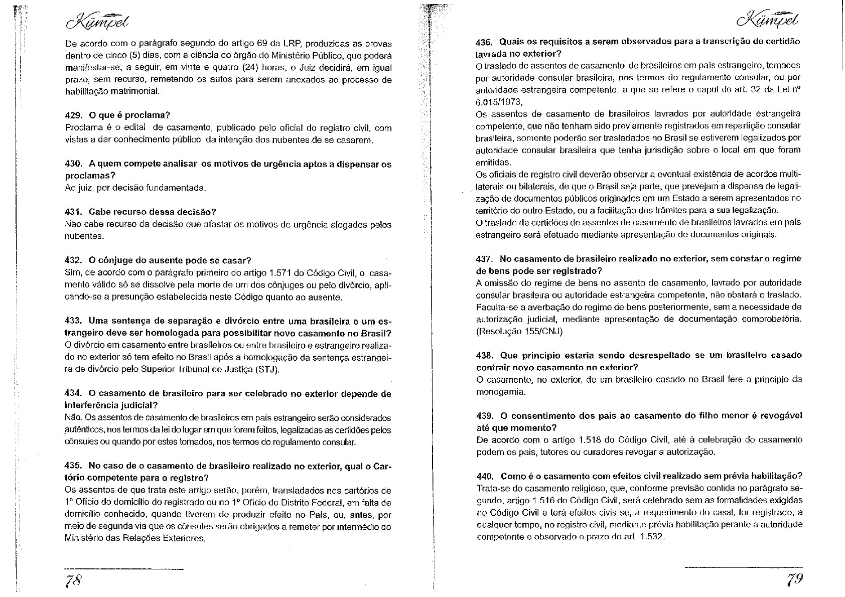 De acordo com o parágrafo segundo do artigo 69 da LRP, produzidas as provas dentro de cinco (5) dias, com a ciência do órgão do Ministério Público, que poderá manifestar-se, a seguir, em vinte e quatro (24) horas, o Juiz decidirá, em igual prazo, sem recurso, remetendo os autos para serem anexados ao processo de habilitação matrimonial.- 429. O que é proclama? Proclama é o edital de casamento, publicado pelo oficial do registro civil, com vistas a dar conhecimento público da intenção dos nubentes.de se casarem. 430. A quem compete analisar os motivos de urgência aptos a dispensar os proclamas? Ao juiz, por decisão fundamentada. 431. Cabe recurso dessa decisão? Não cabe recurso da decisão que afastar os motivos de urgência alegados pelos nubentes. 432. O cônjuge do ausente pode se casar? Sim, de acordo com o parágrafo primeiro do artigo 1.571 do Código Civil, o casa mento válido só se dissolve pela morte de um dos cônjuges ou pelo divórcio, apli- cando-se a presunção estabelecida neste Código quanto ao ausente. 433. Uma sentença de separação e divórcio entre uma brasileira e um es trangeiro deve ser homologada para possibilitar novo casamento no Brasi l? O divórcio em casamento entre brasileiros ou entre brasileiro e estrangeiro realiza do no exterior só tem efeito no Brasil após a homologação da sentença estrangei ra de divórcio pelo Superior Tribunal de Justiça (STJ). 434. O casamento de brasileiro para ser celebrado no exterior depende de interferência judicial? Não. Os assentos de casamento de brasileiros em país estrangeiro serão considerados autênticos, nos termos da lei do lugar em que forem feitos, legalizadas as certidões pelos cônsules ou quando por estes tomados, nos termos do regulamento consular. 435. No caso de o casamento de brasileiro realizado no exterior, qual o Car tório competente para o registro? Os assentos de que trata este artigo serão, porém, transladados nos cartórios de 1 o Ofício do domicílio do registrado ou no 1 o Ofício do Distrito Federal, em falta de domicílio conhecido, quando tiverem de produzir efeito no País, ou, antes, por meio de segunda via que os cônsules serão obrigados a remeter por intermédio do Ministério das Relações Exteriores. 78 cKüjnpel 436. Quais os requisitos a serem observados para a transcrição de certidão lavrada no exterior? O traslado de assentos de casamento de brasileiros em país estrangeiro, tomados por autoridade consular brasileira, nos termos do regulamento consular, ou por autoridade estrangeira competente, a que se refere o caput do art. 32 da Lei n° 6.015/1973, Os assentos de casamento de brasileiros lavrados por autoridade estrangeira competente, que não tenham sido previamente registrados em repartição consular brasileira, somente poderão ser trasladados no Brasil se estiverem legalizados por autoridade consular brasileira que tenha jurisdição sobre o local em que foram emitidas. Os oficiais de registro civil deverão observar a eventual existência de acordos multi laterais ou bilaterais, de que o Brasil seja parte, que prevejam a dispensa de legali zação de documentos públicos originados em um Estado a serem apresentados no território do outro Estado, ou a facilitação dos trâmites para a sua legalização. O traslado de certidões de assentos de casamento de brasileiros lavrados em país estrangeiro será efetuado mediante apresentação de documentos originais. 437. No casamento de brasileiro realizado no exterior, sem constar o regime de bens pode ser registrado? A omissão do regime de bens no assento de casamento, lavrado por autoridade consular brasileira ou autoridade estrangeira competente, não obstará o traslado. Faculta-se a averbação do regime de bens posteriormente, sem a necessidade de autorização judicial, mediante apresentação de documentação comprobatória. (Resolução 155/CNJ) 438. Que princípio estaria sendo desrespeitado se um brasileiro casado contrair novo casamento no exterior? O casamento, no exterior, de um brasileiro casado no Brasil fere a princípio da monogamia. 439. O consentimento dos pais ao casamento do filho menor é revogável até que momento? De acordo com o artigo 1.518 do Código Civil, até à celebração do casamento podem os pais, tutores ou curadores revogar a autorização. 440. Como é o casamento com efeitos civil realizado sem prévia habilitação? Trata-se do casamento religioso, que, conforme previsão contida no parágrafo se gundo, artigo 1.516 do Código Civil, será celebrado sem as formalidades exigidas no Código Civil e terá efeitos civis se, a requerimento do casal, for registrado, a qualquer tempo, no registro civil, mediante prévia habilitação perante a autoridade competente e observado o prazo do art. 1.532. 79 http://nubentes.de