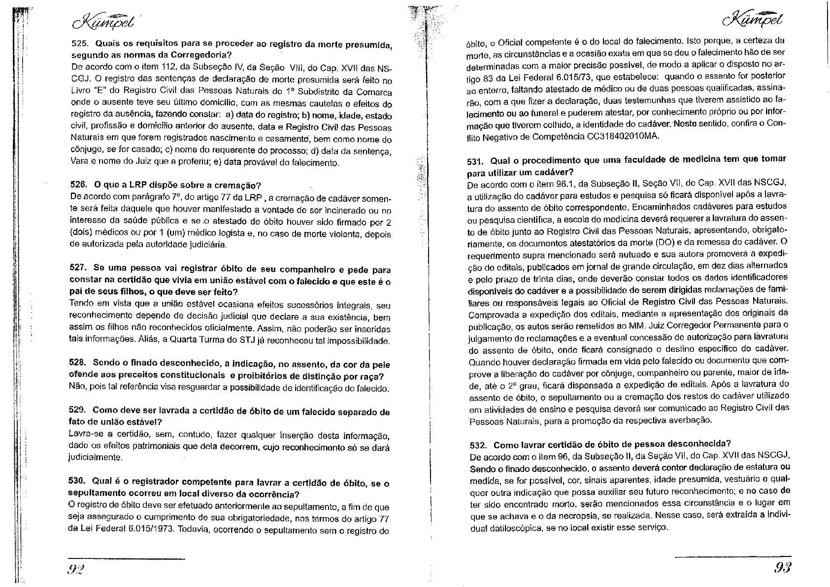 525. Quais os requisi tos para se proceder ao registro da morte presumida, segundo as normas da Corregedor ia? De acordo com o item 112, da Subseção IV, da Seção VIII, do Cap. XVII das NS- CGJ. O registro das sentenças de declaração de morte presumida será feito no Livro "E" do Registro Civil das Pessoas Naturais do 1 o Subdistrito da Comarca onde o ausente teve seu último domicílio, com as mesmas cautelas e efeitos do registro da ausencia, fazendo constar: a) data do registro; b) nome, idade, estado civil, profissão e domicilio anterior do ausente, data e Registro Civil das Pessoas Naturais em que forem registrados nascimento e casamento', bem como nome do cônjuge, se for casado; c) nome do requerente do processo; d) data da sentença, Vara e nome do Juiz que a proferiu; e) data provável do falecimento. 526. O que a LRP d ispõe sobre a cremação? De acordo com parágrafo 7 o , do artigo 77 da LRP, a cremação de cadáver somen te será feita daquele que houver manifestado a vontade de ser incinerado ou no interesse da saúde pública e se .o atestado de óbito houver sido firmado por 2 (dois) médicos ou por 1 (um) médico legista e, no caso de morte violenta, depois de autorizada pela autoridade judiciária. 527. Se uma pessoa vai registrar óbi to de seu companheiro e pede para constar na cert idão que viv ia em união estável com o falecido e que este é o pai de seus f i lhos, o que deve ser fe i to? Tendo em vista que a união estável ocasiona efeitos sucessórios integrais, seu reconhecimento depende de decisão judicial que declare a sua existência, bem assim os filhos não reconhecidos oficialmente. Assim, não poderão ser inseridas tais informações. Aliás, a Quarta Turma do STJ já reconheceu tal impossibilidade. 528. Sendo o f inado desconhecido, a indicação, no assento, da cor da pele ofende aos preceitos const i tuc ionais e pro ib i tór ios de d is t inção por raça? Não, pois tal referência visa resguardar a possibilidade de identificação do falecido. 529. Como deve ser lavrada a cert idão de óbi to de um falecido separado de fato de união estável? Lavra-se a certidão, sem, contudo, fazer qualquer inserção desta informação, dado os efeitos patrimoniais que dela decorrem, cujo reconhecimento só se dará judicialmente. 530. Qual é o registrador competente para lavrar a cert idão de óbi to , se o sepul tamento ocorreu em local d iverso da ocorrência? O registro de óbito deve ser efetuado anteriormente ao sepultamento, a fim de que seja assegurado o cumprimento de sua obrigatoriedade, nos termos do artigo 77 da Lei Federal 6.015/1973. Todavia, ocorrendo o sepultamento sem o registro do 92 óbito, o Oficial competente é o do local do falecimento. Isto porque, a certeza da morte, as circunstâncias e a ocasião exata em que se deu o falecimento hão de ser determinadas com a maior precisão possível, de modo a aplicar o disposto no ar tigo 83 da Lei Federal 6.015/73, que estabelece: quando o assento for posterior ao enterro, faltando atestado de médico ou de duas pessoas qualificadas, assina rão, com a que fizer a declaração, duas testemunhas que tiverem assistido ao fa lecimento ou ao funeral e puderem atestar, por conhecimento próprio ou por infor mação que tiverem colhido, a identidade do cadáver. Neste sentido, confira o Con flito Negativo de Competência CC31840201OMA. 531. Qual o procedimento que uma faculdade de medicina tem que tomar para uti l izar um cadáver? De acordo com o item 96.1, da Subseção II, Seção VII, do Cap. XVII das NSCGJ, a utilização do cadáver para estudos e pesquisa só ficará disponível após a lavra- tura do assento de óbito correspondente. Encaminhados cadáveres para estudos ou pesquisa científica, a escola de medicina deverá requerera lavratura do assen to de óbito junto ao Registro Civil das Pessoas Naturais, apresentando, obrigato riamente, os documentos atestatórios da morte (DO) e da remessa do cadáver. O requerimento supra mencionado será autuado e sua autora promoverá a expedi ção de editais, publicados em jornal de grande circulação, em dez dias alternados e pelo prazo de trinta dias, onde deverão constar todos os dados identificadores disponíveis do cadáver e a possibilidade de serem dirigidas reclamações de fami liares ou responsáveis legais ao Oficial de Registro Civil das Pessoas Naturais. Comprovada a expedição dos editais, mediante a apresentação dos originais da publicação, os autos serão remetidos ao MM. Juiz Corregedor Permanente para o julgamento de reclamações e a eventual concessão de autorização para lavratura do assento de óbito, onde ficará consignado o destino específico do cadáver. Quando houver declaração firmada em vida pelo falecido ou documento que com prove a liberação do cadáver por cônjuge, companheiro ou parente, maior de ida de, até o 2 o grau, ficará dispensada a expedição de editais. Após a lavratura do assento de óbito, o sepultamento ou a cremação dos restos do cadáver utilizado em ativldades de ensino e pesquisa deverá ser comunicado ao Registro Civil das Pessoas Naturais, para a promoção da respectiva averbação. 532. Como lavrar cert idão de óbi to de pessoa desconhecida? De acordo com o item 96, da Subseção II, da Seção VII, do Cap. XVII das NSCGJ, Sendo o finado desconhecido, o assento deverá conter declaração de estatura ou medida, se for possível, cor, sinais aparentes, idade presumida, vestuário e qual quer outra indicação que possa auxiliar seu futuro reconhecimento; e no caso de ter sido encontrado morto, serão mencionados essa circunstância e o lugar em que se achava e o da necropsia, se realizada. Nesse caso, será extraída a indivi dual datiloscópica, se no local existir esse serviço. 93