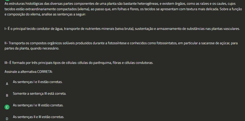 As estruturas histológicas das diversas partes componentes de uma planta são bastante heterogêneas, e existem como as raízes e os caules, cujos tecidos estão extraordinariamente compactados (xilema), ao passo que, em folhas e flores, os tecidos se apresentam com textura mais Sobre a função e composição do xilema, analise as sentenças a seguir: I- É principal tecido condutor de água, transporte de nutrientes minerais (seiva bruta), sustentação e armazenamento de substâncias nas plantas vasculares. II- Transporta os compostos orgânicos solúveis produzidos durante a fotossíntese e conhecidos como fotossintatos, em particular a sacarose de açúcar, para partes da planta, quando necessário. III- É formado por três principais tipos de células: células do fibras e células condutoras. Assinale a alternativa CORRETA: A As sentenças e II estão corretas. B Somente a sentença III está correta. As sentenças e III estão corretas. D As sentenças II e III estão corretas.