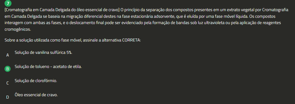 7 em Camada Delgada do óleo essencial de cravo] princípio da separação dos compostos presentes em um extrato vegetal por Cromatografia em Camada Delgada se baseia na migração diferencial destes na fase estacionária adsorvente, que é por uma fase móvel líquida. Os compostos interagem com ambas as fases, e deslocamento final pode ser evidenciado pela formação de bandas sob luz ultravioleta ou pela aplicação de reagentes cromogênicos. Sobre a solução utilizada como fase móvel, assinale a alternativa CORRETA: Solução de vanilina A B Solução de tolueno - acetato de etila. C Solução de clorofórmio. essencial de cravo. D