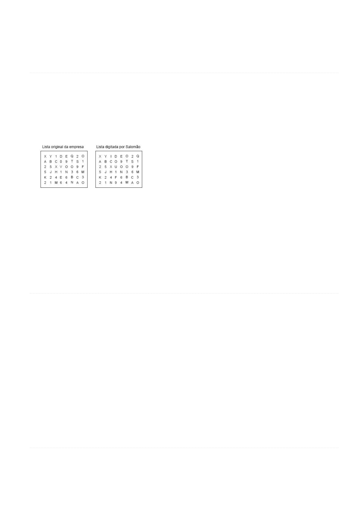 09/12/2017 Questões de Concursos e Perguntas de Concursos Públicos- Aprova Concursos https://www.aprovaconcursos.com.br/questoes-de-concurso/questoes/disciplina/Racioc%25C3%25ADnio+L%25C3%25B3gico/banca/FCC/filtro/2… 4/7 d) Carolina pode ser gaúcha. e) Marcos não é baiano. 593) Q31601 (/questoes-de-concurso/questao/31601) (/questoes-de-concurso/questao/31601#imprimir) Provas: FCC - 2011 - TRT - 24ª REGIÃO (MS) - Técnico Judiciário - Tecnologia da Informação (/questoes-de-concurso/prova/fcc-2011-trt-24-ordf-regiao-ms-tecnico-judiciario-tecnologia-da-informac FCC - 2011 - TRT - 24ª REGIÃO (MS) - Técnico Judiciário - Enfermagem (/questoes-de-concurso/prova/fcc-2011-trt-24-ordf-regiao-ms-tecnico-judiciario-enfermagem) FCC - 2011 - TRT - 24ª REGIÃO (MS) - Técnico Judiciário - Área Administrativa (/questoes-de-concurso/prova/fcc-2011-trt-24-ordf-regiao-ms-tecnico-judiciario-area-administrativa) Disciplina: Raciocínio Lógico (/questoes-de-concurso/disciplina/raciocinio-logico) - Assuntos: 1. Estruturas lógicas (tabela verdade) (/questoes-de-concurso/questoes/assunto/1.+Estruturas+l%C3%B3gicas+%28tabela+verdade%29) Certo escritório anunciou uma vaga para escriturários e uma das formas de seleção dos candidatos era testar sua habilidade em digitar textos, em que cada um recebia uma lista com uma sucessão de códigos, que deveria ser copiada. Embora não fosse um bom digitador, Salomão concorreu a essa vaga e o resultado de seu teste é mostrado abaixo. O número de erros cometidos por Salomão foi igual a a) 7. b) 8. c) 9. d) 10. e) 11. 594) Q10757 (/questoes-de-concurso/questao/10757) (/questoes-de-concurso/questao/10757#imprimir) Provas: FCC - 2011 - TCE-SE - Técnico de Controle Externo (/questoes-de-concurso/prova/fcc-2011-tce-se-tecnico-de-controle-externo) FCC - 2011 - TCE-SE - Técnico de Controle Externo - Edificações - Estradas (/questoes-de-concurso/prova/fcc-2011-tce-se-tecnico-de-controle-externo-edificacoes-estradas) Disciplina: Raciocínio Lógico (/questoes-de-concurso/disciplina/raciocinio-logico) Matemática (/questoes-de-concurso/disciplina/matematica) - Assuntos: 25. Análise combinatória ou princípio da contagem (/questoes-de-concurso/questoes/assunto/25.+An%C3%A1lise+combinat%C3%B3ria+ou+princ%C3%ADpio+da+contagem) Em uma repartição pública com 20 funcionários, 8 possuem o curso superior, 7 possuem o curso médio sem o curso superior e 5 possuem apenas o ensino fundamental. Deseja-se constituir um grupo de trabalho com estes funcionários para realizar uma determinada tarefa. Escolhendo aleatoriamente os funcionários, o número mínimo de funcionários que devem fazer parte do grupo de trabalho para se ter certeza de que pelo menos um funcionário possui curso superior é a) 8. b) 12. c) 13. d) 15. e) 16. 595) Q26413 (/questoes-de-concurso/questao/26413) (/questoes-de-concurso/questao/26413#imprimir) Provas: FCC - 2011 - TRT - 1ª REGIÃO (RJ) - Analista Judiciário - Tecnologia da Informação (/questoes-de-concurso/prova/fcc-2011-trt-1-ordf-regiao-rj-analista-judiciario-tecnologia-da-informacao) Disciplina: Raciocínio Lógico (/questoes-de-concurso/disciplina/raciocinio-logico) - Assuntos: 2. Operações aritméticas (/questoes-de-concurso/questoes/assunto/2.+Opera%C3%A7%C3%B5es+aritm%C3%A9ticas) https://www.aprovaconcursos.com.br/questoes-de-concurso/disciplina/raciocinio-logico https://www.aprovaconcursos.com.br/questoes-de-concurso/disciplina/raciocinio-logico https://www.aprovaconcursos.com.br/questoes-de-concurso/questao/26413 https://www.aprovaconcursos.com.br/questoes-de-concurso/prova/fcc-2011-trt-24-ordf-regiao-ms-tecnico-judiciario-enfermagem https://www.aprovaconcursos.com.br/questoes-de-concurso/prova/fcc-2011-tce-se-tecnico-de-controle-externo https://www.aprovaconcursos.com.br/questoes-de-concurso/prova/fcc-2011-trt-24-ordf-regiao-ms-tecnico-judiciario-tecnologia-da-informacao https://www.aprovaconcursos.com.br/questoes-de-concurso/prova/fcc-2011-trt-24-ordf-regiao-ms-tecnico-judiciario-area-administrativa https://www.aprovaconcursos.com.br/questoes-de-concurso/questoes/assunto/25.+An%C3%A1lise+combinat%C3%B3ria+ou+princ%C3%ADpio+da+contagem https://www.aprovaconcursos.com.br/questoes-de-concurso/questao/26413#imprimir https://www.aprovaconcursos.com.br/questoes-de-concurso/questoes/assunto/1.+Estruturas+l%C3%B3gicas+%28tabela+verdade%29 https://www.aprovaconcursos.com.br/questoes-de-concurso/prova/fcc-2011-tce-se-tecnico-de-controle-externo-edificacoes-estradas https://www.aprovaconcursos.com.br/questoes-de-concurso/questao/31601#imprimir https://www.aprovaconcursos.com.br/questoes-de-concurso/questao/31601 https://www.aprovaconcursos.com.br/questoes-de-concurso/disciplina/matematica https://www.aprovaconcursos.com.br/questoes-de-concurso/questao/10757#imprimir https://www.aprovaconcursos.com.br/questoes-de-concurso/disciplina/raciocinio-logico https://www.aprovaconcursos.com.br/questoes-de-concurso/questoes/assunto/2.+Opera%C3%A7%C3%B5es+aritm%C3%A9ticas https://www.aprovaconcursos.com.br/questoes-de-concurso/questao/10757 https://www.aprovaconcursos.com.br/questoes-de-concurso/prova/fcc-2011-trt-1-ordf-regiao-rj-analista-judiciario-tecnologia-da-informacao