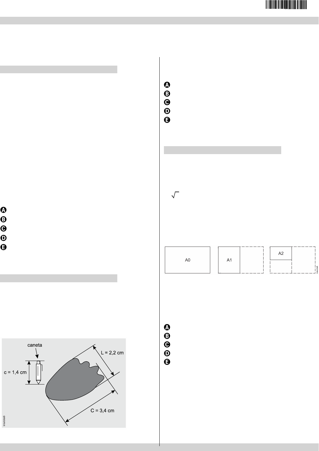 enem2021 /////////////////////////////////////////////////////////////////////////////////////////////////////////////////////////////////////////////////////////////////////////// /////////////////////////////////////////////////////////////////////////////////////////////////////////////////////////////////////////////////////////////////////////// I8020 – Help Educacional | Caderno de questões – Página 4 Questão 11(Enem 2016) /////////////////////////////////////////////////////////////// Em uma empresa de móveis, um cliente encomenda um guarda-roupa nas dimensões 220 cm de altura, 120 cm de largura e 50 cm de profundidade. Alguns dias depois, o projetista, com o desenho elaborado na escala 1: 8, entra em contato com o cliente para fazer sua apresentação. No momento da impressão, o profissional percebe que o desenho não caberia na folha de papel que costumava usar. Para resolver o problema, configurou a impressora para que a figura fosse reduzida em 20%. A altura, a largura e a profundidade do desenho impresso para a apresentação serão, respectivamente 22,00 cm,12,00 cm e 5,00 cm. 27,50 cm,15,00 cm e 6,50 cm. 34,37 cm,18,75 cm e 7,81cm. 35,20 cm,19,20 cm e 8,00 cm. 44,00 cm, 24,00 cm e 10,00 cm. Questão 12(Enem 2015) /////////////////////////////////////////////////////////////// Um pesquisador, ao explorar uma floresta, fotografou uma caneta de 16,8 cm de comprimento ao lado de uma pegada. O comprimento da caneta (c), a largura (L) e o comprimento (C) da pegada, na fotografia, estão indicados no esquema. A largura e o comprimento reais da pegada, em centímetros, são, respectivamente, iguais a 4,9 e 7,6. 8,6 e 9,8. 14,2 e 15,4. 26,4 e 40,8. 27,5 e 42,5. Questão 13(Enem PPL 2015) /////////////////////////////////////////////////////////////// O padrão internacional ISO 216 define os tamanhos de papel utilizados em quase todos os países. O formato-base é uma folha retangular de papel chamada de A0, cujas dimensões estão na razão 1: 2. A partir de então, dobra-se a folha ao meio, sempre no lado maior, definindo os demais formatos, conforme o número da dobradura. Por exemplo, A1 é a folha A0 dobrada ao meio uma vez, A2 é a folha A0 dobrada ao meio duas vezes, e assim sucessivamente, conforme a figura. Um tamanho de papel bastante comum em escritórios brasileiros é o A4, cujas dimensões são 21,0 cm por 29,7 cm. Quais são as dimensões, em centímetros, da folha A0? 21,0 118,8 84,0 29,7 84,0 118,8 168,0 237,6 336,0 475,2