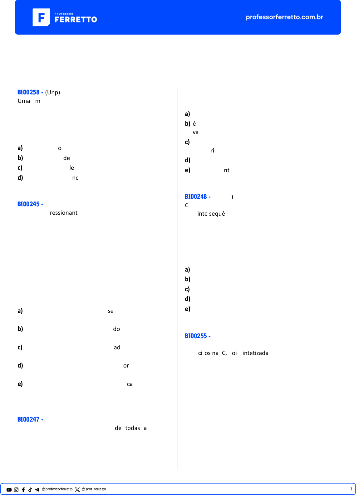 Biologia Molecular e Engenharia Genética - ENEM Código Genético - ENEM BIO0258 - (Unp) Uma mutação é uma alteração na sequência dos nucleo�deos do material gené�co de um organismo. Quando uma mutação altera o DNA do organismo dentro de um gene, mas não induz mudança na proteína codificada, podemos classificar essa mutação como: a) uma mutação neutra. b) uma mutação de sen�do trocado. c) uma mutação deletéria. d) uma mutação silenciosa. BIO0245 - (Fuvest) Há uma impressionante con�nuidade entre os seres vivos (...). Talvez o exemplo mais marcante seja o da conservação do código gené�co (...) em pra�camente todos os seres vivos. Um código gené�co de tal maneira “universal” é evidência de que todos os seres vivos são aparentados e herdaram os mecanismos de leitura do RNA de um ancestral comum. Morgante & Meyer, Darwin e a Biologia, O Biólogo 10:12– 20, 2009. O termo “código gené�co” refere-se a) ao conjunto de trincas de bases nitrogenadas, cada trinca correspondendo a um determinado aminoácido. b) ao conjunto de todos os genes dos cromossomos de uma célula, capazes de sinte�zar diferentes proteínas. c) ao conjunto de proteínas sinte�zadas a par�r de uma sequência específica de RNA. d) a todo o genoma de um organismo, formado pelo DNA de suas células somá�cas e reprodu�vas. e) à síntese de RNA a par�r de uma das cadeias do DNA, que serve de modelo. BIO0247 - (Fuvest) O código gené�co é o conjunto de todas as trincas possíveis de bases nitrogenadas (códons). A sequência de códons do RNA mensageiro determina a sequência de aminoácidos da proteína. É correto afirmar que o código gené�co a) varia entre os tecidos do corpo de um indivíduo. b) é o mesmo em todas as células de um indivíduo, mas varia de indivíduo para indivíduo. c) é o mesmo nos indivíduos de uma mesma espécie, mas varia de espécie para espécie. d) permite dis�nguir procariotos de eucariotos. e) é pra�camente o mesmo em todas as formas de vida. BIO0248 - (Unifor) Considere um segmento de molécula de DNA com a seguinte sequência de bases: - TGGAATAGACCGTTT – O número máximo de aminoácidos de um polipep�deo, formado pelo segmento considerado, é a) 1 b) 3 c) 5 d) 10 e) 15 BIO0255 - (Uerj) Uma molécula de RNAm, composta pelas bases adenina– A e citosina–C, foi sinte�zada experimentalmente. Sua estrutura está representada no esquema abaixo: C – A – C – A – C – A – C – A – C – A – C – A – C – A – C – A – C – A Suponha que a síntese de um pep�deo possa ser iniciada a par�r de qualquer um dos extremos dessa estrutura de RNAm, sem necessidade de código de iniciação ou de terminação. Nestas condições, o número de diferentes �pos de aminoácidos encontrados nos pep�deos formados será: 1@professorferretto @prof_ferretto a) 4 b) 3 c) 2 d) 1 BIO0249 - (Fuvest) Uma mutação, responsável por uma doença sanguínea, foi iden�ficada numa família. Abaixo estão representadas sequências de bases nitrogenadas, normal e mutante; nelas estão destacados o sí�o de início da tradução e a base alterada. O ácido nucléico representado acima e o número de aminoácidos codificados pela sequência de bases, entre o sí�o de início da tradução e a mutação, estão corretamente indicados em: a) DNA; 8. b) DNA; 24. c) DNA; 12. d) RNA; 8. e) RNA; 24. BIO0244 - (Enem) Um estudante relatou que o mapeamento do DNA da cevada foi quase todo concluído e seu código gené�co desvendado. Chamou atenção para o número de genes que compõem esse código gené�co e que a semente da cevada, apesar de pequena, possui um genoma mais complexo que o humano, sendo boa parte desse código cons�tuída de sequências repe�das. Nesse contexto, o conceito de código gené�co está abordado de forma equivocada. Cien�ficamente, esse conceito é definido como a) trincas de nucleo�deos que codificam os aminoácidos. b) localização de todos os genes encontrados em um genoma. c) codificação de sequências repe�das presentes em um genoma. d) conjunto de todos os RNAs mensageiros transcritos em um organismo. e) todas as sequências de pares de bases presentes em um organismo. BIO0256 - (Uerj) Observe a sequência de bases nitrogenadas que compõem a porção inicial de um RNA mensageiro transcrito em uma determinada proteína de uma célula eucariota: AUGGCUAAAUUAGAC.......... Nessa proteína, o aminoácido introduzido pelo códon iniciador foi removido durante o processo de síntese. Admita que uma mutação tenha a�ngido o códon correspondente ao aminoácido número 3 da estrutura primária desse polipep�deo, acarretando a troca de uma base A, na célula original, pela base U, na célula mutante. A tabela abaixo permite a iden�ficação dos códons dos aminoácidos encontrados tanto na proteína original como na mutante, codificados pelo trecho inicial desse RNA mensageiro: Agora, a estrutura primária da proteína mutante tem como terceiro aminoácido: 2@professorferretto @prof_ferretto a) �rosina. b) leucina. c) triptofano. d) fenilalanina. BIO0260 - (Ufrgs) A sequência abaixo corresponde a um trecho de DNA específico que sofreu uma mutação gênica por subs�tuição de um nucleo�deo na 5ª posição. RNAm: AUG = me�onina; CAC = his�dina; CUC = leucina; CUG = leucina; ACU = treonina; CCU = prolina Sobre a mutação que ocorreu na sequência de DNA acima, é correto afirmar que a) gera uma cadeia polipep�dica com um aminoácido a menos. b) aumenta o número de códons do RNAm. c) é silenciosa, aumentando a variabilidade gené�ca da espécie. d) altera o módulo de leitura do RNAm e o tamanho da proteína. e) causa a subs�tuição de um aminoácido na proteína. BIO0257 - (Unichristus) A determinação da sequência de aminoácidos de todas as proteínas da espécie humana e de outros seres vivos é de extrema importância. A par�r da