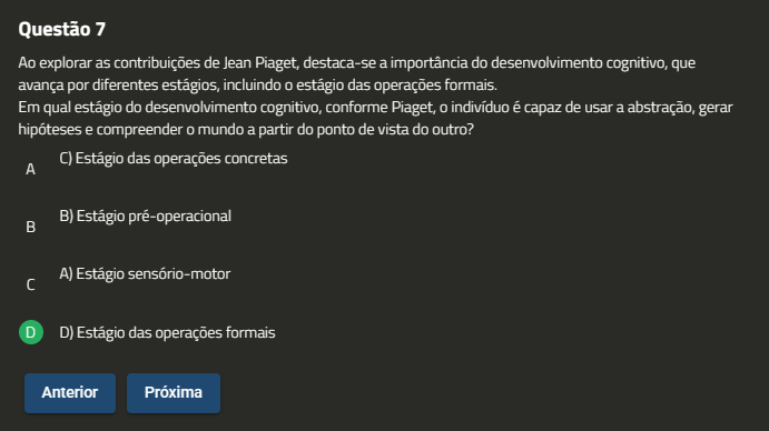 Questão 7 Ao explorar as contribuições de Jean Piaget, destaca-se a importância do desenvolvimento cognitivo, que avança por diferentes estágios, incluindo estágio das operações formais. Em qual estágio do desenvolvimento cognitivo, conforme Piaget, indivíduo é capaz de usar a abstração, gerar e compreender mundo a partir do ponto de vista do outro? C) Estágio das operações concretas A B) Estágio pré-operacional B A) Estágio sensório-motor C D D) Estágio das operações formais Anterior Próxima