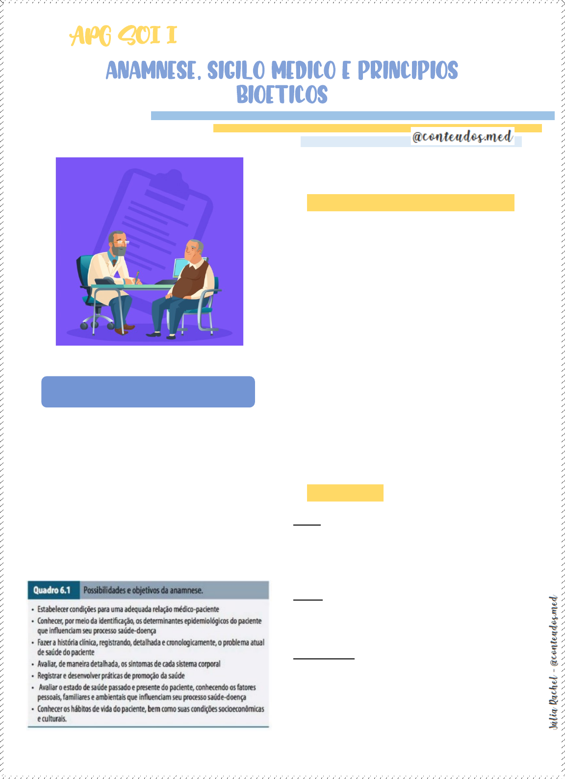Anamnese (aná = trazer de novo e mnesis = memória) significa trazer de volta à mente todos os fatos relacionados com a doença e com a pessoa doente. A anamnese é um instrumento para a avaliação de sintomas, problemas de saúde e preocupações, e registra a maneira como a pessoa responde a essas situações, abrindo espaço para a promoção de saúde. ELEMENTOS COMPONENTES DA ANAMNESE A anamnese é classicamente desdobrada nas seguintes partes: . Identificação; . Queixa principal; . História da doença atual (HDA); . Interrogatório sintomatológico (IS); . Antecedentes pessoais e familiares; . Hábitos de vida; . Condições socioeconômicas e culturais. IDENTIFICAÇÃO Nome: primeiro dado da identificação. “Paciente do leito 5” ou “aquele caso de cirrose hepática da enfermaria 7” são expressões que jamais devem ser usadas para caracterizar uma pessoa. Idade: cada grupo etário tem sua própria doença e bastaria essa assertiva para tornar clara a importância da idade. Sexo/gênero: não se falando nas diferenças fisiológicas, sempre importantes do ponto de vista clinico, há enfermidades que só ocorrem em determinado sexo. ANAMNESE Cor/etnia: a influência da etnia no processo do adoecimento conta com muitos exemplos, o mais conhecido é o da anemia falciforme, uma alteração sanguínea específica dos negros, mas que, em virtude da miscigenação, pode ocorrer em pessoas de outra cor. Estado civil: não só os aspectos sociais referentes ao estado civil podem ser úteis ao examinador. Aspectos médico-trabalhistas e periciais podem estar envolvidos. Profissão: é um dado de crescente importância na prática médica. Naturalidade: local onde o paciente nasceu. Procedência: esse item geralmente se refere à residência anterior do paciente. Residência: quanto a esse item, anota-se a residência atual. Nome da mãe: anotar o nome da mãe do paciente é, hoje, uma regra bastante comum nos hospitais no sentido de diferenciar os pacientes homônimos. Religião: a religião à qual o paciente se filia tem relevância no processo saúde-doença. QUEIXA PRINCIPAL Nesse item, registra-se a queixa principal ou o motivo que levou o paciente a procurar o médico, repetindo, se possível, as expressões por ele utilizadas. É uma afirmação breve e espontânea, geralmente um sinal ou um sintoma, suscitador nas próprias palavras da pessoa, que descreve o motivo da consulta. Geralmente, é uma anotação entre aspas para indicar que se trata das palavras exatas do paciente. HISTÓRIA DA DOENÇA ATUAL A história da doença atual (HDA) é um registro cronológico e detalhado do motivo que levou o paciente a procurar assistência médica, desde o seu início até a data atual. Início: deve ser caracterizado com relação à época de aparecimento. Se foi de início súbito ou gradativo, se teve fator desencadeante ou não. Características do sintoma: definir localização, duração, intensidade, frequência, tipo, ou seja, características próprias a depender do sintoma. Fatores de melhora ou piora: definir quais fatores melhoram e pioram o sintoma, como, por exemplo, fatores ambientais, posição, atividade física ou repouso, alimentos ou uso de medicamentos. Relação com outras queixas: registrar se existe alguma manifestação ou queixa que acompanhe o sintoma, geralmente relacionado com o segmento anatômico ou funcional acometido pelo sintoma. Evolução: registrar o comportamento do sintoma ao longo do tempo, relatando modificações das características e influencia de tratamentos efetuados. Situação atual: registrar como o sintoma está no momento da anamnese também é importante. “Qual o motivo da consulta?” “Por que o (a) senhor(a) me procurou?” “O que o (a) senhor(a) está sentindo?” “O que o (a) está incomodando?” INTERROGATÓRIO SINTOMATOLÓGICO . Sintomas gerais; . Pele e fâneros; . Cabeça e pescoço; . Tórax; . Abdome; . Sistema geniturinário; . Sistema hemolinfopoético; . Sistema endócrino; . Coluna vertebral, ossos, articulações e extremidades; . Músculos; . Artérias, veias, vasos linfáticos e microcirculação; . Sistema nervoso; . Exame psíquico e avaliação das condições emocionais. ANTECEDENTES PESSOAIS FISIOLÓGICOS . Gestação e nascimento; . Desenvolvimento psicomotor e neural; . Desenvolvimento sexual. Permita ao paciente falar de sua doença. Determine o sintoma-guia. Descreva o sintoma-guia com suas características e analise-o. Use o sintoma-guia como condutor da história e estabeleça as relações das outras queixas com ele em ordem cronológica. Verifique se a história obtida tem começo, meio e fim. Não induza respostas. Apure evolução, exames e tratamentos realizados em relação à doença atual. Leia a história escrita por você para o paciente para que ele possa confirmar ou corrigir algum dado relatado, ou mesmo acrescentar alguma queixa esquecida. Sintomas Gerais Febre: sensação de aumento da temperatura corporal acompanhada ou não de outros sintomas, quando, então, caracteriza-se a síndrome febril (cefaleia, calafrios, sede, etc). Astenia: sensação de fraqueza. Alterações do peso: especificar perda ou ganho de peso, quantos quilos, intervalo de tempo e motivo (dieta, estresse, outros fatores). Sudorese: eliminação abundante de suor, generalizada ou predominante nas mãos e nos pés. Calafrios: sensação momentânea de frio com ereção de pêlos e arrepiamento da pele. Cãibras: contrações involuntárias de um músculo ou grupo muscular. ANTECEDENTES PESSOAIS PATOLÓGICOS . Doenças sofridas pelo paciente; . Alergias; . Cirurgias; . Traumatismo; . Transfusão sanguínea; . História obstétrica; . Imunizações; . Medicamentos em uso. ANTECEDENTES FAMILIARES Os antecedentes começam com a menção ao estado de saúde (quando vivos) dos pais e irmãos do paciente. Se for casado, inclui-se o cônjuge e, se tiver filhos, estes são referidos. Não se esquecer dos avós, t