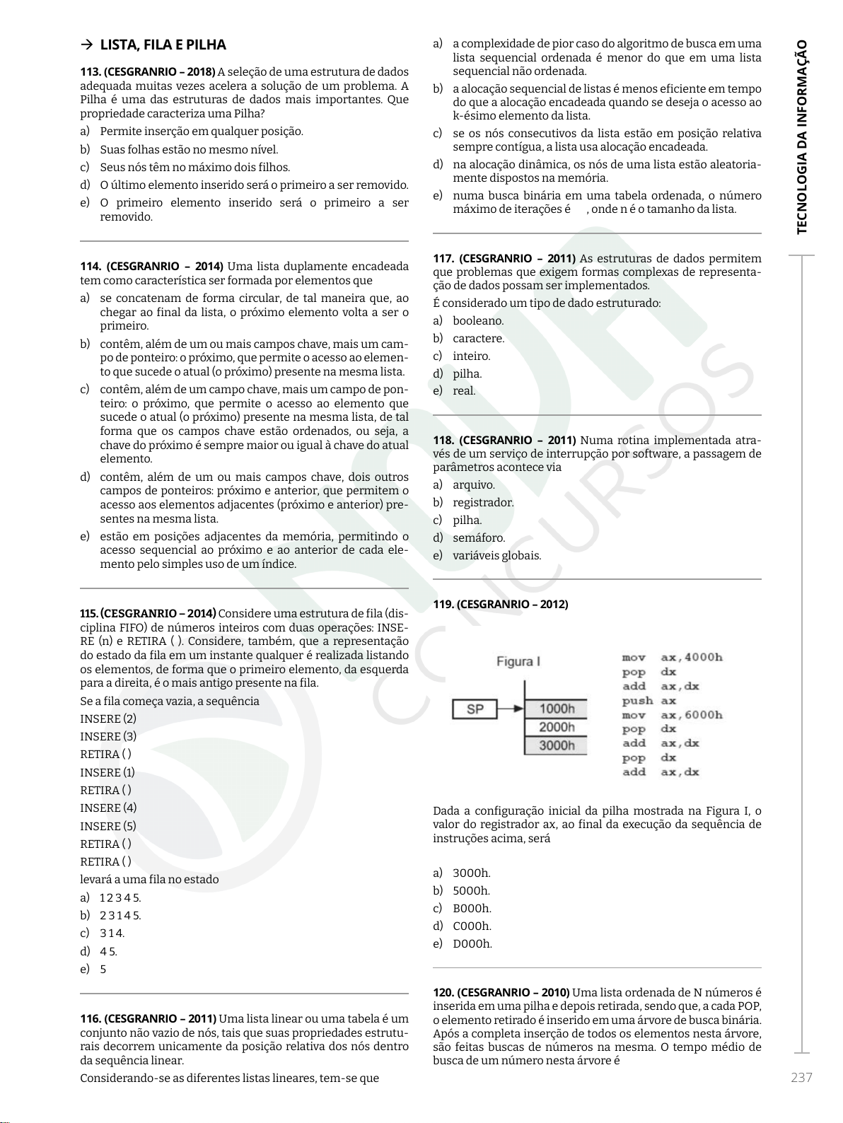 ped ro lu ca s s ilv a b ar bosa to rre s - 14 4.1 29 .14 4- 02 TE CN O LO G IA D A IN FO RM A ÇÃ O 237 Æ LISTA, FILA E PILHA 113. (CESGRANRIO – 2018) A seleção de uma estrutura de dados adequada muitas vezes acelera a solução de um problema. A Pilha é uma das estruturas de dados mais importantes. Que propriedade caracteriza uma Pilha? a) Permite inserção em qualquer posição. b) Suas folhas estão no mesmo nível. c) Seus nós têm no máximo dois filhos. d) O último elemento inserido será o primeiro a ser removido. e) O primeiro elemento inserido será o primeiro a ser removido. 114. (CESGRANRIO – 2014) Uma lista duplamente encadeada tem como característica ser formada por elementos que a) se concatenam de forma circular, de tal maneira que, ao chegar ao final da lista, o próximo elemento volta a ser o primeiro. b) contêm, além de um ou mais campos chave, mais um cam- po de ponteiro: o próximo, que permite o acesso ao elemen- to que sucede o atual (o próximo) presente na mesma lista. c) contêm, além de um campo chave, mais um campo de pon- teiro: o próximo, que permite o acesso ao elemento que sucede o atual (o próximo) presente na mesma lista, de tal forma que os campos chave estão ordenados, ou seja, a chave do próximo é sempre maior ou igual à chave do atual elemento. d) contêm, além de um ou mais campos chave, dois outros campos de ponteiros: próximo e anterior, que permitem o acesso aos elementos adjacentes (próximo e anterior) pre- sentes na mesma lista. e) estão em posições adjacentes da memória, permitindo o acesso sequencial ao próximo e ao anterior de cada ele- mento pelo simples uso de um índice. 115. (CESGRANRIO – 2014) Considere uma estrutura de fila (dis- ciplina FIFO) de números inteiros com duas operações: INSE- RE (n) e RETIRA ( ). Considere, também, que a representação do estado da fila em um instante qualquer é realizada listando os elementos, de forma que o primeiro elemento, da esquerda para a direita, é o mais antigo presente na fila. Se a fila começa vazia, a sequência INSERE (2) INSERE (3) RETIRA ( ) INSERE (1) RETIRA ( ) INSERE (4) INSERE (5) RETIRA ( ) RETIRA ( ) levará a uma fila no estado a) 1 2 3 4 5. b) 2 3 1 4 5. c) 3 1 4. d) 4 5. e) 5 116. (CESGRANRIO – 2011) Uma lista linear ou uma tabela é um conjunto não vazio de nós, tais que suas propriedades estrutu- rais decorrem unicamente da posição relativa dos nós dentro da sequência linear. Considerando-se as diferentes listas lineares, tem-se que a) a complexidade de pior caso do algoritmo de busca em uma lista sequencial ordenada é menor do que em uma lista sequencial não ordenada. b) a alocação sequencial de listas é menos eficiente em tempo do que a alocação encadeada quando se deseja o acesso ao k-ésimo elemento da lista. c) se os nós consecutivos da lista estão em posição relativa sempre contígua, a lista usa alocação encadeada. d) na alocação dinâmica, os nós de uma lista estão aleatoria- mente dispostos na memória. e) numa busca binária em uma tabela ordenada, o número máximo de iterações é , onde n é o tamanho da lista. 117. (CESGRANRIO – 2011) As estruturas de dados permitem que problemas que exigem formas complexas de representa- ção de dados possam ser implementados. É considerado um tipo de dado estruturado: a) booleano. b) caractere. c) inteiro. d) pilha. e) real. 118. (CESGRANRIO – 2011) Numa rotina implementada atra- vés de um serviço de interrupção por software, a passagem de parâmetros acontece via a) arquivo. b) registrador. c) pilha. d) semáforo. e) variáveis globais. 119. (CESGRANRIO – 2012) Dada a configuração inicial da pilha mostrada na Figura I, o valor do registrador ax, ao final da execução da sequência de instruções acima, será a) 3000h. b) 5000h. c) B000h. d) C000h. e) D000h. 120. (CESGRANRIO – 2010) Uma lista ordenada de N números é inserida em uma pilha e depois retirada, sendo que, a cada POP, o elemento retirado é inserido em uma árvore de busca binária. Após a completa inserção de todos os elementos nesta árvore, são feitas buscas de números na mesma. O tempo médio de busca de um número nesta árvore é O conteúdo deste livro eletrônico é licenciado para pedro lucas silva barbosa torres - 144.129.144-02, vedada, por quaisquer meios e a qualquer título, a sua reprodução, cópia, divulgação ou distribuição, sujeitando-se aos infratores à responsabilização civil e criminal.