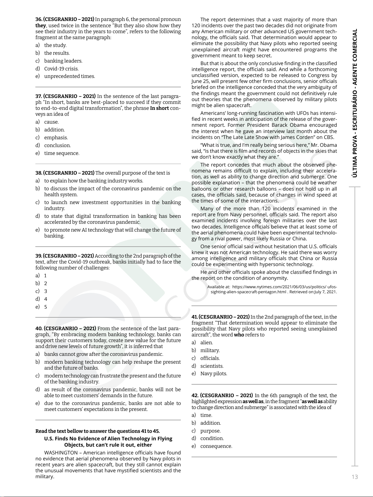 ped ro lu ca s s ilv a b ar bosa to rre s - 14 4.1 29 .14 4- 02 Ú LT IM A P RO VA - ES CR IT U RÁ RI O - A G EN TE C O M ER CI A L 13 36. (CESGRANRIO – 2021) In paragraph 6, the personal pronoun they, used twice in the sentence “But they also show how they see their industry in the years to come”, refers to the following fragment at the same paragraph: a) the study. b) the results. c) banking leaders. d) Covid-19 crisis. e) unprecedented times. 37. (CESGRANRIO – 2021) In the sentence of the last paragra- ph “In short, banks are best-placed to succeed if they commit to end-to-end digital transformation”, the phrase In short con- veys an idea of a) cause. b) addition. c) emphasis. d) conclusion. e) time sequence. 38. (CESGRANRIO – 2021) The overall purpose of the text is a) to explain how the banking industry works. b) to discuss the impact of the coronavirus pandemic on the health system. c) to launch new investment opportunities in the banking industry. d) to state that digital transformation in banking has been accelerated by the coronavirus pandemic. e) to promote new AI technology that will change the future of banking. 39. (CESGRANRIO – 2021) According to the 2nd paragraph of the text, after the Covid-19 outbreak, banks initially had to face the following number of challenges: a) 1 b) 2 c) 3 d) 4 e) 5 40. (CESGRANRIO – 2021) From the sentence of the last para- graph, “By embracing modern banking technology, banks can support their customers today, create new value for the future and drive new levels of future growth”, it is inferred that a) banks cannot grow after the coronavirus pandemic. b) modern banking technology can help reshape the present and the future of banks. c) modern technology can frustrate the present and the future of the banking industry. d) as result of the coronavirus pandemic, banks will not be able to meet customers’ demands in the future. e) due to the coronavirus pandemic, banks are not able to meet customers’ expectations in the present. Read the text bellow to answer the questions 41 to 45. U.S. Finds No Evidence of Alien Technology in Flying Objects, but can’t rule it out, either WASHINGTON – American intelligence officials have found no evidence that aerial phenomena observed by Navy pilots in recent years are alien spacecraft, but they still cannot explain the unusual movements that have mystified scientists and the military. The report determines that a vast majority of more than 120 incidents over the past two decades did not originate from any American military or other advanced US government tech- nology, the officials said. That determination would appear to eliminate the possibility that Navy pilots who reported seeing unexplained aircraft might have encountered programs the government meant to keep secret. But that is about the only conclusive finding in the classified intelligence report, the officials said. And while a forthcoming unclassified version, expected to be released to Congress by June 25, will present few other firm conclusions, senior officials briefed on the intelligence conceded that the very ambiguity of the findings meant the government could not definitively rule out theories that the phenomena observed by military pilots might be alien spacecraft. Americans’ long-running fascination with UFOs has intensi- fied in recent weeks in anticipation of the release of the gover- nment report. Former President Barack Obama encouraged the interest when he gave an interview last month about the incidents on “The Late Late Show with James Corden” on CBS. “What is true, and I’m really being serious here,” Mr. Obama said, “is that there is film and records of objects in the skies that we don’t know exactly what they are.’’ The report concedes that much about the observed phe- nomena remains difficult to explain, including their accelera- tion, as well as ability to change direction and submerge. One possible explanation – that the phenomena could be weather balloons or other research balloons – does not hold up in all cases, the officials said, because of changes in wind speed at the times of some of the interactions. Many of the more than 120 incidents examined in the report are from Navy personnel, officials said. The report also examined incidents involving foreign militaries over the last two decades. Intelligence officials believe that at least some of the aerial phenomena could have been experimental technolo- gy from a rival power, most likely Russia or China. One senior official said without hesitation that U.S. officials knew it was not American technology. He said there was worry among intelligence and military officials that China or Russia could be experimenting with hypersonic technology. He and other officials spoke about the classified findings in the report on the condition of anonymity. Available at: https://www.nytimes.com/2021/06/03/us/politics/ ufos- sighting-alien-spacecraft-pentagon.html . Retrieved on:July 7, 2021. 41. (CESGRANRIO – 2021) In the 2nd paragraph of the text, in the fragment “That determination would appear to eliminate the possibility that Navy pilots who reported seeing unexplained aircraft”, the word who refers to a) alien. b) military. c) officials. d) scientists. e) Navy pilots. 42. (CESGRANRIO – 2021) In the 6th paragraph of the text, the highlighted expression as well as, in the fragment “as well as ability to change direction and submerge” is associated with the idea of a) time. b) addition. c) purpose. d) condition. e) consequence. O conteúdo deste livro eletrônico é licenciado para pedro lucas silva barbosa torres - 144.129.144-02, vedada, por quaisquer meios e a qualquer título, a sua reprodução, cópia, divulgação ou distribuição, sujeitando-se aos infratores à responsabilização civil e criminal.