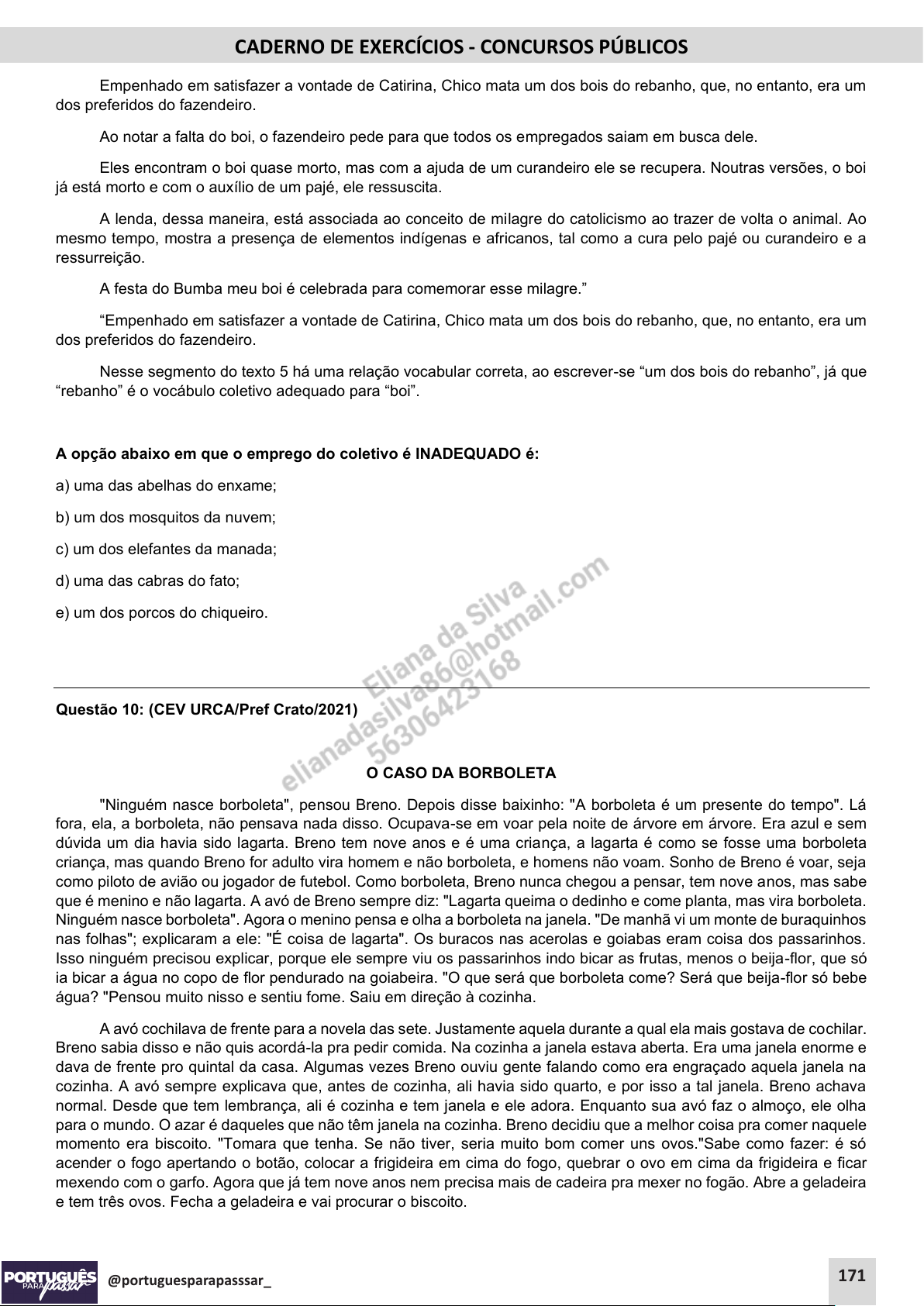 @portuguesparapasssar_ CADERNO DE EXERCÍCIOS - CONCURSOS PÚBLICOS 4 Questão 8: (OBJETIVA CONCURSOS/Pref Sta Maria (RS) /2021) POR QUE É TÃO DIFÍCIL MATAR UMA MOSCA? As moscas passeiam pela nossa casa sem a menor pressa. Mas, quando tentamos alcançá-las, elas se esquivam com facilidade. Isso é possível porque, no tempo de um piscar os olhos – cerca de 100 milésimos de segundo –, o inseto é capaz de perceber uma ameaça, detectar a direção da qual ela vem e decolar na direção certa para se esquivar do golpe, batendo as asas 220 vezes por segundo. Essa agilidade toda é fruto de adaptações geradas por seleção natural após milhares de anos de tapas. O primeiro passo é detectar a mão se aproximando. Uma mosca doméstica tem olhos compostos, formados por mais de 3 mil minúsculas estruturas chamadas omatídeos. Eles fornecem quase 360 graus de visão periférica. Além disso, ela possui uma grande quantidade de sensores espalhados pelo corpo que detectam perturbações na atmosfera circundante e na superfície em que está apoiada. Por fim, as moscas enxergam cerca de 250 frames por segundo (um ser humano fica em aproximadamente 24). Trata-se de uma resolução temporal altíssima – é como se o tempo passasse em câmera lenta para esses animaizinhos. Além de reconhecer rapidamente uma ameaça, as moscas também são voadoras ágeis. Os músculos que controlam as asas só precisam de um pontapé inicial do sistema nervoso – mas, uma vez postos em movimento, repetem as oscilações automaticamente, sem necessidade de um novo comando. É isso que permite que elas batam as asas tão rapidamente. Outro fator que auxilia o tempo de reação das moscas é a presença de um par de estruturas peculiares no tórax, chamadas de halteres ou balancins. Os halteres são, na verdade, asas super modificadas, cobertas por sensores que auxiliam na estabilidade durante o voo – o que permite à mosca executar manobras muito rápidas. Os olhos minuciosos, as asas com musculatura potente e os halteres conferem à mosca reflexos com que o Homo sapiens, comparativamente tão grande e pesado, não pode concorrer. É como o imenso Thanos tentando acertar o frágil Homem-Formiga em um filme da Marvel: no tempo que o braço do vilão demora para ir, o herói já está voltando. (Site: Abril - adaptado.) Em relação à flexão de gênero, assinalar a alternativa que apresenta correspondência INCORRETA: a) Czar - czarina. b) Abade - abadessa. c) Frei - sóror. d) Grou - groua. e) Padre - madre. Questão 9: (FGV/Auditoria Governamental/2021) TEXTO 5 – HISTÓRIA DA LENDA DO BUMBA MEU BOI “No Nordeste, a história do Bumba meu boi foi inspirada na lenda da Mãe Catirina e do Pai Francisco (Chico). Nessa versão, Mãe Catirina e Pai Francisco são um casal de negros trabalhadores de uma fazenda. Quando Mãe Catirina fica grávida, ela tem desejo de comer a língua de um boi. CADERNO DE EXERCÍCIOS - CONCURSOS PÚBLICOS 5 Empenhado em satisfazer a vontade de Catirina, Chico mata um dos bois do rebanho, que, no entanto, era um dos preferidos do fazendeiro. Ao notar a falta do boi, o fazendeiro pede para que todos os empregados saiam em busca dele. Eles encontram o boi quase morto, mas com a ajuda de um curandeiro ele se recupera. Noutras versões, o boi já está morto e com o auxílio de um pajé, ele ressuscita. A lenda, dessa maneira, está associada ao conceito de milagre do catolicismo ao trazer de volta o animal. Ao mesmo tempo, mostra a presença de elementos indígenas e africanos, tal como a cura pelo pajé ou curandeiro e a ressurreição. A festa do Bumba meu boi é celebrada para comemorar esse milagre.” “Empenhado em satisfazer a vontade de Catirina, Chico mata um dos bois do rebanho, que, no entanto, era um dos preferidos do fazendeiro. Nesse segmento do texto 5 há uma relação vocabular correta, ao escrever-se “um dos bois do rebanho”, já que “rebanho” é o vocábulo coletivo adequado para “boi”. A opção abaixo em que o emprego do coletivo é INADEQUADO é: a) uma das abelhas do enxame; b) um dos mosquitos da nuvem; c) um dos elefantes da manada; d) uma das cabras do fato; e) um dos porcos do chiqueiro. Questão 10: (CEV URCA/Pref Crato/2021) O CASO DA BORBOLETA "Ninguém nasce borboleta", pensou Breno. Depois disse baixinho: "A borboleta é um presente do tempo". Lá fora, ela, a borboleta, não pensava nada disso. Ocupava-se em voar pela noite de árvore em árvore. Era azul e sem dúvida um dia havia sido lagarta. Breno tem nove anos e é uma criança, a lagarta é como se fosse uma borboleta criança, mas quando Breno for adulto vira homem e não borboleta, e homens não voam. Sonho de Breno é voar, seja como piloto de avião ou jogador de futebol. Como borboleta, Breno nunca chegou a pensar, tem nove anos, mas sabe que é menino e não lagarta. A avó de Breno sempre diz: "Lagarta queima o dedinho e come planta, mas vira borboleta. Ninguém nasce borboleta". Agora o menino pensa e olha a borboleta na janela. "De manhã vi um monte de buraquinhos nas folhas"; explicaram a ele: "É coisa de lagarta". Os buracos nas acerolas e goiabas eram coisa dos passarinhos. Isso ninguém precisou explicar, porque ele sempre viu os passarinhos indo bicar as frutas, menos o beija-flor, que só ia bicar a água no copo de flor pendurado na goiabeira. "O que será que borboleta come? Será que beija-flor só bebe água? "Pensou muito nisso e sentiu fome. Saiu em direção à cozinha. A avó cochilava de frente para a novela das sete. Justamente aquela durante a qual ela mais gostava de cochilar. Breno sabia disso e não quis acordá-la pra pedir comida. Na cozinha a janela estava aberta. Era uma janela enorme e dava de frente pro quintal da casa. Algumas vezes Breno ouviu gente falando como era engraçado aquela janela na cozinha. A avó sempre explicava que, antes de cozinha, ali havia sido quarto, e por isso a tal janela. Breno achava normal. Desde que tem lembran