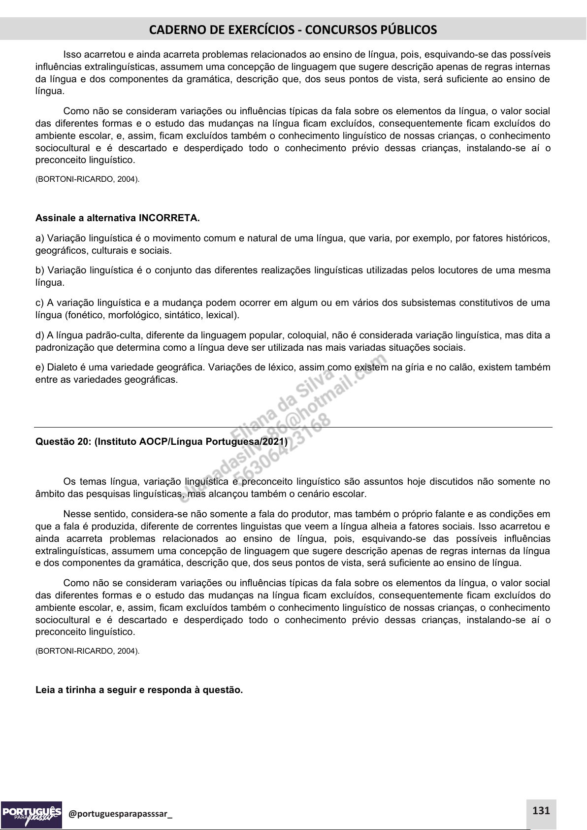 @portuguesparapasssar_ CADERNO DE EXERCÍCIOS - CONCURSOS PÚBLICOS 15 Questão 18: (UFMT/UFR/2021) Leia a charge abaixo. A respeito do uso da linguagem na comunicação entre as personagens da charge, assinale a afirmativa correta. a) A linguagem verbal está adequada ao contexto em que é usada. b) A circunstância em que ocorreu a interlocução viabilizou o significado da mensagem. c) A incoerência entre o uso da linguagem verbal e o contexto inviabilizou o entendimento da mensagem pelo interlocutor. d) A decodificação da mensagem se estabelece entre os interlocutores, porque ambos dispõem de um mesmo repertório cultural. Questão 19: (Instituto AOCP/Língua Portuguesa/2021) Os temas língua, variação linguística e preconceito linguístico são assuntos hoje discutidos não somente no âmbito das pesquisas linguísticas, mas alcançou também o cenário escolar. Nesse sentido, considera-se não somente a fala do produtor, mas também o próprio falante e as condições em que a fala é produzida, diferente de correntes linguistas que veem a língua alheia a fatores sociais. CADERNO DE EXERCÍCIOS - CONCURSOS PÚBLICOS 16 Isso acarretou e ainda acarreta problemas relacionados ao ensino de língua, pois, esquivando-se das possíveis influências extralinguísticas, assumem uma concepção de linguagem que sugere descrição apenas de regras internas da língua e dos componentes da gramática, descrição que, dos seus pontos de vista, será suficiente ao ensino de língua. Como não se consideram variações ou influências típicas da fala sobre os elementos da língua, o valor social das diferentes formas e o estudo das mudanças na língua ficam excluídos, consequentemente ficam excluídos do ambiente escolar, e, assim, ficam excluídos também o conhecimento linguístico de nossas crianças, o conhecimento sociocultural e é descartado e desperdiçado todo o conhecimento prévio dessas crianças, instalando-se aí o preconceito linguístico. (BORTONI-RICARDO, 2004). Assinale a alternativa INCORRETA. a) Variação linguística é o movimento comum e natural de uma língua, que varia, por exemplo, por fatores históricos, geográficos, culturais e sociais. b) Variação linguística é o conjunto das diferentes realizações linguísticas utilizadas pelos locutores de uma mesma língua. c) A variação linguística e a mudança podem ocorrer em algum ou em vários dos subsistemas constitutivos de uma língua (fonético, morfológico, sintático, lexical). d) A língua padrão-culta, diferente da linguagem popular, coloquial, não é considerada variação linguística, mas dita a padronização que determina como a língua deve ser utilizada nas mais variadas situações sociais. e) Dialeto é uma variedade geográfica. Variações de léxico, assim como existem na gíria e no calão, existem também entre as variedades geográficas. Questão 20: (Instituto AOCP/Língua Portuguesa/2021) Os temas língua, variação linguística e preconceito linguístico são assuntos hoje discutidos não somente no âmbito das pesquisas linguísticas, mas alcançou também o cenário escolar. Nesse sentido, considera-se não somente a fala do produtor, mas também o próprio falante e as condições em que a fala é produzida, diferente de correntes linguistas que veem a língua alheia a fatores sociais. Isso acarretou e ainda acarreta problemas relacionados ao ensino de língua, pois, esquivando-se das possíveis influências extralinguísticas, assumem uma concepção de linguagem que sugere descrição apenas de regras internas da língua e dos componentes da gramática, descrição que, dos seus pontos de vista, será suficiente ao ensino de língua. Como não se consideram variações ou influências típicas da fala sobre os elementos da língua, o valor social das diferentes formas e o estudo das mudanças na língua ficam excluídos, consequentemente ficam excluídos do ambiente escolar, e, assim, ficam excluídos também o conhecimento linguístico de nossas crianças, o conhecimento sociocultural e é descartado e desperdiçado todo o conhecimento prévio dessas crianças, instalando-se aí o preconceito linguístico. (BORTONI-RICARDO, 2004). Leia a tirinha a seguir e responda à questão. 131