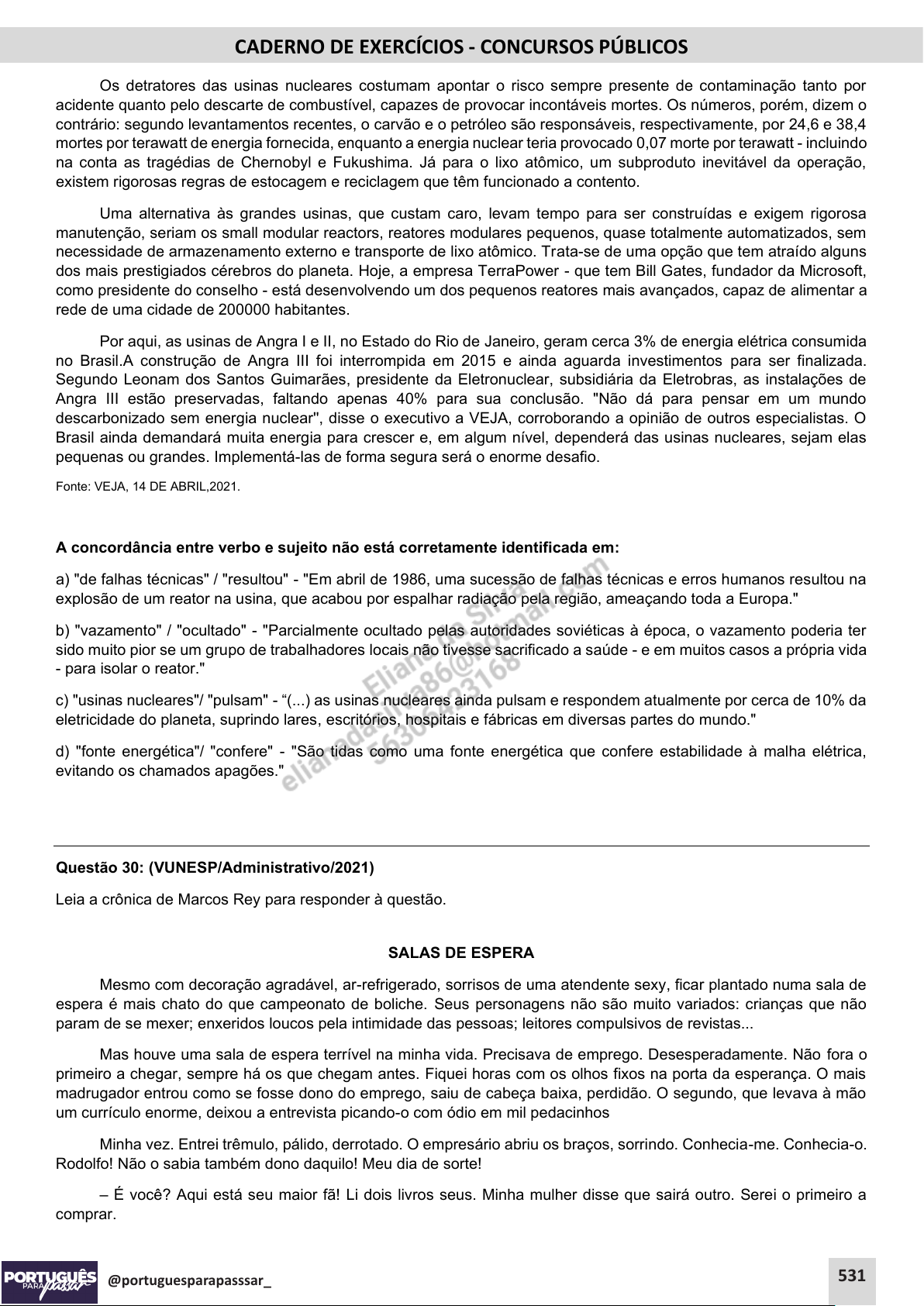 @portuguesparapasssar_ CADERNO DE EXERCÍCIOS - CONCURSOS PÚBLICOS 22 Muita gente, secretamente, detesta a própria alcunha, mas são obrigados a resignar-se, sob o risco de perder a identidade. Qual é o nome de Bussunda, do Tiririca, do Chitãozinho e Xororó? Anônimos Cláudios, Ricardos e Fernandes. Nomes que só existem em cartório. Apelido gruda, cola, vira marca registrada. Tem negro que é Alemão, tem grandão que é Fininho, tem careca que é Cabeleira, tem ateu que é Cristo, tem moreno que é Ruivo, tem albino que é Tição. Apelido não tem lógica. Tem história. Doris Lessing, quando criança, tinha um apelido para sua segunda personalidade: chamava a si mesmo de Tigger. Doris era o nome para consumo externo, para denominar a menina boazinha que aparentava ser. Tigger era o que ela era em segredo: sarcástica, atrevida, extrovertida. Com esse depoimento, Doris Lessing mostrou a verdadeira utilidade dos apelidos em vez daquela coisa antipática de "colocar as pessoas em seus devidos lugares". O bom do apelido é que ele nos dá permissão para sermos vários: Afonso Henrique combina com gravata, mas que tem mais a ver com bermuda. Está aí uma maneira sutil de legalizar o nosso outro eu, o que ficou sem registro. Fonte: MEDEIROS, Martha. Trem Bala, fev, 1998, p. 49,50. Em: “(...) Mano, Mana, Maninha.", não houve: a) acréscimo de sufixo diminutivo. b) variação de gênero da palavra "mano". c) variação de grau da palavra "manon. d) variação de número da palavra "mano". Questão 29: (CETAP/Administração/2021) A REDENÇÃO DAS MALDITAS. As usinas nucleares podem ser a solução para um mundo poluído que precisa de energia limpa, mas, se quiserem continuar a existir, elas terão de se reinventar. Trinta e cinco anos depois do maior acidente nuclear da história, na cidade de Chernobyl, na Ucrânia, então parte da União Soviética, seus impactos ainda são sentidos. Em abril de 1986, uma sucessão de falhas técnicas e erros humanos resultou na explosão de um reator na usina, que acabou por espalhar radiação pela região, ameaçando toda a Europa. Parcialmente ocultado pelas autoridades soviéticas à época, o vazamento poderia ter sido muito pior se um grupo de trabalhadores locais não tivesse sacrificado a saúde - e em muitos casos a própria vida - para isolar o reator. Apesar disso, uma área de 2600 quilômetros quadrados, mais que o dobro da cidade do Rio de Janeiro, continua inabitável. No entanto, mesmo à sombra deste caso - e de outro desastre igualmente grave ocorrido em Fukushima, no Japão, dez anos atrás -, as usinas nucleares ainda pulsam: respondem atualmente por cerca de 10% da eletricidade do planeta, suprindo lares, escritórios, hospitais e fábricas em diversas partes do mundo. São tidas como uma fonte energética que confere estabilidade à malha elétrica, evitando os chamados apagões. As usinas nucleares são como grandes chaleiras que produzem vapor de água e, assim, movimentam turbinas para gerar eletricidade. O calor, no entanto, não vem do fogo, mas da fissão controlada de átonos de urânio. Existem hoje 440 reatores em funcionamento em 32 países, incluindo o Brasil. China e Índia pretendem construir novos reatores, assim como Estados Unidos, Reino Unido e Finlândia. A ascensão de fontes alternativas, como as energias eólica e solar, ampliou o leque de opções, mas as usinas nucleares continuam sendo, para muitos países, sinônimo de energia limpa, já que não emitem gases de efeito estufa. Segundo a Agência Internacional de Energia, os reatores atômicos evitaram, nos últimos cinquenta anos, a descarga de 60 gigatoneladas de CO2 na atmosfera, o que talvez justifique o posicionamento da França quanto às usinas nucleares, ora neutro, ora a favor: o país é o segundo maior gerador de eletricidade a partir delas, atrás apenas dos Estados Unidos. CADERNO DE EXERCÍCIOS - CONCURSOS PÚBLICOS 23 Os detratores das usinas nucleares costumam apontar o risco sempre presente de contaminação tanto por acidente quanto pelo descarte de combustível, capazes de provocar incontáveis mortes. Os números, porém, dizem o contrário: segundo levantamentos recentes, o carvão e o petróleo são responsáveis, respectivamente, por 24,6 e 38,4 mortes por terawatt de energia fornecida, enquanto a energia nuclear teria provocado 0,07 morte por terawatt - incluindo na conta as tragédias de Chernobyl e Fukushima. Já para o lixo atômico, um subproduto inevitável da operação, existem rigorosas regras de estocagem e reciclagem que têm funcionado a contento. Uma alternativa às grandes usinas, que custam caro, levam tempo para ser construídas e exigem rigorosa manutenção, seriam os small modular reactors, reatores modulares pequenos, quase totalmente automatizados, sem necessidade de armazenamento externo e transporte de lixo atômico. Trata-se de uma opção que tem atraído alguns dos mais prestigiados cérebros do planeta. Hoje, a empresa TerraPower - que tem Bill Gates, fundador da Microsoft, como presidente do conselho - está desenvolvendo um dos pequenos reatores mais avançados, capaz de alimentar a rede de uma cidade de 200000 habitantes. Por aqui, as usinas de Angra I e II, no Estado do Rio de Janeiro, geram cerca 3% de energia elétrica consumida no Brasil.A construção de Angra III foi interrompida em 2015 e ainda aguarda investimentos para ser finalizada. Segundo Leonam dos Santos Guimarães, presidente da Eletronuclear, subsidiária da Eletrobras, as instalações de Angra III estão preservadas, faltando apenas 40% para sua conclusão. "Não dá para pensar em um mundo descarbonizado sem energia nuclear'', disse o executivo a VEJA, corroborando a opinião de outros especialistas. O Brasil ainda demandará muita energia para crescer e, em algum nível, dependerá das usinas nucleares, sejam elas pequenas ou grandes. Implementá-las de forma segura será o enorme desafio. Fonte: VEJA, 14 DE ABRIL,2021. A co