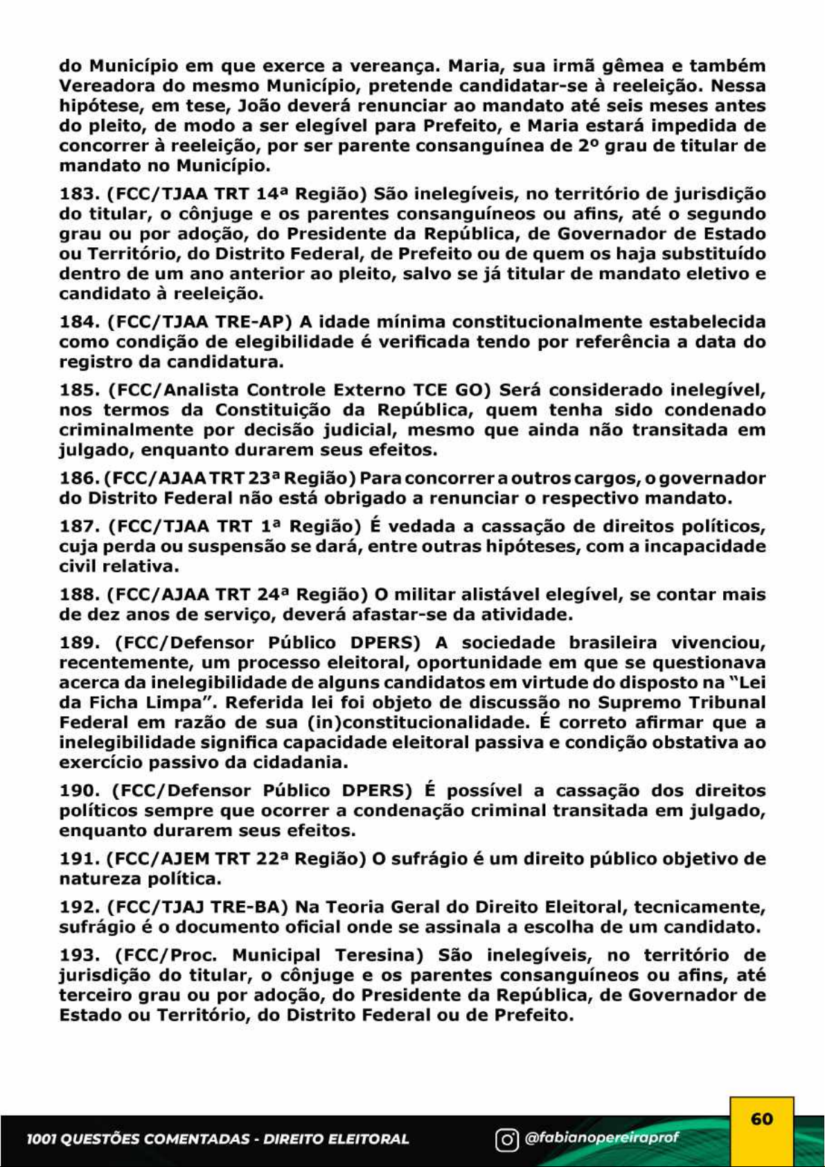 do Município em que exerce a vereança. Maria, sua irmã gêmea e também Vereadora do mesmo Município, pretende candidatar-se à reeleição. Nessa hipótese, em tese, João deverá renunciar ao mandato até seis meses antes do pleito, de modo a ser elegível para Prefeito, e Maria estará impedida de concorrer à reeleição, por ser parente consanguínea de 2° grau de titular de mandato no Município. 183. (FCC/TJAA TRT Região) São inelegíveis, no território de jurisdição do titular, o cônjuge e os parentes consanguíneos ou afins, até o segundo grau ou por adoção, do Presidente da República, de Governador de Estado ou Território, do Distrito Federal, de Prefeito ou de quem os haja substituído dentro de um ano anterior ao pleito, salvo se já titular de mandato eletivo e candidato à reeleição. 184. (FCC/TJAA TRE-AP) A idade mínima constitucionalmente estabelecida como condição de elegibilidade é verificada tendo por referência a data do registro da candidatura. 185. (FCC/Analista Controle Externo TCE GO) Será considerado inelegível, nos termos da Constituição da República, quem tenha sido condenado criminalmente por decisão judicial, mesmo que ainda não transitada em julgado, enquanto durarem seus efeitos. 186. (FCC/AJAATRT Região) Para concorrer a outros cargos, o governador do Distrito Federal não está obrigado a renunciar o respectivo mandato. 187. (FCC/TJAA TRT Região) É vedada a cassação de direitos políticos, cuja perda ou suspensão se dará, entre outras hipóteses, com a incapacidade civil relativa. 188. (FCC/AJAA TRT Região) o militar alistável elegível, se contar mais de dez anos de serviço, deverá afastar-se da atividade. 189. (FCC/Defensor Público DPERS) A sociedade brasileira vivenciou, recentemente, um processo eleitoral, oportunidade em que se questionava acerca da inelegibilidade de alguns candidatos em virtude do disposto na "Lei da Ficha Limpa". Referida lei foi objeto de discussão no Supremo Tribunal Federal em razão de sua (in)constitucionalidade. É correto afirmar que a inelegibilidade significa capacidade eleitoral passiva e condição obstativa ao exercício passivo da cidadania. 190. (FCC/Defensor Público DPERS) É possível a cassação dos direitos políticos sempre que ocorrer a condenação criminal transitada em julgado, enquanto durarem seus efeitos. 191. (FCC/AJEM TRT Região) o sufrágio é um direito público objetivo de natureza política. 192. (FCC/TJAJ TRE-BA) Na Teoria Geral do Direito Eleitoral, tecnicamente, sufrágio é o documento oficial onde se assinala a escolha de um candidato. 193. (FCC/Proc. Municipal Teresina) São inelegíveis, no território de jurisdição do titular, o cônjuge e os parentes consanguíneos ou afins, até terceiro grau ou por adoção, do Presidente da República, de Governador de Estado ou Território, do Distrito Federal ou de Prefeito. 60 1001 QUESTÕES COMENTADAS DIREITO ELEITORAL @fabianopereiraprof194. (FCC/Procurador TCE RO) Em relação às condições de elegibilidade, é correto afirmar que para concorrerem a outros cargos, os Chefes do Poder Executivo e os parlamentares devem renunciar a seus respectivos mandatos até seis meses antes do pleito. 195. (FCC/Procurador TCE RO) A Constituição vigente permitiu aos analfabetos o direito ao voto e à elegibilidade. 196. (FCC/AJAA TRT Região) o militar alistável que contar mais de dez anos de serviço é elegível desde que se afaste da atividade. 197. (FCC/Oficial DPESP) Ao Presidente da República, Governadores de Estado e do Distrito Federal, bem como aos Prefeitos é permitida, nos termos da Constituição Federal Brasileira, a reeleição para dois períodos subsequentes. 198. (FCC/Analista Controle Externo TCE GO) Será considerado inelegível, nos termos da Constituição da República, o Governador de Estado no exercício de seu primeiro mandato que, pretendendo a reeleição, não renunciar até seis meses antes do pleito. 199. (FCC/Proc. Municipal Teresina) A idade mínima para elegibilidade do Presidente e Vice-Presidente da República é de 30 (trinta) anos. 200. (FCC/AJAJ TRT Região) o militar alistável é elegível. Se contar menos de dez anos de serviço, será agregado pela autoridade superior e, se eleito, passará automaticamente, no ato da diplomação, para a inatividade. 201. (FCC/AJA TRT Região) A capacidade eleitoral passiva consistente na possibilidade de o cidadão pleitear determinados mandatos políticos, mediante eleição popular, desde que preenchidos certos requisitos, conceitua-se em alistamento eleitoral. 202. (FCC/Analista Controle Externo TCE GO) É inelegível, nos termos da Constituição Federal, o filho adotado de Governador do Estado que pretenda candidatar-se a Prefeito da Capital do Estado. 203. (FCC/AJAA TRE RN) Pedro, Vice-governador do Estado X, pretende concorrer ao cargo de Deputado Estadual. Neste caso, Pedro deverá renunciar ao respectivo mandato até seis meses antes do pleito. 204. (FCC/AJAJ TRT Região) No próximo ano haverá eleição para os cargos de Presidente da República, Vice-Presidente da República, Senador, Deputado Federal, Governador de Estado, Vice-Governador de Estado e Deputado Estadual. Assim, Ahmed Abdel (brasileiro naturalizado, com 37 anos de idade); Yokama Yoshi (brasileiro naturalizado, com 30 anos de idade) e Tício Brutus (brasileiro nato, com 29 anos de idade) poderão, além de outros cargos, candidatar-se, respectivamente, a Deputado Federal; Vice- Governador de Estado e Presidente da República. 205. (FCC/AJEM TRF Região) São inelegíveis o cônjuge e os parentes consanguíneos ou afins, até o terceiro grau, do Governador ou do Prefeito, ou de quem os haja substituído dentro dos três meses anteriores ao pleito, ainda que titular de mandato eletivo e candidato à reeleição. 206. (FCC/AJAJ TRT Região) Joaquim Osório (brasileiro naturalizado, 61 1001 QUESTÕES COMENTADAS DIREITO ELEITORAL @fabianopereiraprofcom 30 anos de 