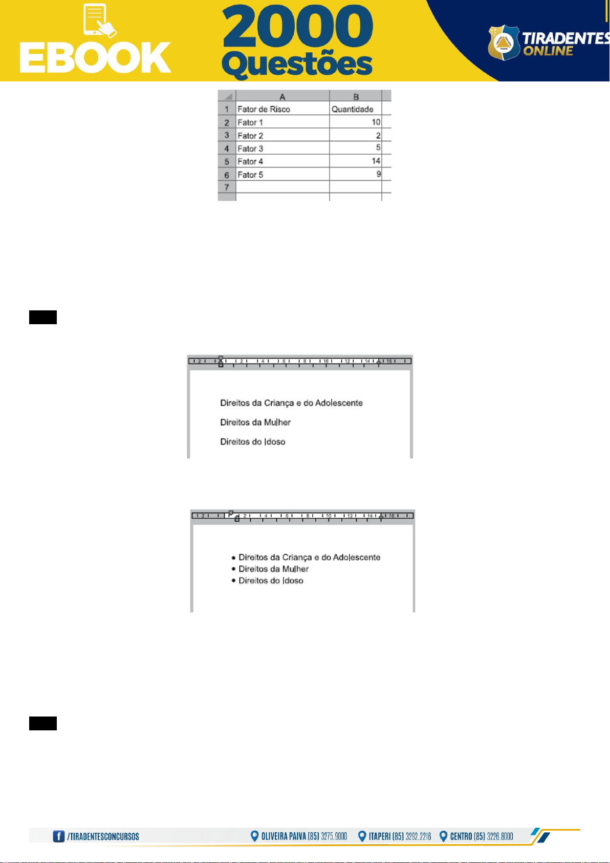 187 Após preencher a fórmula =CONT.SE(B2:B6;ꞌꞌ>10ꞌꞌ) na célula B7, o valor exibido será A) 1 B) 2 C) 14 D) 19 E) 40 0963 Um usuário, editando um documento por meio do MS-Word 2010, em sua configuração padrão, digitou alguns parágrafos, conforme visto na imagem ANTES. ANTES Em seguida, selecionou os parágrafos e acionou um recurso do MS-Word 2010, que deixou o documento conforme visto na imagem DEPOIS. DEPOIS O recurso utilizado pelo usuário foi A) Numeração. B) Espaçamento. C) Marcadores. D) Aumentar Recuo. E) Diminuir Recuo. 0964 Assinale a alternativa que apresenta apenas extensões de arquivos reconhecidas por padrão, no MS-Windows 7, em sua confi- guração padrão, como arquivos de imagens. A) bmp e pptx. B) xlsx e docx. C) txt e jpg. D) jpg e png. E) png e doc. 188 0965 Analise abaixo as possibilidades ao navegar no explorador de arquivos do Windows 10 e clicar sobre um arquivo qualquer com o botão direito: I. Criar Atalho. II. Copiar. III. Desinstalar. Quais são opções existentes? A) Apenas I. B) Apenas II. C) Apenas I e II. D) Apenas I e III. E) I, II e III. 0966 Para alterar as margens de um documento do Word 2013, deve-se acessar a guia: A) Layout de Página. B) Margens. C) Formatar. D) Ajuda. E) Exibição. 0967 Para inserir comentários em um documento do Word 2013, é possível encontrar a opção em duas guias. São elas: A) Inserir e Revisão. B) Inserir e Comentário. C) Comentário e Revisão. D) Formatar e Inserir. E) Formatar e Revisão. 0968 No Word 2013, qual a funcionalidade do botão que se encontra na guia Página Inicial? A) Alterar o tipo da Fonte. B) Alterar a cor da Fonte. C) Reduzir o tamanho da Fonte. D) Limpar Toda a Formatação. E) Alterar a cor de fundo da Fonte. 0969 Analise abaixo as extensões de arquivos que abrem no Excel 2013. I. TXT. II. CSV. III. PNG. Quais tipos são possíveis? A) Apenas I. B) Apenas II. C) Apenas I e II. D) Apenas II e III. E) I, II e III. 0970 Utilizando o Windows 10, quando a imagem indicada pela seta vermelha apresenta números, significa que há: A) Três notificações não visualizadas. B) Três dias que o computador não executa o antivírus. 189 C) Três novas redes disponíveis. D) Três novos e-mails recebidos. E) Três atualizações do Windows disponíveis. 0971 Analise abaixo as opções da guia Dados do Excel 2013: I. Classificar. II. Filtro. III. Remover Duplicadas. Quais são opções existentes nessa guia? A) Apenas I. B) Apenas II. C) Apenas I e II. D) Apenas II e III. E) I, II e III. 0972 Utilizando uma versão atualizada do Google Chrome, qual a funcionalidade do ícone, indicado pela seta vermelha? A) Definir o Chrome como navegador padrão. B) Atualizar a página. C) Visualizar informações do site. D) Voltar à Página Inicial. E) Ir para os Favoritos. Para responder as próximas duas questões, considere a imagem abaixo. 0973 Caso fosse necessário saber a quantidade total de produtos disponíveis, qual a fórmula que deveria ser utilizada? A) =SOMA(quantidade) B) =SOMA(B2:B5) C) =TOTAL(B2:B5) D) =TOTAL(quantidade) E) =SOMA(estoque) 0974 Caso fosse necessário saber a média do valor dos produtos que estão na imagem, qual fórmula deveria ser utilizada? 190 A) =MÉDIA(valor) B) =MÉDIA(quantidade) C) =MÉDIA(C2:C5) D) =SOMA(C2:C5) E) =VALOR(C2:C5) 0975 Considerando-se o Internet Explorer 11, marcar C para as afirmativas Certas, E para as Erradas e, após, assinalar a alternativa que apresenta a sequência CORRETA: ( )No Windows 10, é necessário instalar o aplicativo do Internet Explorer. ( )É possível fixar o aplicativo do Internet Explorer na barra de tarefas do Windows 10. A) C - C. B) C - E. C) E - E. D) E - C 0976 Considerando-se o Outlook 2010, sobre a assinatura digital, analisar os itens abaixo: I. Uma assinatura digital é o mesmo que uma assinatura que se costuma incluir com uma mensagem de saída. II. Uma mensagem assinada digitalmente pode vir apenas do proprietário da identificação digital usado para assiná-lo. III. A identificação digital fornece verificação de autenticidade do remetente, ajudando a impedir a adulteração de mensagem. Está(ão) CORRETO(S): A) Somente o item I. B) Somente os itens I e III. C) Somente os itens II e III. D) Todos os itens. 0977 Considerando-se os conceitos de hardware e de software, numerar a 2ª coluna de acordo com a 1ª e, após, assinalar a alternat i- va que apresenta a sequência CORRETA: (1) Hardware. (2) Software. ( )Estão incluídos os periféricos de entrada e saída, tais como carcaças, placas, cabos, etc. ( )Agrupamento de comandos escritos em uma linguagem de programação. ( )Sistemas operaciona A) 2 - 2 - 1. B) 2 - 1 - 2. C) 1 - 1 - 2. D) 1 - 2 - 2. 0978 Sobre os periféricos de um computador, analisar os itens abaixo: I. Os periféricos de armazenamento são dispositivos de saída que oferecem ao usuário uma representação visual. II. Os periféricos de entrada só podem enviar informações para o computador, como os dispositivos indicadores, por exemplo, mouse e teclado. III. Os periféricos de captura são periféricos de entrada/saída, que podem armazenar as informações de forma permanente. Está(ão) CORRETO(S): A) Somente o item II. B) Somente os itens I e III. C) Somente os itens II e III. D) Todos os itens. 0979 Considerando-se a configuração e a utilização de impressoras, no Windows 10, analisar a sentença abaixo: