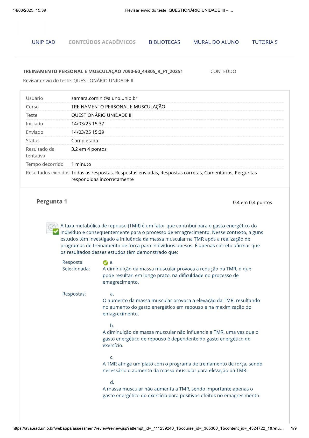 14/03/2025, 15:39 Revisar envio do teste: QUESTIONÁRIO UNIDADE III UNIP EAD CONTEÚDOS ACADÊMICOS BIBLIOTECAS MURAL DO ALUNO TUTORIAIS TREINAMENTO PERSONAL E MUSCULAÇÃO 7090-60_44805_R_F1_20251 CONTEÚDO Revisar envio do teste: QUESTIONÁRIO UNIDADE III Usuário samara.comin@aluno.unip.br Curso TREINAMENTO PERSONAL E MUSCULAÇÃO Teste QUESTIONÁRIO UNIDADE III Iniciado 14/03/25 15:37 Enviado 14/03/25 15:39 Status Completada Resultado da 3,2 em 4 pontos tentativa Tempo decorrido 1 minuto Resultados exibidos Todas as respostas, Respostas enviadas, Respostas corretas, Comentários, Perguntas respondidas incorretamente Pergunta 1 0,4 em 0,4 pontos A taxa metabólica de repouso (TMR) é um fator que contribui para o gasto energético do indivíduo e consequentemente para o processo de emagrecimento. Nesse contexto, alguns estudos têm investigado a influência da massa muscular na TMR após a realização de programas de treinamento de força para indivíduos obesos. É apenas correto afirmar que os resultados desses estudos têm demonstrado que: Resposta e. Selecionada: A diminuição da massa muscular provoca a redução da TMR, o que pode resultar, em longo prazo, na dificuldade no processo de emagrecimento. Respostas: a. O aumento da massa muscular provoca a elevação da TMR, resultando no aumento do gasto energético em repouso e na maximização do emagrecimento. b. A diminuição da massa muscular não influencia a TMR, uma vez que o gasto energético de repouso é dependente do gasto energético do exercício. C. A TMR atinge um platô com o programa de treinamento de força, sendo necessário o aumento da massa muscular para elevação da TMR. d. A massa muscular não aumenta a TMR, sendo importante apenas o gasto energético do exercício para positivos efeitos no emagrecimento. 1/914/03/2025, 15:39 Revisar envio do teste: QUESTIONÁRIO UNIDADE III e. A diminuição da massa muscular provoca a redução da TMR, o que pode resultar, em longo prazo, na dificuldade no processo de emagrecimento. Comentário da Resposta: E resposta: Comentário: o aumento da massa muscular não aumenta a TMR, mas a diminuição da massa muscular reduz a TMR. Como a TMR é o maior responsável pelo gasto energético do indivíduo, a redução da massa muscular pode reduzir o gasto energético e dificultar o emagrecimento em longo prazo. Pergunta 2 0,4 em 0,4 pontos Considerando a situação hipotética que, durante o treinamento de força de alta intensidade, um indivíduo hipertenso realize a manobra de valsalva, é correto afirmar que: Resposta C. Selecionada: A manobra de valsalva provocará a vasoconstrição, elevando subsequentemente a pressão arterial do hipertenso. Respostas: a. A manobra de valsalva aumentará a hiperventilação, elevando consequentemente a pressão arterial do hipertenso. b. A manobra de valsalva causará a vasodilatação, elevando subsequentemente a pressão arterial do hipertenso. C. A manobra de valsalva provocará a vasoconstrição, elevando subsequentemente a pressão arterial do hipertenso. d. A manobra de valsalva aumentará a dilatação arterial, elevando subsequentemente a pressão arterial do hipertenso. e. A manobra de valsalva diminuirá a vasoconstrição, elevando subsequentemente a pressão arterial do hipertenso. Comentário da Resposta: C resposta: Comentário: o fechamento da glote e a contração dos músculos respiratórios provocam vasoconstrição, reduzindo o fluxo venoso para o coração. Subsequentemente, ocorre aumento da frequência cardíaca e fluxo sanguíneo, elevando a pressão arterial do indivíduo hipertenso. Pergunta 3 0,4 em 0,4 pontos14/03/2025, 15:39 Revisar envio do teste: QUESTIONÁRIO UNIDADE Considere a seguinte situação hipotética: um aluno diabético do tipo quer contratá-lo como personal trainer e tem como objetivo a melhora de sua saúde. Após todo o planejamento inicial, você inicia o processo de treinamento de força com seu aluno. Após algumas semanas, ao fazer um hemograma, o aluno apresenta diminuição da glicemia em jejum (antes = 152 mg/dL e após 132 mg/dL). Nesse contexto, a alteração fisiológica causada pelo treinamento de força que explica a diminuição da glicemia é: Resposta d. Selecionada: aumento da captação de glicose pela própria contração muscular via aumento de GLUT-4, sem a necessidade da ação da insulina. Respostas: a. A diminuição da concentração de insulina circulante, facilitando a captação de glicose pela ativação da insulina por meio da ação de GLUT-4. b. aumento da concentração de insulina e GLUT-4 no pâncreas, provocando maior captação de glicose pelo tecido muscular. C. O aumento da concentração de GH, diminuindo significativamente a concentração de GLUT-4 e glicose no sangue. d. O aumento da captação de glicose pela própria contração muscular via aumento de GLUT-4, sem a necessidade da ação da insulina. e. O aumento da captação de glicose pelo aumento da ativação de insulina pela própria contração muscular via aumento do número de GLUT-4. Comentário da Resposta: D resposta: Comentário: a contração muscular em resposta ao treinamento de força provoca o aumento da ativação da proteína GLUT-4, causando maior captação de glicose sem a necessidade de insulina. Além disso, ocorre o aumento da quantidade de GLUT-4, gerando a redução da glicemia do indivíduo. Pergunta 4 0 em 0,4 pontos Em um estudo conduzido por Richarson et al. (2018) foram comparados os grupos treinamento de força de alta intensidade (80% de 1RM) realizado em baixa velocidade de movimento versus o treinamento de força de baixa intensidade (40% de 1RM) realizado em máxima velocidade de movimento. propósito era identificar qual seria a melhor estratégia para promover o aumento da capacidade funcional de pessoas idosas nos testes de levantar e sentar da cadeira após 10 semanas de treinamento. Os resultados obtidos estão de acordo com as alterações fisiológic