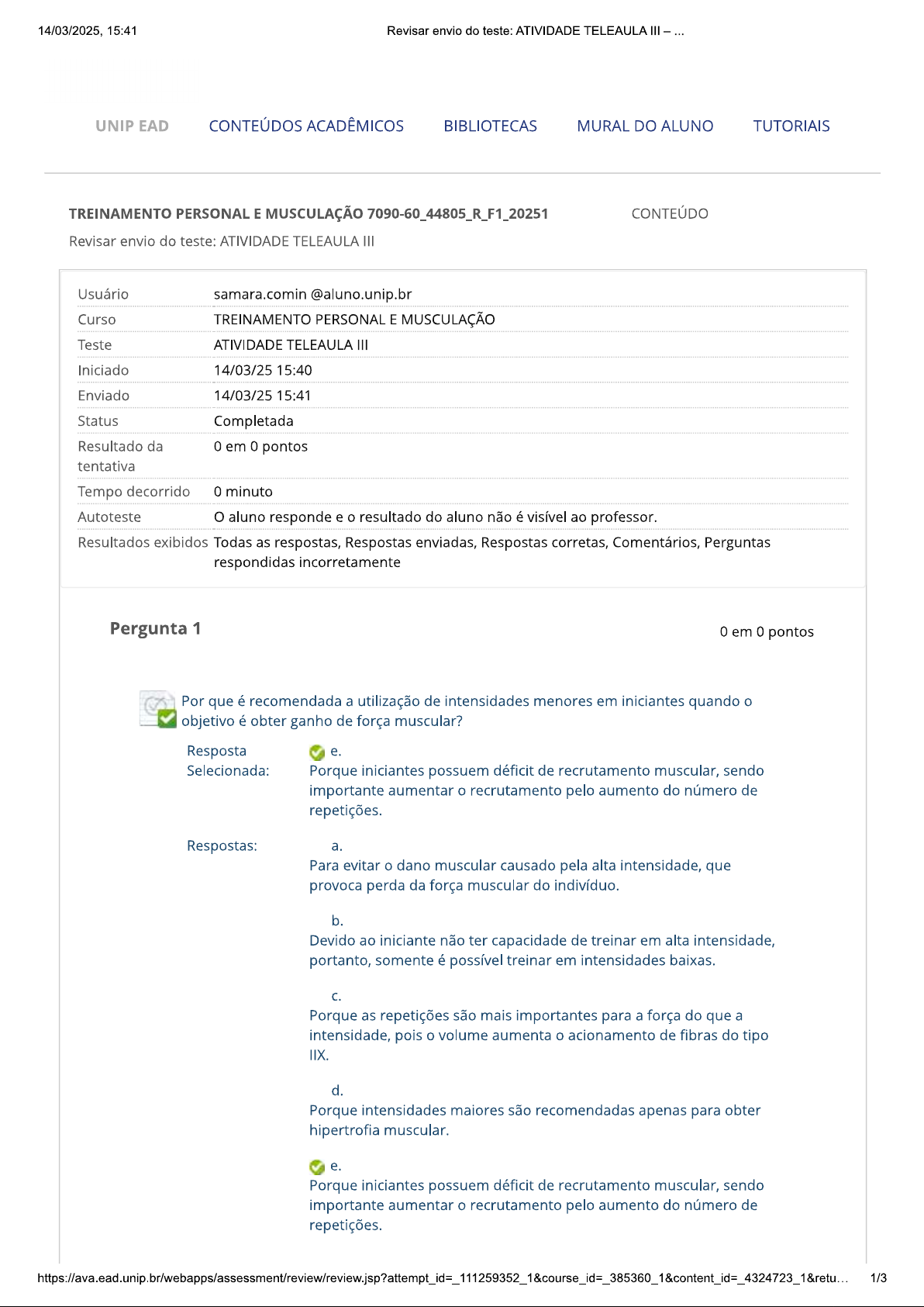 14/03/2025, 15:41 Revisar envio do teste: ATIVIDADE TELEAULA III - UNIP EAD CONTEÚDOS ACADÊMICOS BIBLIOTECAS MURAL DO ALUNO TUTORIAIS TREINAMENTO PERSONAL E MUSCULAÇÃO 7090-60_44805_R_F1_20251 CONTEÚDO Revisar envio do teste: ATIVIDADE TELEAULA III Usuário Curso TREINAMENTO PERSONAL E MUSCULAÇÃO Teste ATIVIDADE TELEAULA III Iniciado 14/03/25 15:40 Enviado 14/03/25 15:41 Status Completada Resultado da 0 em 0 pontos tentativa Tempo decorrido 0 minuto Autoteste O aluno responde e o resultado do aluno não é visível ao professor. Resultados exibidos Todas as respostas, Respostas enviadas, Respostas corretas, Comentários, Perguntas respondidas incorretamente Pergunta 1 0 em 0 pontos Por que é recomendada a utilização de intensidades menores em iniciantes quando o objetivo é obter ganho de força muscular? Resposta e. Selecionada: Porque iniciantes possuem déficit de recrutamento muscular, sendo importante aumentar o recrutamento pelo aumento do número de repetições. Respostas: a. Para evitar o dano muscular causado pela alta intensidade, que provoca perda da força muscular do indivíduo. b. Devido ao iniciante não ter capacidade de treinar em alta intensidade, portanto, somente é possível treinar em intensidades baixas. C. Porque as repetições são mais importantes para a força do que a intensidade, pois o volume aumenta o acionamento de fibras do tipo IIX. d. Porque intensidades maiores são recomendadas apenas para obter hipertrofia muscular. e. Porque iniciantes possuem déficit de recrutamento muscular, sendo importante aumentar o recrutamento pelo aumento do número de repetições.14/03/2025, 15:41 Revisar envio do teste: ATIVIDADE TELEAULA III - Comentário da resposta: Resposta: e) Pergunta 2 0 em 0 pontos Em quais condições os indivíduos diabéticos (tipos e II) não devem realizar o treinamento de força? Resposta a. Selecionada: Glicemia igual ou acima de 250 mg/dL ou igual ou abaixo de 50 mg/dL. Respostas: Glicemia igual ou acima de 250 mg/dL ou igual ou abaixo de 50 mg/dL. b. Glicemia igual ou acima de 150 mg/dL ou igual ou abaixo de 100 mg/dL. C. Glicemia igual ou acima de 400 mg/dL ou igual ou abaixo de 125 mg/dL. d. Glicemia acima de 200 ou abaixo de 100 e. Glicemia igual ou abaixo de 250 mg/dL ou igual ou acima de 50 mg/dL. Comentário da resposta: Resposta: a) Pergunta 3 0 em 0 pontos É sugerido que a periodização linear reversa pode resultar em ganhos significantes de resistência muscular. Isso ocorre pelo(a): Resposta b. Selecionada: Aumento do volume a cada ciclo, resultando em ganho de resistência muscular. Respostas: a. Aumento da intensidade a cada ciclo, gerando ganho de resistência muscular. b. Aumento do volume a cada ciclo, resultando em ganho de resistência muscular. 2/314/03/2025, 15:41 Revisar envio do teste: ATIVIDADE TELEAULA - C. Aumento do volume e da intensidade, aumentando a resistência muscular. d. Diminuição do volume e da intensidade, aumentando a supercompensação. e. Diminuição do volume e aumento da intensidade, aumentando a resistência muscular. Comentário da resposta: Resposta: b) Pergunta 4 0 em 0 pontos Considerando os 5 estágios de comportamento do modelo transteórico, um aluno avançado no TF se encontra normalmente no estágio de: Resposta e. Selecionada: Manutenção, pois já treina regularmente e está comprometido há mais de 6 meses. Respostas: a. pois não contempla o exercício físico, apenas o realiza. b. Contemplação, pois já contempla a prática diária do exercício físico. C. Preparação, está se preparando para evoluir, pois seus resultados estabilizaram. d. Ação, pois já pratica o exercício físico próximo de seis meses. e. Manutenção, pois já treina regularmente e está comprometido há mais de 6 meses. Comentário da resposta: Resposta: e) Sexta-feira, 14 de Março de 2025 15h41min31s GMT-03:00 OK 3/3