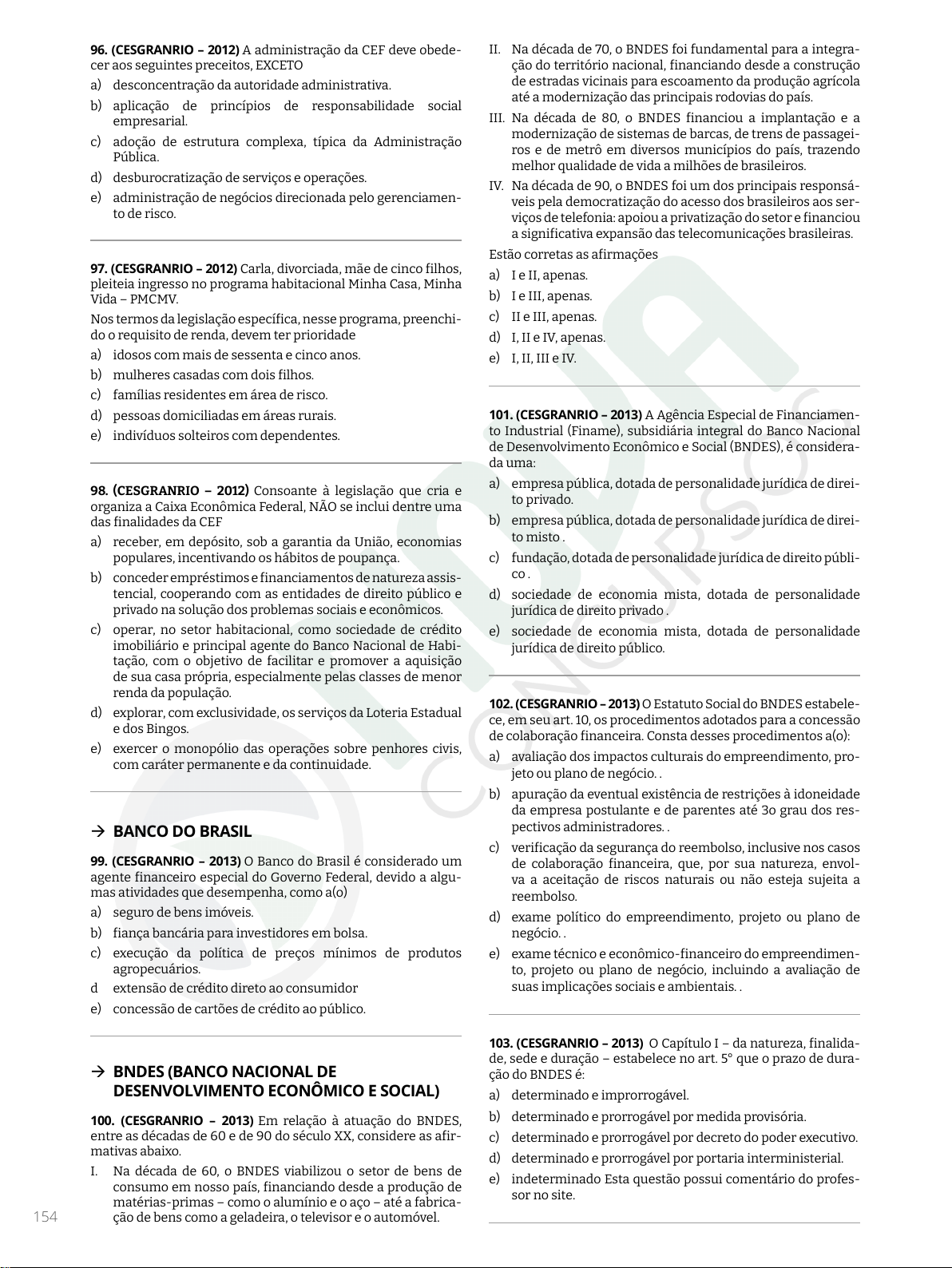 ped ro lu ca s s ilv a b ar bosa to rre s - 14 4.1 29 .14 4- 02 154 96. (CESGRANRIO – 2012) A administração da CEF deve obede- cer aos seguintes preceitos, EXCETO a) desconcentração da autoridade administrativa. b) aplicação de princípios de responsabilidade social empresarial. c) adoção de estrutura complexa, típica da Administração Pública. d) desburocratização de serviços e operações. e) administração de negócios direcionada pelo gerenciamen- to de risco. 97. (CESGRANRIO – 2012) Carla, divorciada, mãe de cinco filhos, pleiteia ingresso no programa habitacional Minha Casa, Minha Vida – PMCMV. Nos termos da legislação específica, nesse programa, preenchi- do o requisito de renda, devem ter prioridade a) idosos com mais de sessenta e cinco anos. b) mulheres casadas com dois filhos. c) famílias residentes em área de risco. d) pessoas domiciliadas em áreas rurais. e) indivíduos solteiros com dependentes. 98. (CESGRANRIO – 2012) Consoante à legislação que cria e organiza a Caixa Econômica Federal, NÃO se inclui dentre uma das finalidades da CEF a) receber, em depósito, sob a garantia da União, economias populares, incentivando os hábitos de poupança. b) conceder empréstimos e financiamentos de natureza assis- tencial, cooperando com as entidades de direito público e privado na solução dos problemas sociais e econômicos. c) operar, no setor habitacional, como sociedade de crédito imobiliário e principal agente do Banco Nacional de Habi- tação, com o objetivo de facilitar e promover a aquisição de sua casa própria, especialmente pelas classes de menor renda da população. d) explorar, com exclusividade, os serviços da Loteria Estadual e dos Bingos. e) exercer o monopólio das operações sobre penhores civis, com caráter permanente e da continuidade. Æ BANCO DO BRASIL 99. (CESGRANRIO – 2013) O Banco do Brasil é considerado um agente financeiro especial do Governo Federal, devido a algu- mas atividades que desempenha, como a(o) a) seguro de bens imóveis. b) fiança bancária para investidores em bolsa. c) execução da política de preços mínimos de produtos agropecuários. d extensão de crédito direto ao consumidor e) concessão de cartões de crédito ao público. Æ BNDES (BANCO NACIONAL DE DESENVOLVIMENTO ECONÔMICO E SOCIAL) 100. (CESGRANRIO – 2013) Em relação à atuação do BNDES, entre as décadas de 60 e de 90 do século XX, considere as afir- mativas abaixo. I. Na década de 60, o BNDES viabilizou o setor de bens de consumo em nosso país, financiando desde a produção de matérias-primas – como o alumínio e o aço – até a fabrica- ção de bens como a geladeira, o televisor e o automóvel. II. Na década de 70, o BNDES foi fundamental para a integra- ção do território nacional, financiando desde a construção de estradas vicinais para escoamento da produção agrícola até a modernização das principais rodovias do país. III. Na década de 80, o BNDES financiou a implantação e a modernização de sistemas de barcas, de trens de passagei- ros e de metrô em diversos municípios do país, trazendo melhor qualidade de vida a milhões de brasileiros. IV. Na década de 90, o BNDES foi um dos principais responsá- veis pela democratização do acesso dos brasileiros aos ser- viços de telefonia: apoiou a privatização do setor e financiou a significativa expansão das telecomunicações brasileiras. Estão corretas as afirmações a) I e II, apenas. b) I e III, apenas. c) II e III, apenas. d) I, II e IV, apenas. e) I, II, III e IV. 101. (CESGRANRIO – 2013) A Agência Especial de Financiamen- to Industrial (Finame), subsidiária integral do Banco Nacional de Desenvolvimento Econômico e Social (BNDES), é considera- da uma: a) empresa pública, dotada de personalidade jurídica de direi- to privado. b) empresa pública, dotada de personalidade jurídica de direi- to misto . c) fundação, dotada de personalidade jurídica de direito públi- co . d) sociedade de economia mista, dotada de personalidade jurídica de direito privado . e) sociedade de economia mista, dotada de personalidade jurídica de direito público. 102. (CESGRANRIO – 2013) O Estatuto Social do BNDES estabele- ce, em seu art. 10, os procedimentos adotados para a concessão de colaboração financeira. Consta desses procedimentos a(o): a) avaliação dos impactos culturais do empreendimento, pro- jeto ou plano de negócio. . b) apuração da eventual existência de restrições à idoneidade da empresa postulante e de parentes até 3o grau dos res- pectivos administradores. . c) verificação da segurança do reembolso, inclusive nos casos de colaboração financeira, que, por sua natureza, envol- va a aceitação de riscos naturais ou não esteja sujeita a reembolso. d) exame político do empreendimento, projeto ou plano de negócio. . e) exame técnico e econômico-financeiro do empreendimen- to, projeto ou plano de negócio, incluindo a avaliação de suas implicações sociais e ambientais. . 103. (CESGRANRIO – 2013) O Capítulo I – da natureza, finalida- de, sede e duração – estabelece no art. 5° que o prazo de dura- ção do BNDES é: a) determinado e improrrogável. b) determinado e prorrogável por medida provisória. c) determinado e prorrogável por decreto do poder executivo. d) determinado e prorrogável por portaria interministerial. e) indeterminado Esta questão possui comentário do profes- sor no site. O conteúdo deste livro eletrônico é licenciado para pedro lucas silva barbosa torres - 144.129.144-02, vedada, por quaisquer meios e a qualquer título, a sua reprodução, cópia, divulgação ou distribuição, sujeitando-se aos infratores à responsabilização civil e criminal.