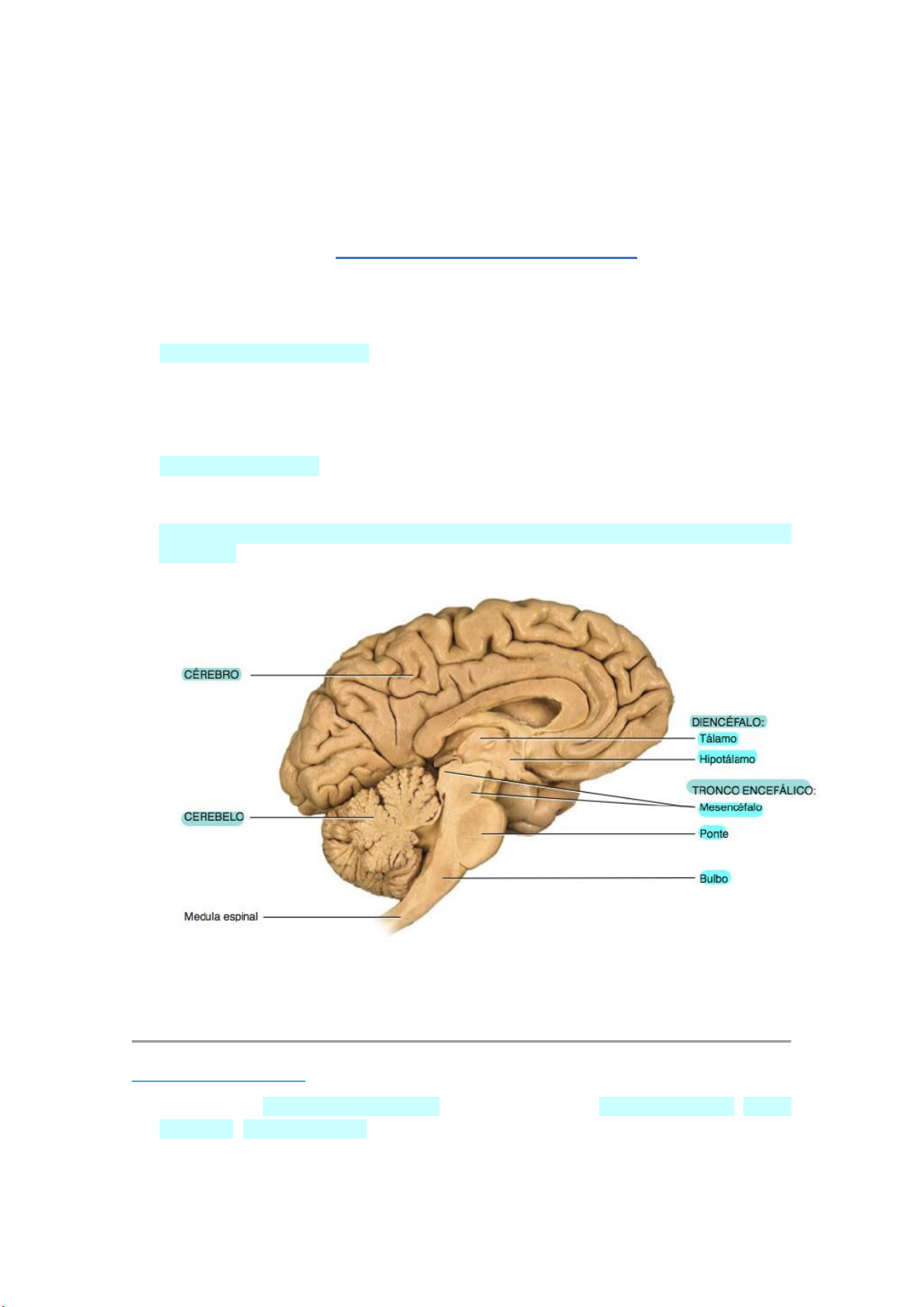 Sistema Nervoso Central Encéfalo + Nervos Cranianos O encéfalo adulto consiste em quatro partes: 1. Tronco encefálico: contínuo com a medula espinhal Mesencéfalo, ponte e bulbo 2. Cerebelo: posteriormente ao tronco encefálico 3. Diencéfalo: superiormente ao tronco encefálico Tálamo e hipotálamo 4. Cérebro (Telencéfalo): apoiado no diencéfalo e no tronco encefálico O cérebro é formado pelo telencéfalo (onde ficam os hemisférios cerebrais) + diencéfalo ▪ Meninges (estruturas protetoras do encéfalo): contínuas as meninges espinhais, consistindo da mesma estrutura básica e com o mesmo nome. Sistema Ventricular ▪ Consiste em: dois ventrículos laterais (esquerdo e direito); terceiro ventrículo; quarto ventrículo; plexos coróides. ▪ O líquido cefalorraquidiano (LCR) formado nos plexos coróides de cada ventrículo lateral (parte do telencéfalo) por meio de duas aberturas ovais estreitas, os forames interventriculares. ▪ Mais LCR é adicionado pelo plexo coróide no teto do terceiro ventrículo (diencéfalo). O líquido, então, flui pelo aqueduto do mesencéfalo, que passa pelo mesencéfalo, em direção ao quarto ventrículo. ▪ O plexo coróide do quarto ventrículo colabora com mais líquido. O liquor flui do sistema ventricular para o espaço subaracnóideo através de três aberturas no teto do quarto ventrículo, uma abertura mediana e um par de aberturas laterais, de cada lado. O LCR circula no canal central da medula espinhal e no espaço subaracnóide, em torno da superficie do encéfalo e da medula espinhal. ▪ Ele á gradualmente reabsorvido pelo sangue por meio das granulações aracnóideas, extensões digitiformes da aracnóide-máter, que se projetam nos seios venosos da dura-máter, especialmente para o seio sagital superior (veia com paredes mais finas), que drenam o sangue venoso. 1. Tronco Encefálico ▪ Por ele trafegam tratos sensitivos e motores; ▪ Possui relação com 12 pares de nervos cranianos. 10 com relação direta e 2 com relação indireta; ▪ Nele ocorrem as aferências relacionadas a audição, equilíbrio e paladar; ▪ Seus núcleos motores controlam os músculos do pescoço e cabeça; ▪ Também medeiam reflexos parassimpáticos (diminuição do débito cardíaco e da pressão arterial, aumento do peristaltismo intestinal e constrição pupilar). 1.1 Bulbo (Medula Oblonga) ▪ Continuação da parte superior da medula espinhal, formando a parte inferior do tronco encefálico. Começa no forame magno e estende-se até a margem inferior da ponte. ▪ Dentro da substância branca do bulbo passam todos os tratos ascendentes (sensitivos) e descendentes (motores) que se estendem entre a medula espinal e outras partes do encéfalo. ▪ Uma parte da substância branca forma protuberâncias na face anterior do bulbo, as pirâmides, formadas pelos tratos motores maiores, que passam do cérebro para a medula. Imediatamente lateral a cada pirâmide encontra-se uma tumefação ovalada, chamada oliva. Dentro da oliva está o núcleo olivar inferior (os neurônios desse núcleo retransmitem informação sensorial proprioceptiva para o cerebelo). ▪ Logo acima da junção do bulbo com a medula, 90% dos axônios situados na pirâmide esquerda cruzam para o lado direito, e 90% dos axônios situados na pirâmide direita cruzam para o lado direito. Este cruzamento é chamado de decussação das pirâmides e explica por que um lado do encéfalo controla os movimentos do lado oposto do corpo. ▪ Possui diversos núcleos (massas de substância cinzenta, nos quais os neurônios formam sinapses mútuas) que controlam funções vitais: → Centro cardiovascular: regula a frequência e a intensidade do batimento cardíaco e o diâmetro dos vasos sanguíneos. → Área respiratória rítmica: frequência respiratória. → Centros reflexos do vômito, tosse e espirro. ▪ Contém núcleos associados a cinco pares de nervos cranianos: → Nervos vestibulococleares (VIII): Recebem influxos e fornecem efluxos para a cóclea, relacionados a audição (mistos). → Nervos glossofaríngeos (IX): Retransmitem impulsos motores e sensitivos relacionados ao paladar, deglutição e à salivação (mistos). → Nervos vagos (X): Recebem influxos e fornecem efluxos para a faringe, laringe e de vísceras torácicas e abdominais (mistos). → Nervos acessórios (XI): Originam efluxos que controlam a deglutição (motores). → Nervos hipoglossos (XII): Geram efluxos que controlam os movimentos da língua durante a fala e a deglutição (motores). 1.2 Ponte ▪ Situa-se diretamente acima do bulbo e anterior ao cerebelo. Estrutura que une partes do encéfalo entre si. Essas conexões são formadas por feixes de axônios. ▪ Núcleos localizados na ponte: → Área pneumotáxica → Área apnêustica Essas duas áreas, junto da área respiratória rítmica (no bulbo), participam do controle da respiração. ▪ Contém núcleos associados a quatro pares de nervos cranianos: → Nervos trigêmeos (V): Recebem aferências (sensitivo) somáticas da cabeça e da face e eferências (motores) para os músculos que governam a mastigação (mistos). → Nervos abducentes (VI): Originam eferências para os músculos que realizam os movimentos dos globos oculares (motores). → Nervos faciais (VII): Aferências relacionados ao paladar e eferências para regular a secreção de saliva e lágrimas, e a contração dos músculos responsáveis pelas expressões faciais (mistos). → Nervos vestibulococleares (VIII): Aferências e eferências para o aparelho vestibular, além de impulsos relacionados ao balanço e equilíbrio (mistos). 1.3 Mesencéfalo ▪ Estende-se da ponte até o diencéfalo. O aqueduto do mesencéfalo passa através do mesencéfalo, conectando o terceiro ventrículo, acima, com o quarto, abaixo. ▪ A parte anterior do mesencéfalo contém um par de tratos, chamados de pedúnculos cerebrais. Eles contem axônios de neurônios motores, que conduzem impul