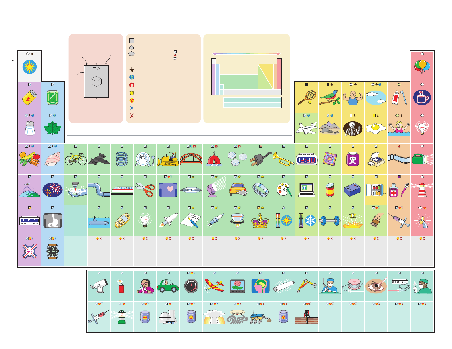 © 2005–2016 Keith Enevoldsen elements.wlonk.com Creative Commons Attribution-ShareAlike 4.0 International License traduzido por Anderson Diego Kulpa Fachini - anderson.dkfachini@gmail.com © 2005–2016 Keith Enevoldsen elements.wlonk.com Creative Commons Attribution-ShareAlike 4.0 International License © 2005–2016 Keith Enevoldsen elements.wlonk.com Creative Commons Attribution-ShareAlike 4.0 International License M etais A lcalino-terrosos M etais A lcalinos Metais de Transição Elementos Superpesados Metais Raros na Terra Metais Actinídeos G ases N obres H alogênios M etalóides M etais Pobres Não-m etais Não MetaisMetais H A cor do símbolo é a cor do elemento em sua forma comum mais pura. Exemplo os dez elementos mais presentes por peso Corpo Humano os oito elementos mais presentes pelo peso Crosta Terrestre ferromagnetico à temperatura ambiente Magnético Sólido Líquido à temperatura ambiente Gás resistentes à corrosão Metais Nobres todos isótopos são radioativos Radioativo menos de um milionésimo de porcento encontrado na natureza Apenas Traços Encontrados na Natureza apenas criados por pessoas Nunca Encontrados na Natureza Símbolo Atômico Nome Símbolos Número Atômico número de prótons Como ele é (ou era) usado ou onde ele ocorre na natureza _____ium Widgets A Z Cores Chave líquido vermelho gás sem cor sólido metálico radioativo, nunca encontrado na natureza, nenhum uso exceto pesquisa atômica Elementos Superpesados radioativo, nunca encontrado na natureza, nenhum uso exceto pesquisa atômica Sol e Estrelas H 1 Hidrogênio Baterias Li 3 Lítio Esmeraldas Be 4 Berílio Sal Na 11 Sódio Cloro�la Mg 12 Magnésio Frutas e Vegetais K 19 Potásio Conhas e Óssos Ca 20 Cálcio Navegação Global Rb 37 Rubídio Sr 38 Estrôncio Bicicletas Sc 21 Escândio Aeroespaço Ti 22 Titânio Lasers Y 39 Ítrio Tubulação Química Zr 40 Zircônio Molas V 23 Vanádio Aço Inoxidável Cr 24 Cromo Trens Maglev Nb 41 Nióbio Ferramentas de Corte Mo 42 Molibdênio Esteiras Mn 25 Manganês Fe 26 Ferro Diagnósticos Radioativos Tc 43 Tecnésio Interruptores Elétricos Ru 44 Rutênio Ímãs Co 27 Cobalto Moedas Ni 28 Níquel Re�etores Holofotes Rh 45 Ródio Controle de Poluição Pd 46 Paládio Fios Elétricos Cu 29 Cobre Instrumentos de Sopro Zn 30 Zinco Jóias Ag 47 Prata Tinta Cd 48 Cádmio Equipamentos Esportivos B 5 Boro Base da Vida das Moléculas C 6 Carbono Aviões Al 13 Alumínio Pedra, Arreia e Solo Si 14 Silício Proteína N 7 Nitrogënio Ar O 8 Oxigënio Óssos P 15 Fósforo Ovos S 16 Enxofre Diodos Emissores de Luz (LEDs) Ga 31 Gálio Semicondutores Electrônicos Ge 32 Germânio Telas de Cristal Líquido (LCDs) In 49 Índio Latas de Alimentos Sn 50 Estanho Veneno As 33 Arsênio Copiadoras Se 34 Selênio Baterias de Carros Sb 51 Antimônio Refrigeradores Termoelétricos Te 52 Telúrio Filmes Fotográ�cos Br 35 Bromo Laternas Kr 36 Criptônio Disinfectante I 53 Iodoe= Lampadas de Alta Intensidade Xe 54 Xenônio Creme Dental F 9 Flúor Placas de Propaganda Ne 10 Neônio Piscinas Cl 17 Cloro Lâmpadas Ar 18 Argônio Balões He 2 Hélio Relógios Atômicos Cs 55 Césio Diagnósticos de Raios-X Ba 56 Bário Armadilhas de Átomo de Laser Fr 87 119 Frâncio Relógios Luminosos Ra 88 120 Rádio 57 - 71 89 - 103 121... Submarinos Nucleares Celulares Hf 72 Háfnio Rf 104 Rutherfórdio Ta 73 Tântalo Filamentos de Lâmpadas W 74 Tungstênio Db 105 Dúbnio Sg 106 Seabórgio Motores de Foguetes Re 75 Rênio Os 76 Ósmio Bh 107 Bório Hs 108 Hássio Ir 77 Irídio Laboratório Pt 78 Platina Mt 109 Meitnério 110 Jóias Au 79 Ouro Termômetros Hg 80 Mercúrio 111 112 Termômetros de Baixa Temperatura Tl 81 Tálio Pesos Pb 82 Chumbo 113 114 Extintores de Incêndios Bi 83 Bismuto Escovas Antiestáticas Po 84 Polônio 115 116 Medicina Radioativa At 85 Astato Implantes Cirúrgicos Rn 86 Radônio 117 118 Lentes de Telescópios La 57 Lantânio Medicina Radioativa Ac 89 Actínio Pedras de Isqueiros Ce 58 Cério Óculos de Soldador Pr 59 Praseodímio Mantas de Lâmpadas a Gás Th 90 Tório Resíduos Radioativo Pa 91 Protactínio Ímãs de Motores Elétricos Nd 60 Neodímio Mostradores Luminosos Pm 61 Promécio Energia Nuclear U 92 Urânio Resíduos Radioativos Np 93 Neptúnio Ímãs de Motores Elétricos Sm 62 Samário Televisores em Cores Eu 63 Európio Armas Nucleares Pu 94 Plutônio Detectores de Fumaça Am 95 Amerício Diagnóstico MRI Gd 64 Gadolínio Lâmpadas Fluorescentes Tb 65 Térbio Analizadores de Minerais Cm 96 Cúrio Resíduos Radioativos Bk 97 Berquélio Atuadores de Material Inteligente Dy 66 Disprósio Cirurgia a Laser Ho 67 Hólmio Mineral Analyzers Cf 98 Californium Es 99 Einstênio Cumunicação de Fibra Óptica Er 68 Érbio Cirurgia a Laser Tm 69 Túlio Fm 100 Férmio Md 101 Mendelévio Lasers Cientí�cos Yb 70 Itérbio Medicina Fotodinâmica Lu 71 Lutécio No 102 Nobélio Lr 103 Laurêncio Darmastádio Ds Roentgênio Rg Estruturas de Aço Copernício LivermórioFleróvio Cn Fl Lv Moscóvio Mc Niônio Nh Tennessínio Ts Oganessônio Og Fogos de Artifício Canetas Tinteiro Velas de Ignição Pe río do s Metais Raros na Terra Metais Actinídeos Metais Alcalinos Grupo 1 Metais Alcalino- terrosos 2 3 4 5 6 7 8 Metais de Transição 9 10 11 12 Grupo Carbono 14 Grupo Boro 13 Grupo Nitrogênio 15 Halogênios 17 Grupo Oxigênio 16 Gases Nobres 18 1 2 3 4 5 6 7 8 1 2 3 4 5 6 7 6 7 Metais Raros na Terra Metais Actinídeos Tabela Periódica dos Elementos, em Figuras