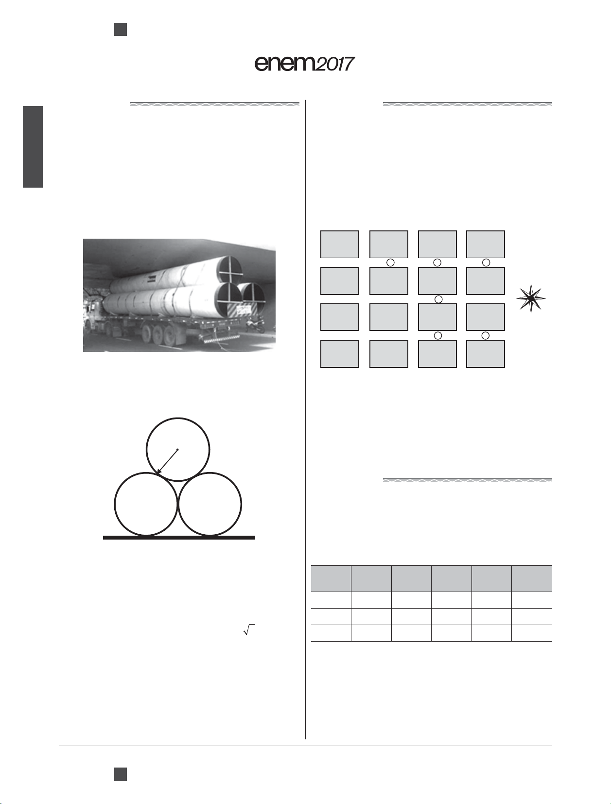 MT - 2º dia | Caderno 6 - CINZA - Página 24 QUESTÃO 160 A manchete demonstra que o transporte de grandes feito em vias urbanas. Caminhão entala em viaduto no Centro viaduto no cruzamento das avenidas Borges de Medeiros e Loureiro da Silva no sentido Centro-Bairro, próximo à Paulo para Porto Alegre e transportava três grandes tubos, conforme ilustrado na foto. Considere que o raio externo de cada cano da imagem seja 0,60 m e que eles estejam em cima de uma carroceria cuja parte superior está a 1,30 m do solo. O desenho representa a vista traseira do empilhamento dos canos. 0,60 m A margem de segurança recomendada para que um veículo passe sob um viaduto é que a altura total do veículo com a carga seja, no mínimo, 0,50 m menor do 3 . Qual deveria ser a altura mínima do viaduto, em metro, A 2,82 B 3,52 C 3,70 D 4,02 E 4,20 QUESTÃO 161 Um menino acaba de se mudar para um novo bairro e deseja ir à padaria. Pediu ajuda a um amigo que lhe forneceu um mapa com pontos numerados, que representam cinco locais de interesse, entre os quais está a padaria. Além disso, o amigo passou as seguintes instruções: a partir do ponto em que você se encontra, representado pela letra X, ande para oeste, vire à direita na primeira rua que encontrar, siga em frente e vire à esquerda na próxima rua. A padaria estará logo a seguir. Rua A Quadra 1 Quadra 2 Quadra 3 Quadra 4 Quadra 5 Quadra 6 Quadra 7 Quadra 8 Quadra 9 Quadra 10 Quadra 11 Quadra 12 Quadra 13 Quadra 14 Quadra 15 Quadra 16 Rua B Rua C Rua D Rua E R u a 1 R u a 2 2 R u a 3 R u a 4 R u a 5 1 X 4 5 3 N S O L A padaria está representada pelo ponto numerado com A 1. B 2. C 3. D 4. E 5. QUESTÃO 162 de inglês. Para avaliar esses alunos, o professor optou por fazer cinco provas. Para que seja aprovado nesse curso, o aluno deverá ter a média aritmética das notas das cinco notas que cada aluno tirou em cada prova. Aluno 1ª Prova 2ª Prova 3ª Prova 4ª Prova 5ª Prova X 5 5 5 10 6 Y 4 9 3 9 5 Z 5 5 8 5 6 Com base nos dados da tabela e nas informações dadas, A apenas o aluno Y. B apenas o aluno Z. C apenas os alunos X e Y. D apenas os alunos X e Z. E os alunos X, Y e Z. *DO0625CI24*
