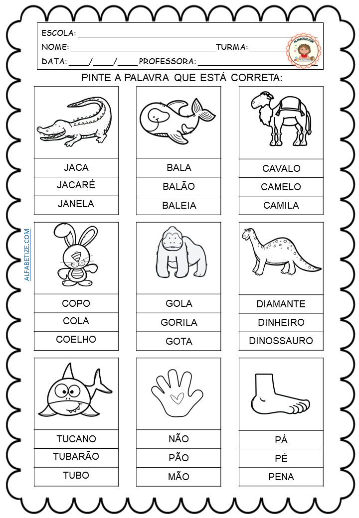 ESCOLA: NOME: TURMA: DATA: / / PROFESSORA: PINTE A PALAVRA QUE ESTÁ CORRETA: JACA BALA CAVALO JACARÉ BALÃO CAMELO JANELA BALEIA CAMILA COPO GOLA DIAMANTE COLA GORILA DINHEIRO COELHO GOTA DINOSSAURO TUCANO NÃO PÁ TUBARÃO PÃO PÉ TUBO MÃO PENA