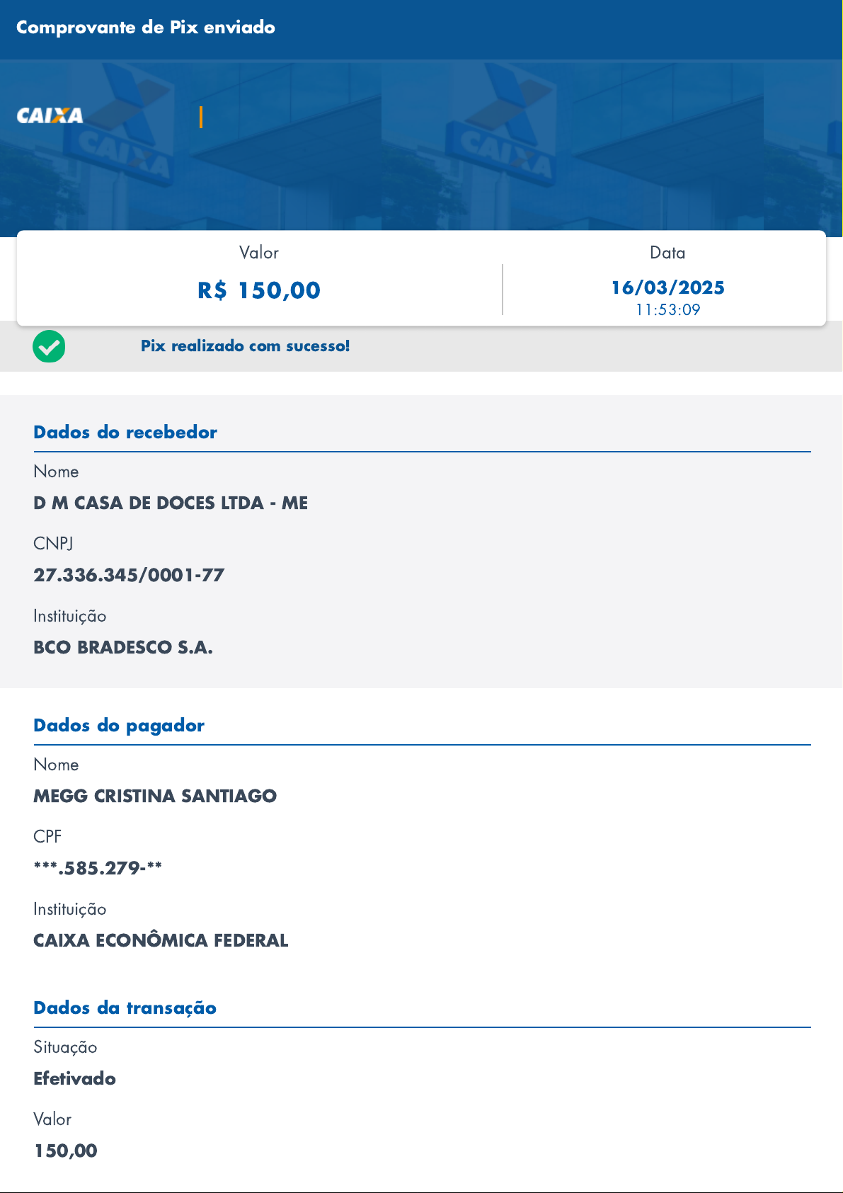Comprovante de Pix enviado Pix realizado com sucesso! Dados do recebedor Nome D M CASA DE DOCES LTDA - ME CNPJ 27.336.345/0001-77 Instituição BCO BRADESCO S.A. Dados do pagador Nome MEGG CRISTINA SANTIAGO CPF ***.585.279-** Instituição CAIXA ECONÔMICA FEDERAL Dados da transação Situação Efetivado Valor 150,00 Valor Data R$ 150,00 16/03/2025 11:53:09 Data/ Hora 16/03/2025 - 11:53:09 ID transação E00360305202503161452cdc744a9144 Código da operação 43886207654 Chave de segurança UK3SLSYER6W01JFW Chave Pix casadosdocesjacarezinho@gmail.com Você poderá consultar futuramente essa e outras transações no item “Minhas Transações”, opção “Consultas - Comprovantes”. Novo Pix Favoritar Compartilhar Voltar Caso tenha dúvidas ou não reconheça esta transação, entre em contato com o Alô CAIXA e informe o ID da Transação presente neste comprovante. Alô CAIXA: 4004 0104 (Capitais e Regiões Metropolitanas) Alô CAIXA: 0800 104 0 104 (Demais regiões) Pessoas com deficiência auditiva: 0800 726 2492 SAC CAIXA: 0800 726 0101 Ouvidoria: 0800 725 7474