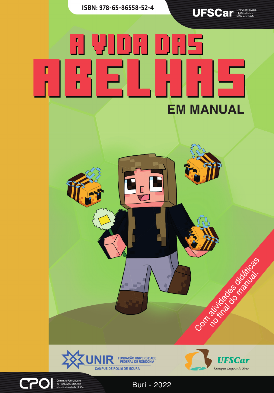 © 2022 by Alessandra de Araújo Silva, Ludimilla Ronqui, Alberto Luciano Carmassi, Anna Paula Quadros Soares, Ilka de Oliveira Mota, Tiago San�. Direitos dessa edição reservados à Comissão Permanente de Publicações Oficiais e Ins�tucionais - CPOI É proibida a reprodução total ou parcial desta obra sem a autorização expressa do Editor. Editoração eletrônica: Tiago San� Revisão Grama�cal e Linguís�ca: Ilka de Oliveira Mota Normalização e Ficha Catalográfica: Marina P. Freitas CRB-08/ 6069 Silva, Alessandra de Araújo. A vida das abelhas em manual. / Alessandra de Araújo Silva ...[et al.]. - Buri, SP : UFSCar/CPOI, 2022. 41 p. ISBN: 978-65-86558-52-4 1. Abelhas. 2. Ecossistema. 3. Educação ambiental. I. Título. Dados internacionais de Catalogação-na-Publicação (CIP) Reitora Ana Beatriz de Oliveira Vice-Reitor Maria de Jesus Dutra dos Reis Buri - 2022 A VIDA DAS ABELHAS EM MANUAL Alessandra de Araújo Silva Ludimilla Ronqui Alberto Luciano Carmassi Anna Paula Quadros Soares Ilka de Oliveira Mota Tiago Santi E PÓS-GRADUAÇÃO EM ÊNCIAS DA NATUREZA CN PROGRAMA DE PÓS-GRADUAÇÃO EM ENSINO DE CIÊNCIAS DA NATUREZA PGECN UFSCar Campus Lagoa do Sino AGRADECIMENTOS Expressamos nosso agradecimento à Universidade Federal de São Carlos e à Pró-Reitoria de Extensão (ProEx) e, em especial, à Comissão Permanente de Publicações Oficiais e Institucionais (CPOI) pelo suporte na publicação deste material. Finalmente agradecemos ao professor Alberto Luciano Carmassi pela valorosa revisão técnica. SUMÁRIO 1. Apresentação ........................................................ 5 2. Estrutura física das abelhas .................................. 9 3. Tipos de moradia das abelhas ............................. 11 4. Abelhas nativas ....................................................14 5. Abelhas africanizadas ou europeias ................... 18 6. O que aconteceria com o planeta se as abelhas desaparecessem? .................................................. 22 7. Criação de abelhas – os apiários ....................... 25 8. O que podemos fazer para preservar nossas abelhas? ................................................................. 27 9. Atividades didático-pedagógicas ........................ 29 10. Mini-glossário das abelhas ............................... 37 11. Equipe de trabalho ............................................ 39 Referências ............................................................. 40Referências ............................................................. 40Referências ............................................................. 40Referências ............................................................. 40Referências ............................................................. 40Referências ............................................................. 40 APRESENTAÇÃO É indiscutível a importância das abelhas para o nosso planeta, em especial porque elas atuam na manutenção, no equilíbrio e na preservação das plantas e, por conseguinte, do meio ambiente. Com a degradação do meio ambiente (poluição, desmatamento, emissão de gases de efeito estufa, uso de agrotóxicos, falta de conhecimento da real importância dos insetos para a natureza, entre outros), o planeta tem sofrido impactos socioambientais consequentes que afetam negativamente a fauna e flora. Uma das consequências negativas dessas ações do homem no meio ambiente é o desaparecimento de várias espécies vitais para o ecossistema, como é o caso dos agentes polinizadores, comumente denominados abelhas. Como este manual traz uma abordagem sobre a vida das abelhas a partir de uma visada didático-pedagógica, seu objetivo é atuar como uma ferramenta na disseminação da Educação Ambiental com vistas à preservação destes agentes polinizadores. A despeito do aparato teórico, o manual foi produzido a partir de um conjunto representativo de obras que se debruçaram sobre o tema das abelhas e sua importância para o ecossistema. As figuras que o compõem foram baseadas no jogo digital Minecraft versão 1.16 em virtude de sua estética peculiar: ele é feito de blocos cúbicos que podem ser colocados em diversos lugares para construir estruturas. Essa escolha foi motivada tanto pela estética atrativa (o formato geométrico e as cores vivas das imagens) quanto pelo fato de ser um jogo que compreende um vasto público, desde o infanto-juvenil até o adulto. 5 No final do material, o(a)s leitore(a)s poderão ainda contar com um conjunto de atividades didáticas produzidas com base no conteúdo apresentado e um mini-glossário com os principais termos nele presentes. O objetivo principal é contribuir para o maior engajamento dos nossos leitores e leitoras no tema proposto. Para que o(s)s leitore(a)s conheçam o(a)s pesquisadore(a)s que atuaram na idealização e confecção deste manual, preparamos uma página intitulada “Equipe de trabalho” com as fotos e algumas de suas informações acadêmico-profissionais. Finalmente, a presente publicação é destinada não somente aos estudantes de Biologia da Conservação, mas também a todas as pessoas interessadas no tema da preservação do meio ambiente, especialmente aos professores do ensino fundamental e às crianças em fase de alfabetização e adolescentes. Daí a escolha por uma linguagem simples, clara e didática. Este manual foi feito com muito entusiasmo, empenho e dedicação. Esperamos que ele seja uma ferramenta produtiva na disseminação da Educação Ambiental com foco na temática das abelhas. Ótima leitura! A equipe Buri (SP), abril de 2022Buri (SP), abril de 2022 Galerinha, divirta-se com o nosso manual! 6 7 Antes de responder a essa pergunta, vamos conhecer um pouquinho sobre a vida das abelhas. O que aconteceria com o planeta se as abelhas desaparecessem ? Existem cerca de 20.000 espécies de abelhas No Brasil há cerca de 400 espécies nativas Nem todas as abel