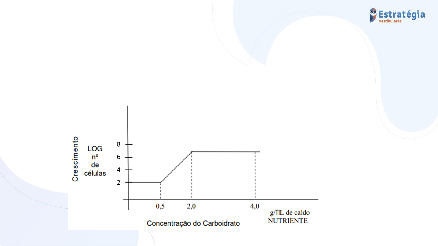 Prof. Bruna Klassa @profbrunaklassa (UFOP/2009) A produção de álcool pelas leveduras, como produto final do metabolismo, é uma característica microbiana que vem sendo explorada pelas indústrias interessadas nesse produto. Observe a curva de crescimento hipotética de uma espécie de levedura em diferentes concentrações de um novo carboidrato em experiência inédita. Prof. Bruna Klassa @profbrunaklassa (UFOP/2009) Essa curva é obtida quando se estuda o crescimento de uma espécie microbiana em presença de seus fatores de crescimento, incluindo o novo carboidrato, que, por conseguinte auxilia na avaliação sobre os metabólitos produzidos. Sabendo-se que os demais fatores foram mantidos constantes no experimento, a observação do gráfico nos permite fazer as seguintes afirmações, exceto: a) Nas concentrações de 0,5 a 2,0 µg/mL de caldo nutriente, a cultura apresenta um índice de crescimento mais acelerado. b) Há correlação entre concentração do carboidrato, número de célula microbiana e produção de álcool na faixa de 0,5 a 2,0 µg/mL de caldo nutriente. c) A partir de 2,0 µg/mL de caldo nutriente, o metabolismo está estável e, a cada momento, a cultura produz mais álcool. d) Se for usada a concentração de 8,0 µg/mL de caldo nutriente, certamente não haverá aumento significativo no crescimento. Slide 107 Slide 108