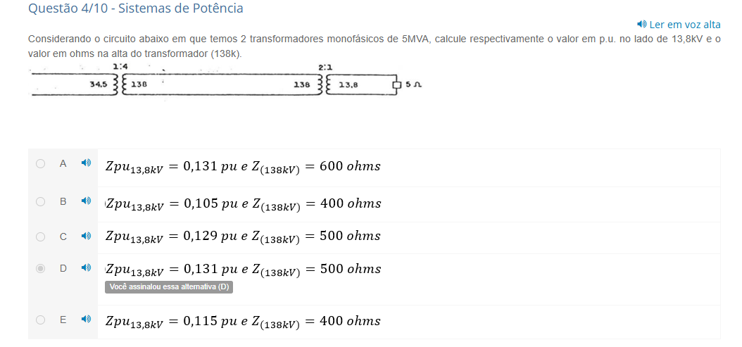 Questão 4/10 - Sistemas de Potência Ler em voz alta Considerando circuito abaixo em que temos 2 transformadores monofásicos de 5MVA, calcule respectivamente o valor em p.u. no lado de e o valor em ohms na alta do transformador (138k). 1:4 2:1 34.5 138 138 13.8 5 A = = 600 ohms B = 0,105 e Z(138kV) = 400 ohms C = = 500 ohms = = 500 ohms Você assinalou essa E = 0,115 pu e Z(138kV) = 400 ohms