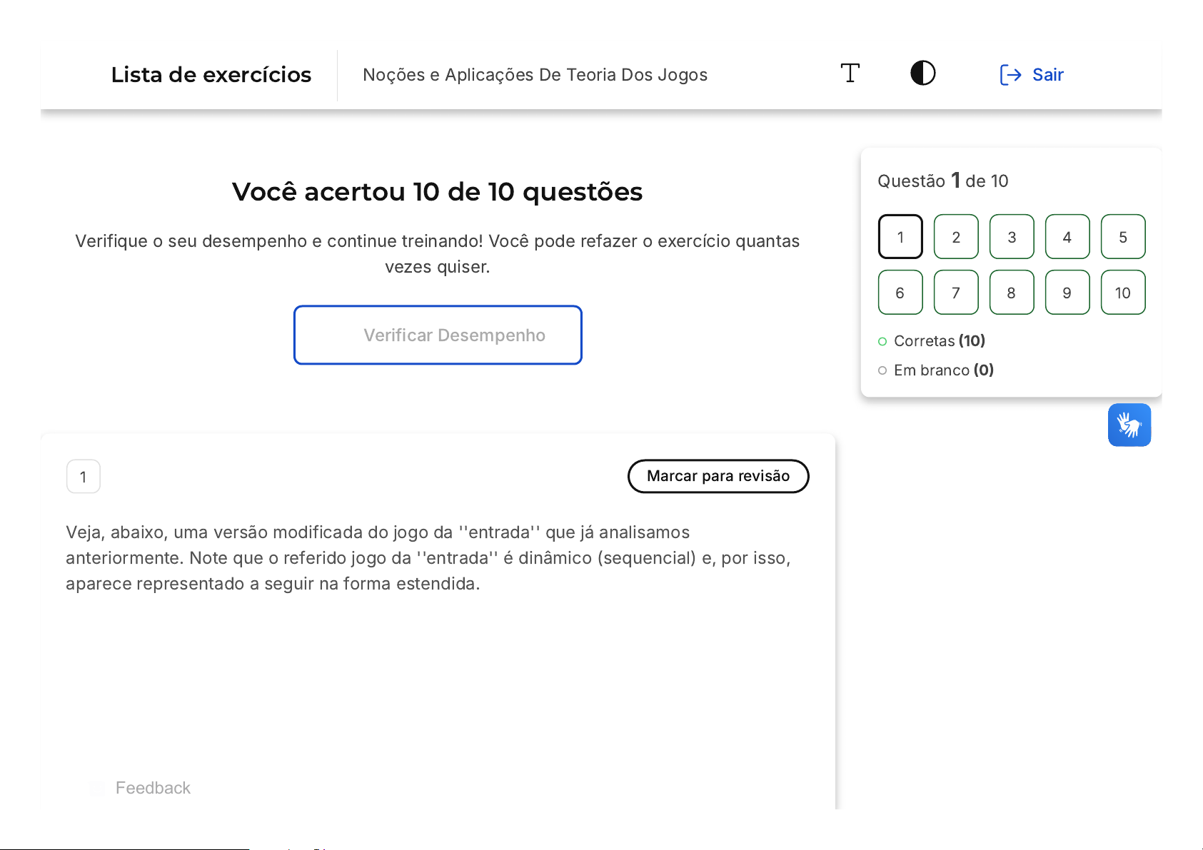 Você acertou 10 de 10 questões Verifique o seu desempenho e continue treinando! Você pode refazer o exercício quantas vezes quiser. Verificar Desempenho 1 Marcar para revisão Veja, abaixo, uma versão modificada do jogo da ''entrada'' que já analisamos anteriormente. Note que o referido jogo da ''entrada'' é dinâmico (sequencial) e, por isso, aparece representado a seguir na forma estendida. Questão 1 de 10 Corretas (10) Em branco (0) 1 2 3 4 5 6 7 8 9 10 Lista de exercícios Noções e Aplicações De Teoria Dos Jogos Sair Feedback A B C D E Fonte: Bruno Ottoni Agora, aplique o método da indução reversa e encontre a solução do jogo da ''entrada'' representado acima. Qual a solução encontrada? A solução do jogo é dada pela combinação de estratégias: (Entra;Luta). A solução do jogo é dada pela combinação de estratégias: (Não Entra;Luta). A solução do jogo é dada pela combinação de estratégias: (Entra;Acomoda). A solução do jogo é dada pela combinação de estratégias: (Não Entra;Acomoda). A solução do jogo é dada pela combinação de estratégias: (Não Entra;Entra). Resposta correta Parabéns, você selecionou a alternativa correta. Confira o gabarito comentado! Gabarito Comentado O método que permite encontrar a solução de um jogo dinâmico (sequencial) é o da indução retroativa, no qual precisamos analisar o jogo de trás para frente, a partir da escolha do último jogador e retroceder gradativamente até avaliar a decisão do primeiro jogador. Primeiro, iremos analisar o processo de escolha do último jogador que é a empresa Dominante. Essa empresa deve decidir se Luta ou Acomoda. Note que a escolha por Luta resulta em recompensa de 7 para a empresa Dominante. Porém, optar por Acomoda gera uma recompensa de apenas 2 para a empresa Dominante. Logo, caso a Dominante seja chamada a jogar (isso acontece quando a Desafiante opta por Entra) ela irá escolher Luta (porque fazer isso resulta em maior recompensa para ela). Segundo, vamos analisar a tomada de decisão do primeiro jogador que é a Desafiante. Essa empresa deve escolher se Entra ou Não Entra. Só que como o jogo é de informação completa, a Desafiante sabe que se opta por Entra, então a Dominante vai escolher Luta. Isso ocorre porque, como o jogo é de informação completa, então a Desafiante conhece as ações, e as recompensas, da Dominante. Logo, a Desafiante consegue perceber que, caso ela opte por Entra, a Dominante vai querer fazer Luta. Isso quer dizer que a Desafiante reconhece que a recompensa dela será igual a -1, caso decida fazer Entra. Porém, se a Desafiante escolhe Não Entra então o jogo acaba e ela recebe uma recompensa igual a 0. Como 0>-1, sabemos que a Desafiante vai optar por Não Entra. Agora encerramos a aplicação do método de indução retroativa, visto que já analisamos, de trás para frente, a tomada de decisão dos dois jogadores do jogo da ''entrada''. Esse método de indução retroativa permite identificar que a solução do jogo da ¿entrada¿ é dada pela combinação de estratégias: (Não Entra;Luta). Portanto, a opção correta é ''b''. Uma contribuição A B C importante dessa questão 19 é mostrar que algumas ameaças são críveis. No texto vimos uma versão do jogo da ''entrada'', em que a Dominante ameaçava jogar Luta caso a Desafiante optasse por Entra. Porém, lá no texto essa ameaça não era crível. Isso ocorria porque caso a Desafiante de fato optasse por Entra a Dominante não teria incentivo em levar a cabo sua ameaça de fazer Luta. É que lá no texto a recompensa da Dominante seria maior optando por Acomoda do que fazendo Luta. Então ela nunca realmente faria Luta e consequentemente uma eventual ameaça de fazê-lo não seria crível. Agora, vimos uma versão do jogo da ''entrada'' em que a ameaça da Dominante de optar por Luta é crível. Isso ocorre porque, na versão do jogo da ''entrada'' que vimos agora, de fato a Dominante tem incentivo em levar adiante sua ameaça de jogar Luta, caso a Desafiante opte por Entra. Como consequência dessa ameaça crível, a Desafiante acaba optando por Não Entra. 2 Marcar para revisão Que método pode ser utilizado para encontrar a solução de um jogo dinâmico (sequencial)? Seleção do resultado estático Escolha da melhor resposta progressiva Indução progressiva D E Mínimos quadrados ordinários Indução retroativa Resposta correta Parabéns, você selecionou a alternativa correta. Confira o gabarito comentado! Gabarito Comentado A indução retroativa é o método correto para encontrar a solução de um jogo dinâmico (sequencial). Este método é usado em teoria dos jogos e envolve a resolução do jogo do fim para o início. Em outras palavras, começamos considerando as últimas ações que podem ser tomadas no jogo, resolvemos o que seria a melhor ação nesse ponto e, em seguida, usamos essa informação para determinar a melhor ação no passo anterior, e assim por diante, até chegarmos ao início do jogo. Dessa forma, a indução retroativa permite que os jogadores antecipem as ações futuras e tomem as melhores decisões no presente. 3 Marcar para revisão Uma empresa de tecnologia e uma de software estão considerando formar uma parceria. Se ambas concordarem, a parceria trará grandes benefícios. Se apenas uma estiver disposta, a parceria falhará. Se nenhuma concordar, perderão vantagens competitivas. A B C D E Qual é o equilíbrio mais provável segundo a Teoria dos Jogos? Apenas uma empresa concorda com a parceria. Ambas as empresas concordam com a parceria. Nenhuma das empresas concorda com a parceria. As empresas decidem competir em vez de colaborar. As empresas formam parcerias com terceiros. Resposta correta Parabéns, você selecionou a alternativa correta. Confira o gabarito comentado! Gabarito Comentado De acordo com a Teoria dos Jogos, quando há um benefício mútuo claro e significativo de uma ação conjunta, é provável que ambas a